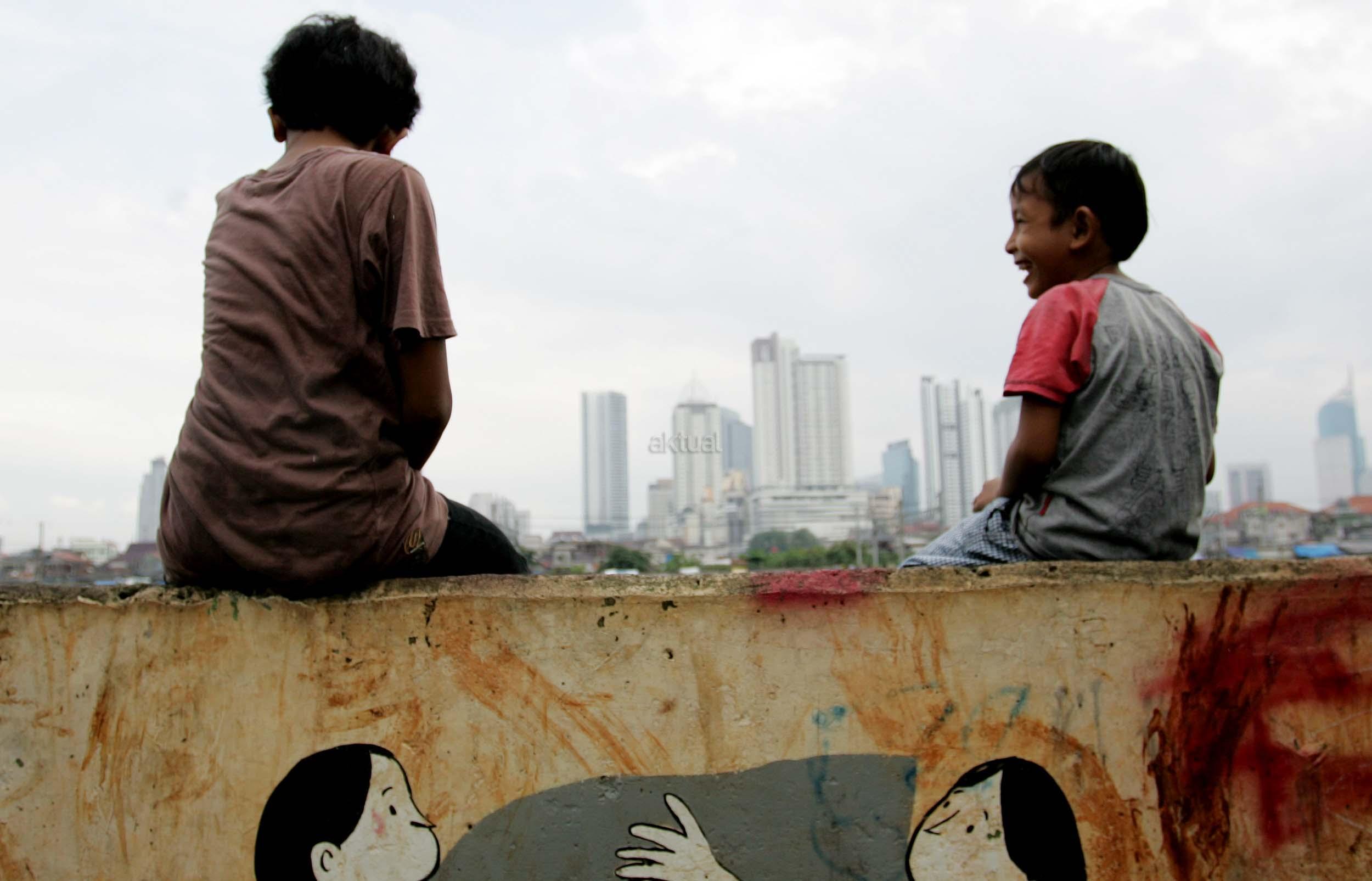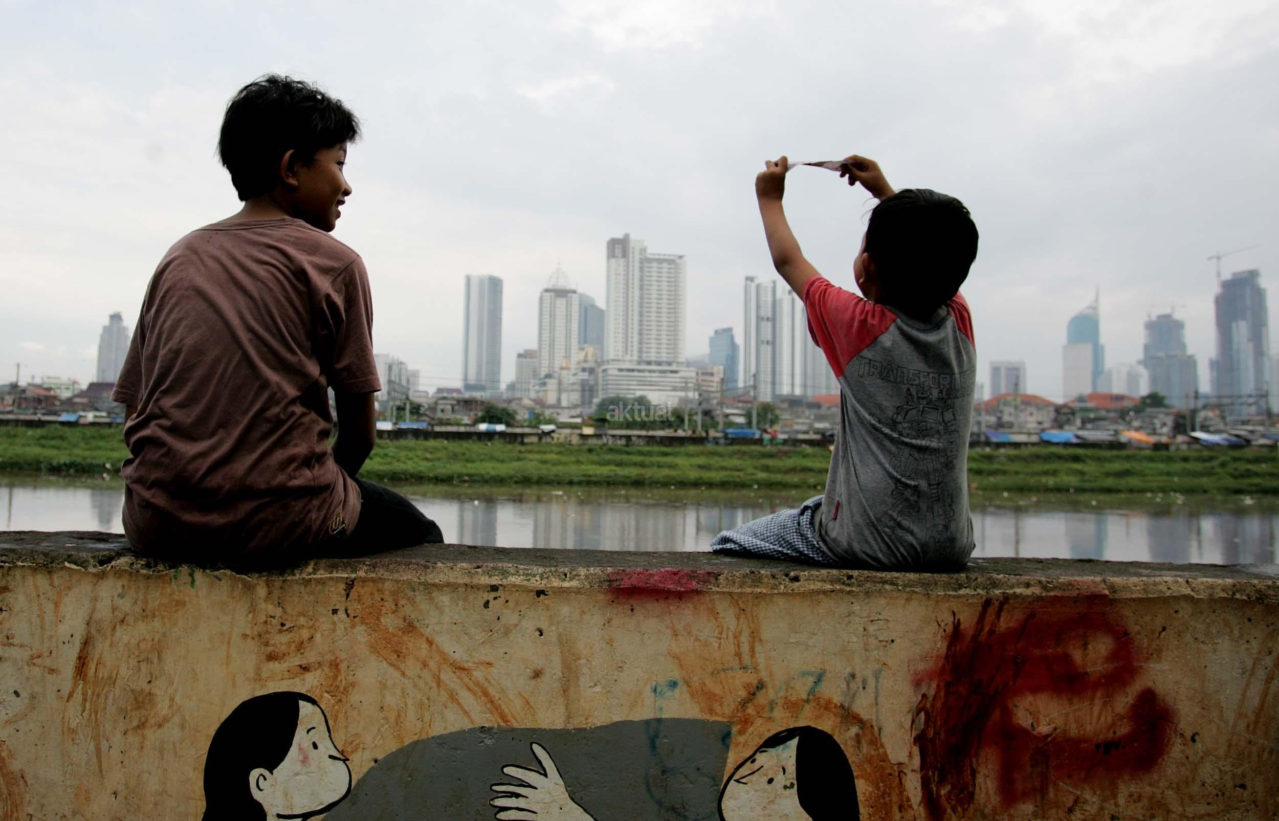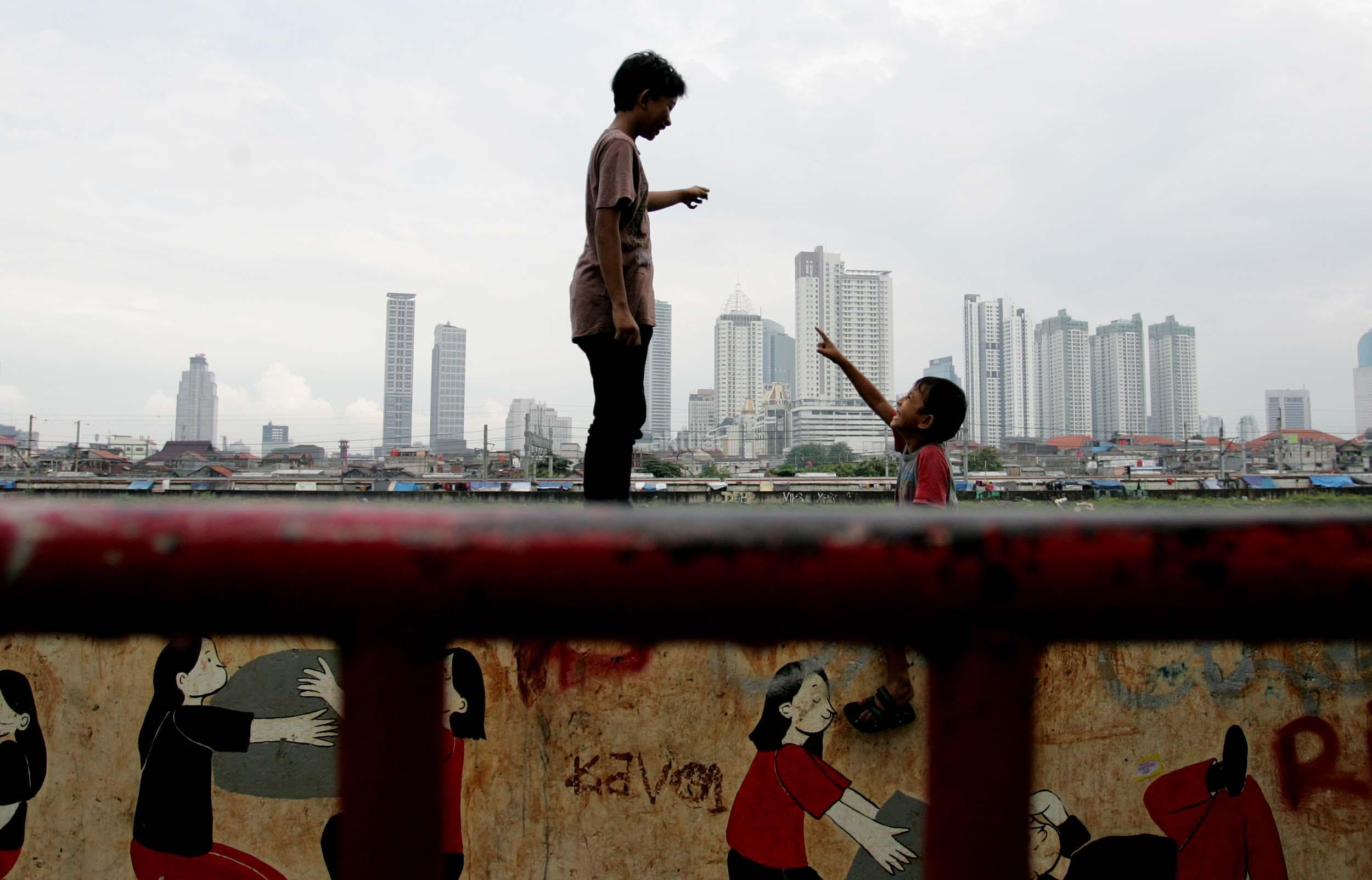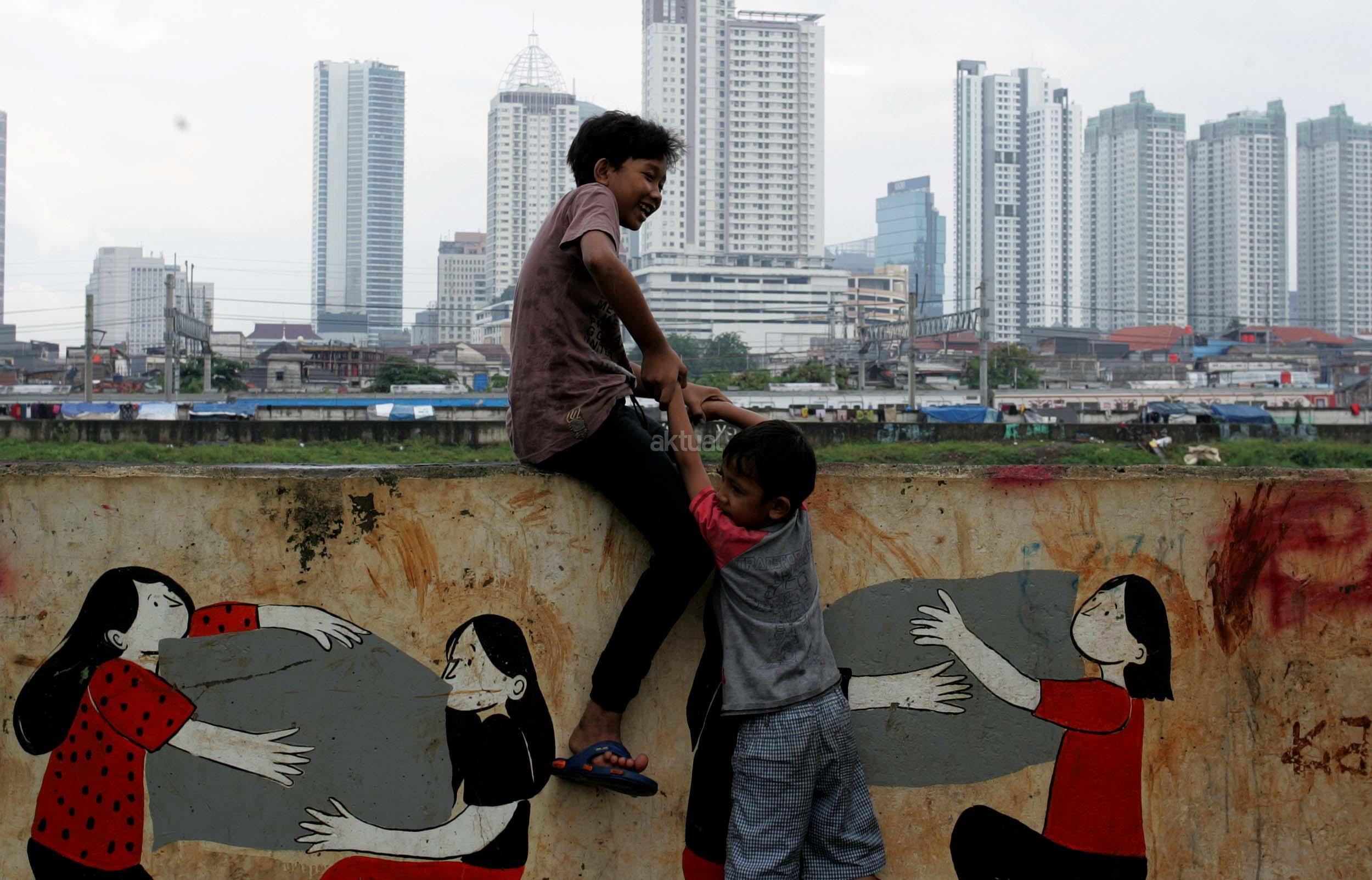 Dua orang anak saat bermain di tembok pembatas kali ciliwung dengan latar hutan beton di kawasan Tanah Abang, Jakarta, Kamis (17/11/2016). Pemenuhan Ruang Terbuka Hijau (RTH) di ibukota dari 30 persen yang harus disediakan, Pemprov DKI baru memenuhinya 9,5 persen dari total luas wilayah. AKTUAL/Munzir