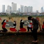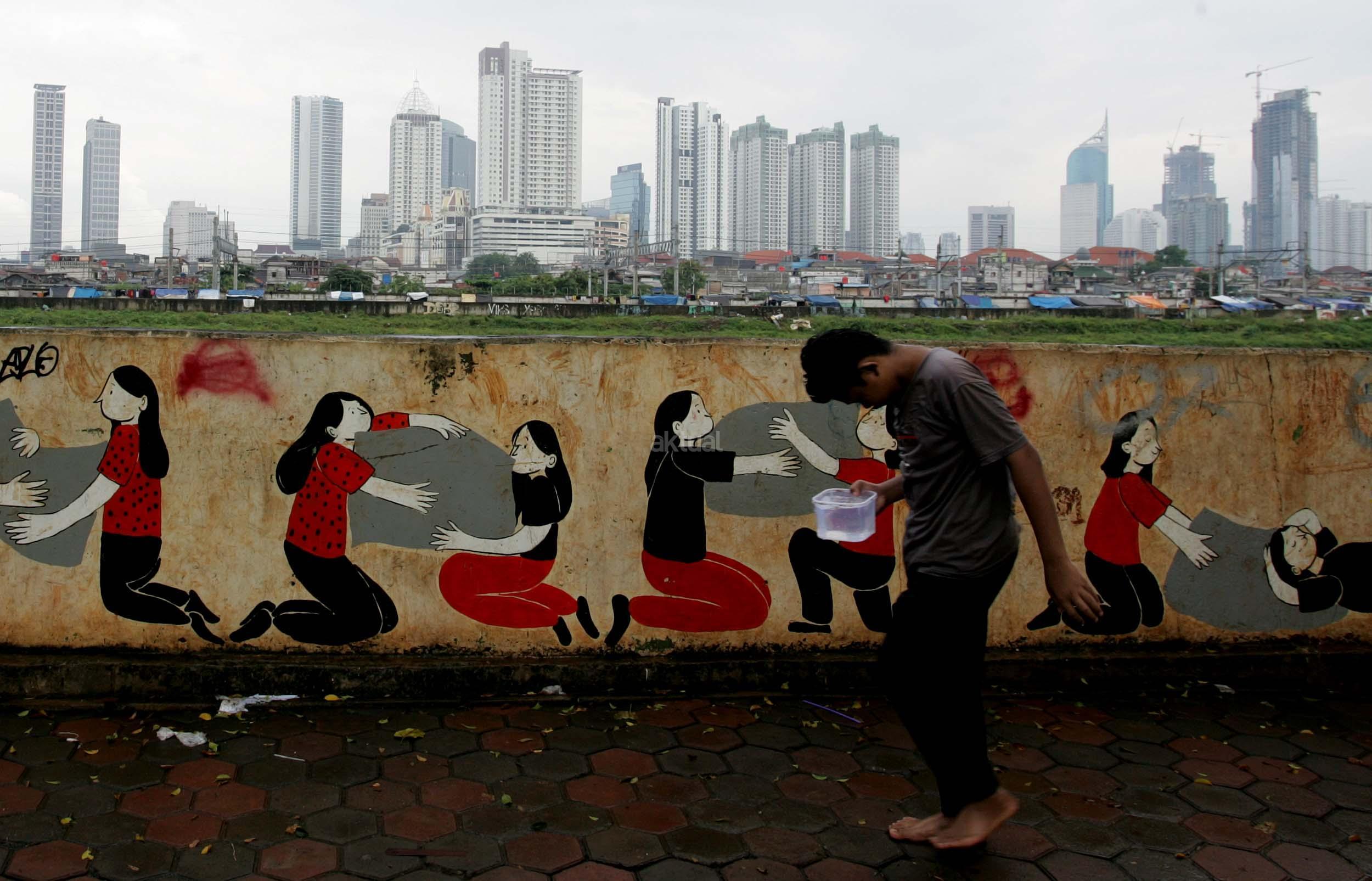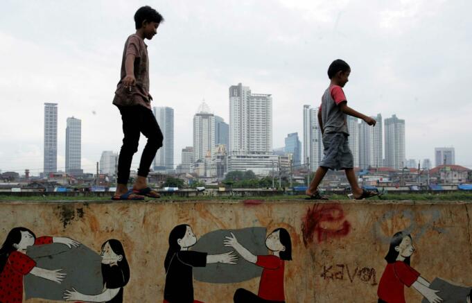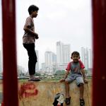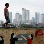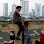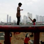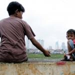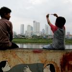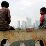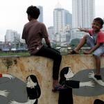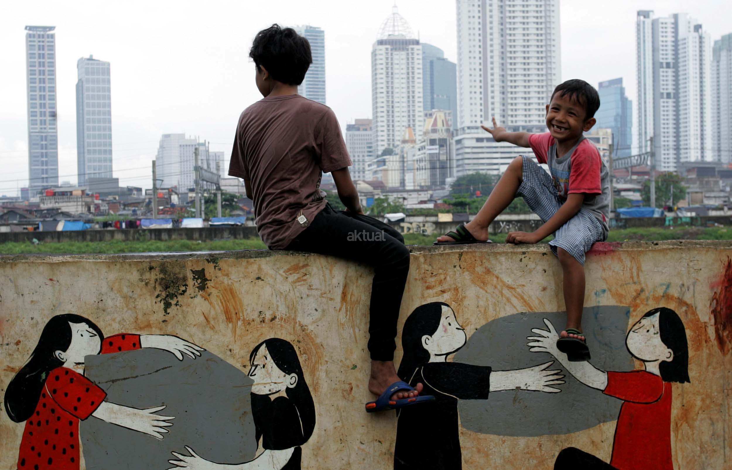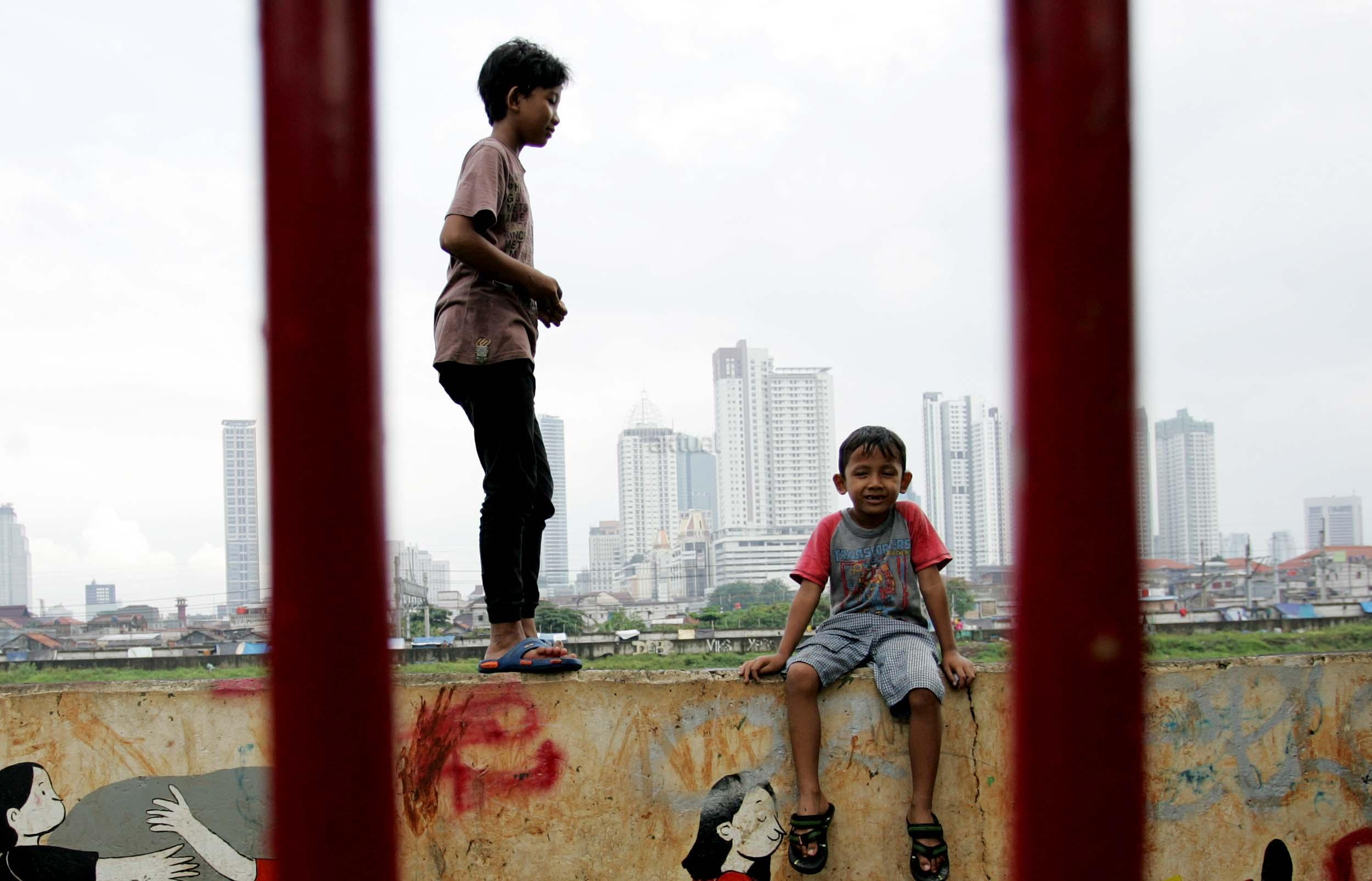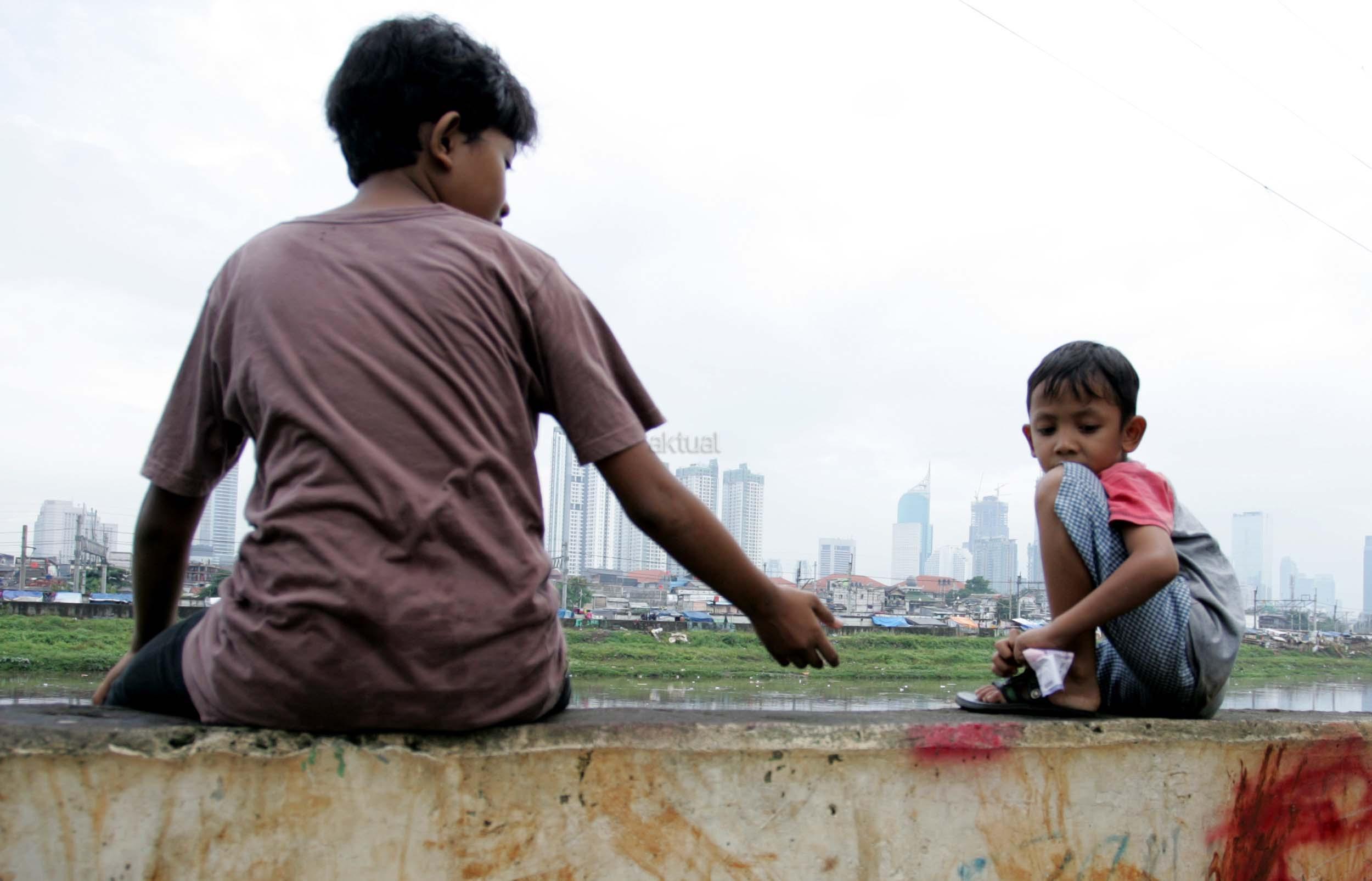 Dua orang anak saat bermain di tembok pembatas kali ciliwung dengan latar hutan beton di kawasan Tanah Abang, Jakarta, Kamis (17/11/2016). Pemenuhan Ruang Terbuka Hijau (RTH) di ibukota dari 30 persen yang harus disediakan, Pemprov DKI baru memenuhinya 9,5 persen dari total luas wilayah. AKTUAL/Munzir