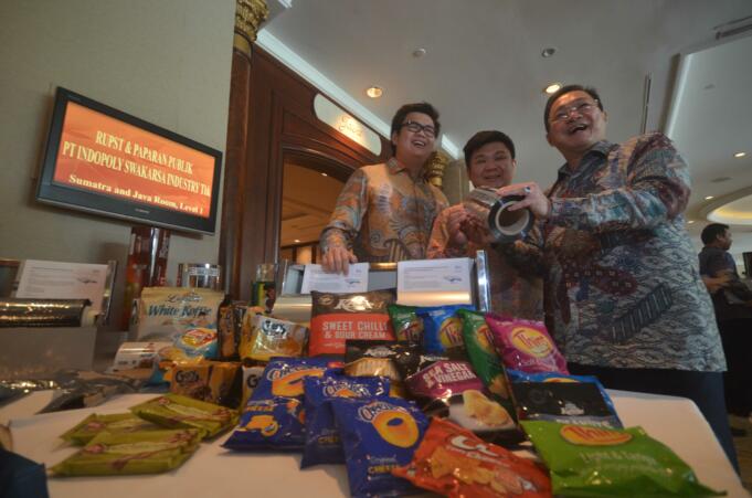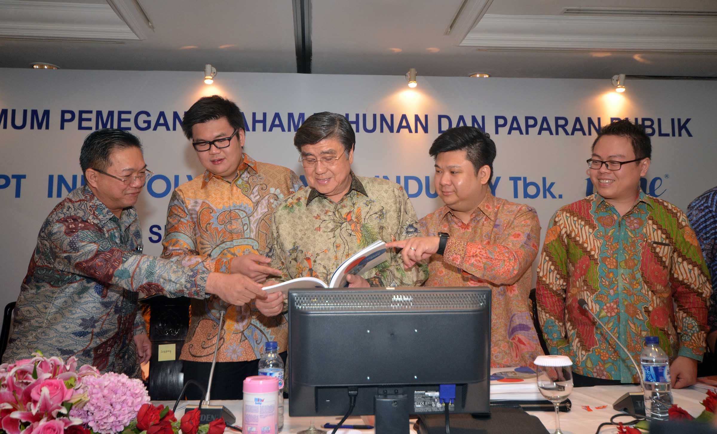 Presiden Direktur PT Indopoly Swakarsa Industry Tbk Hendry Halim (kanan) bersama Wakil Presiden Direktur Jefferey Halim dan Direktur, Alexander Bustami(tengah)memperlihatkan produk perseroan usai menggelar RUPS di Jakarta, Selasa (28/6). PT Indopoly Swakarsa Industry Tbk membukukan pertumbuhan laba 351% di Kuartal 1 2016 dibandingkan kuartal 1 2015. untuk melanjutkan pertumbuhan berkelanjutan, perseroan akan melakukan investasi atas 2 mesin metalizing berkapasitas masing-masing 9.000 ton yang ditempatkan di Purwakarta dan Cina