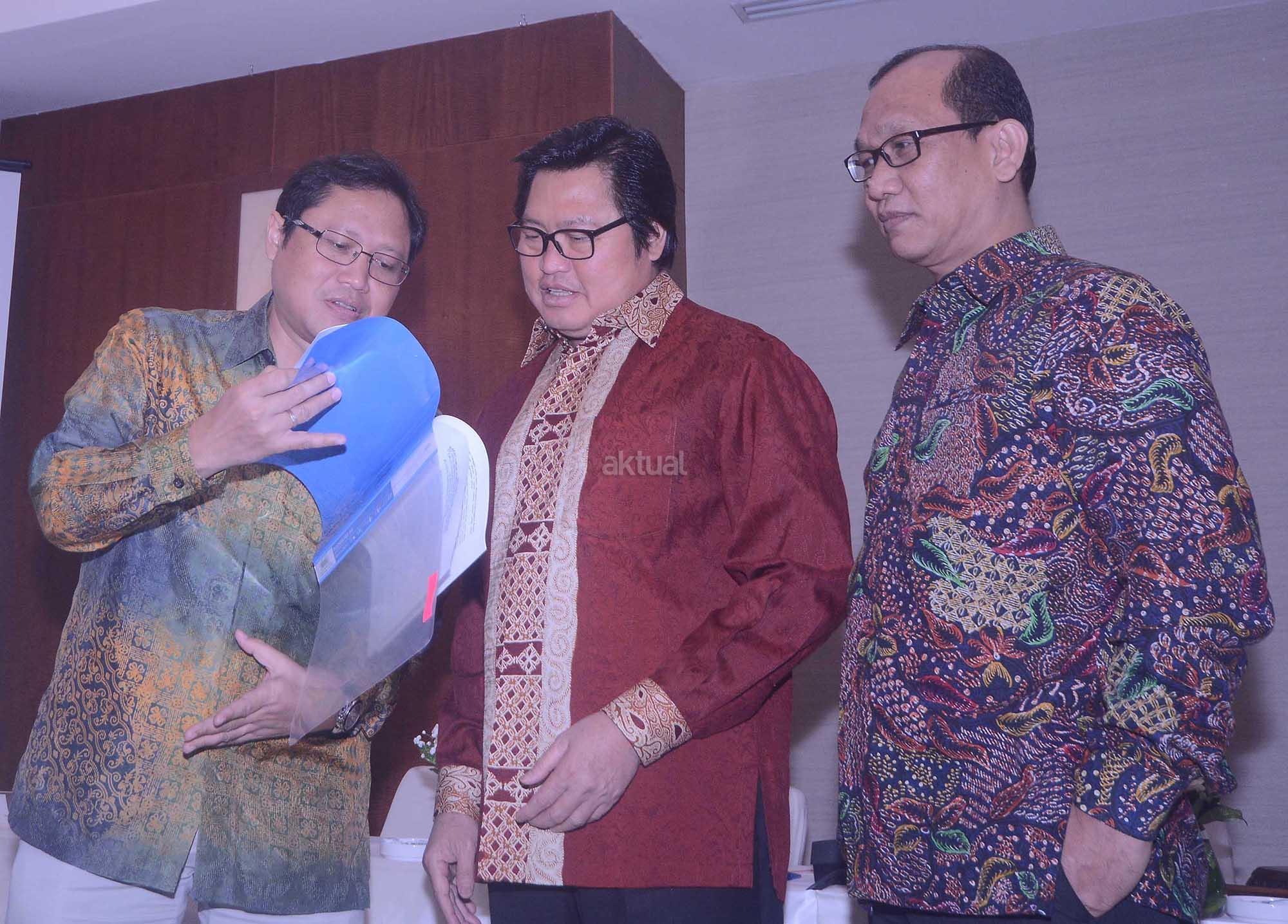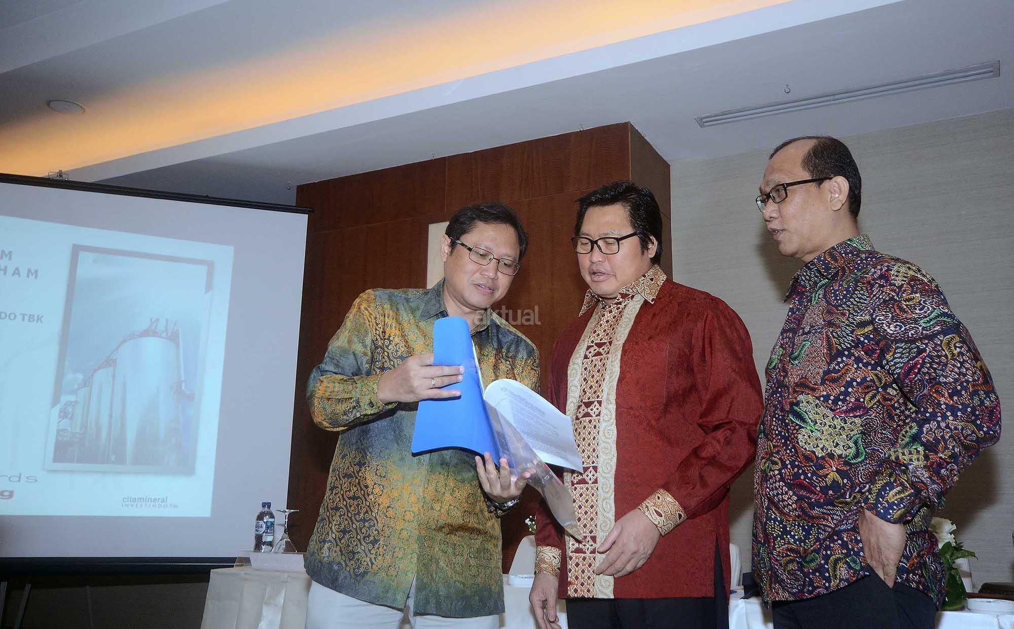 Direktur Utama PT Cita Mineral Investindo (CITA), Liem Hok Seng (tengah) berbincang dengan Direktur, Robby Irfan Rafianto (kiri) dan Direktur Independen, Yusak Lumba Pardede (kanan) seusai RUPSLB di Jakarta, Kamis (17/11). Emiten yang bergerak dalam bidang pertambangan bauksit dan produsen alumina tersebut berhasil meraih pendapatan usaha Rp 255,97 miliar di kuartal III 2016 dibanding akhir September 2015 yang tidak mencatatkan pendapatan. CITA melaksanakan RUPSLB antara lain untuk pemberian corporate guarantee kepada entitas asosiasi PT Well Harvest Winning Alumina Refinery (WHW) yang memiliki pabrik pengolahan dan pemurnian bijih bauksit menjadi Alummina SGA pertama di Indonesia. WHW merupakan perusahaan patungan antara CITA (30%) dengan China Hongqiao Group Limited dari Tiongkok (56%), Winning Investment (HK) Company Ltd (9%) dan Shandong Weiqiao Aluminium and Electricity Co. Ltd (5%).Salah satu penunjang kenaikan kinerja CITA berasal dari beroperasinya Pabrik Pengolahan dan Pemurnian Bauksit menjadi Smelter Grade Alumina (SGA) Alumina milik Entitas Asosiasi WHW) sejak pertengahan 2016 lalu. AKTUAL/Eko S Hilman