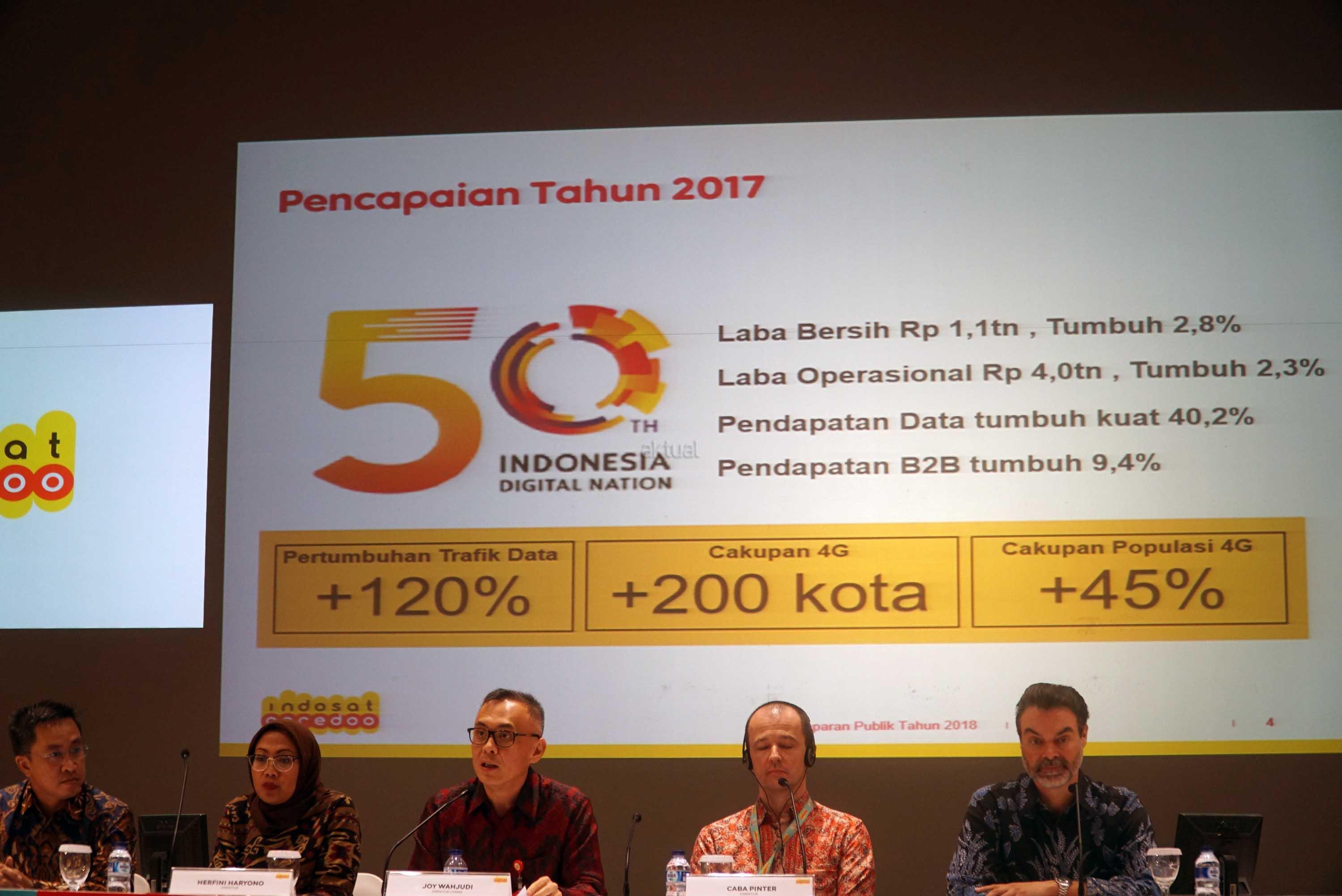 Direktur Utama PT Indosat Tbk, Joy Wahjudi (tengah) didampingi jajaran direksi lainnnya menjelaskan kinerja perseroan seusai menyelenggarakan Rapat Umum Pemegang Saham Tahunan (RUPST) di Jakarta, Rabu (9/5). RUPST memutuskan beberapa hal, antara lain menyetujui laporan tahunan dan mengesahkan laporan keuangan perseroan tahun buku 2017 serta menyetujui penggunaan laba bersih perseroan untuk deviden sebesar Rp 73,- per saham atau setara dengan 35% Rasio pembayaran dividen (RPD), dan menyetujui penetapan remunerasi Dewan Komisaris perseroan untuk tahun 2018.Rapat juga mengangakat dua Direktur baru yakni Haroon Shahul Hameed serta Irsyad Sahroni. AKTUAL/Eko S Hilman