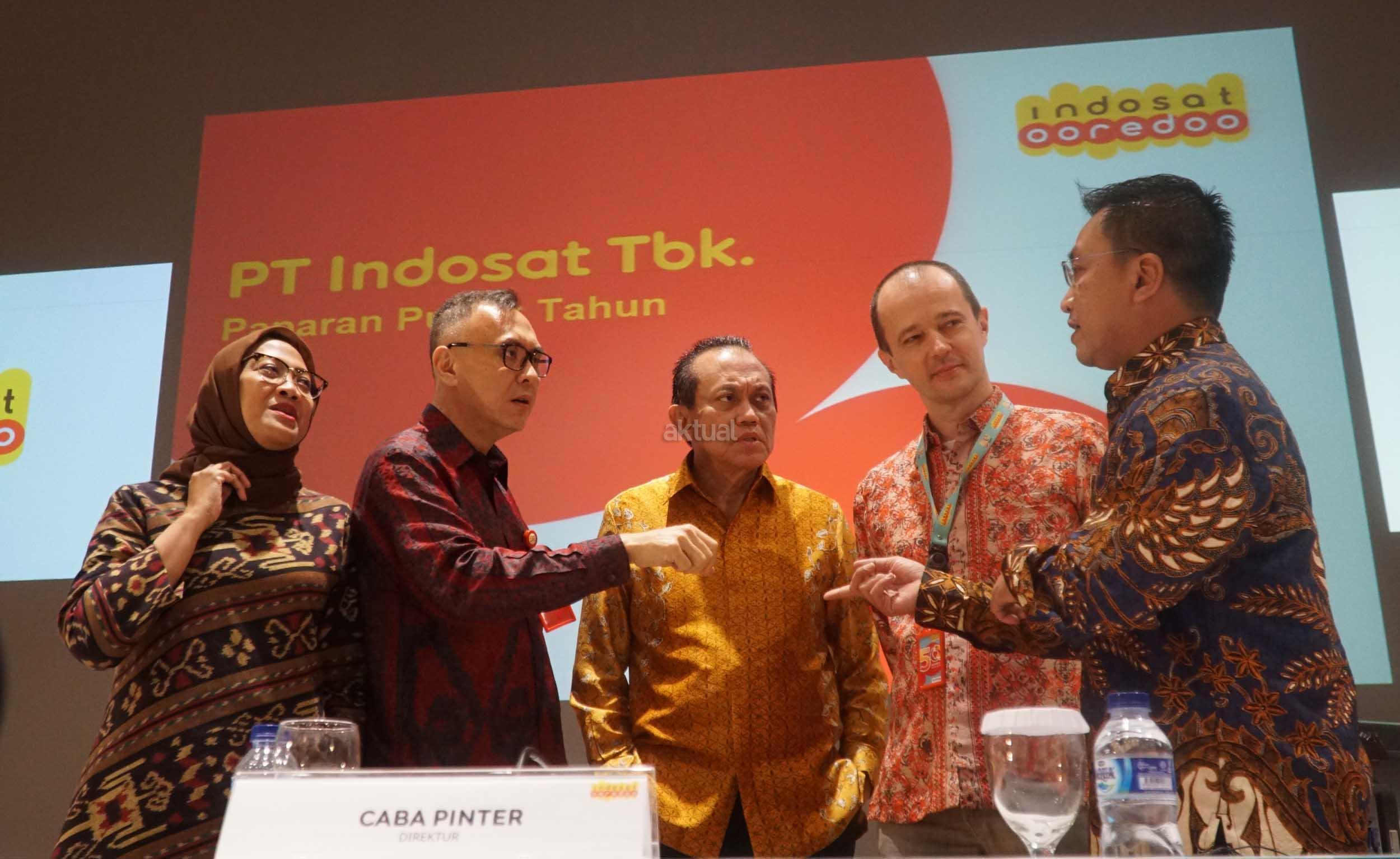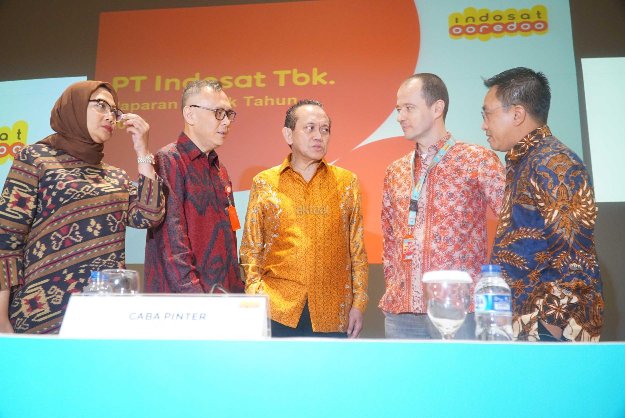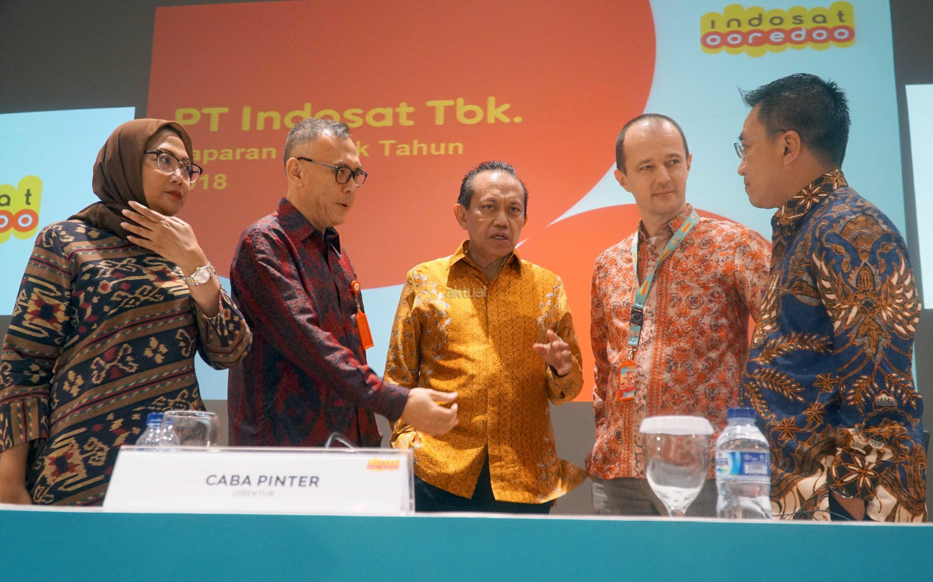 (dari kiri ke kanan) Direktur PT Indosat Tbk, Herfini Haryono, Direktur Utama, Joy Wahjudi, Komisaris, Chris Kanter,Direktur, Caba Pinter,serta Direktur,Irsyad Sahroni berbincang seusai menyelenggarakan Rapat Umum Pemegang Saham Tahunan (RUPST) di Jakarta, Rabu (9/5). RUPST memutuskan beberapa hal, antara lain menyetujui laporan tahunan dan mengesahkan laporan keuangan perseroan tahun buku 2017 serta menyetujui penggunaan laba bersih perseroan untuk deviden sebesar Rp 73,- per saham atau setara dengan 35% Rasio pembayaran dividen (RPD), dan menyetujui penetapan remunerasi Dewan Komisaris perseroan untuk tahun 2018.Rapat juga mengangakat dua Direktur baru yakni Haroon Shahul Hameed serta Irsyad Sahroni. AKTUAL/Eko S Hilman
