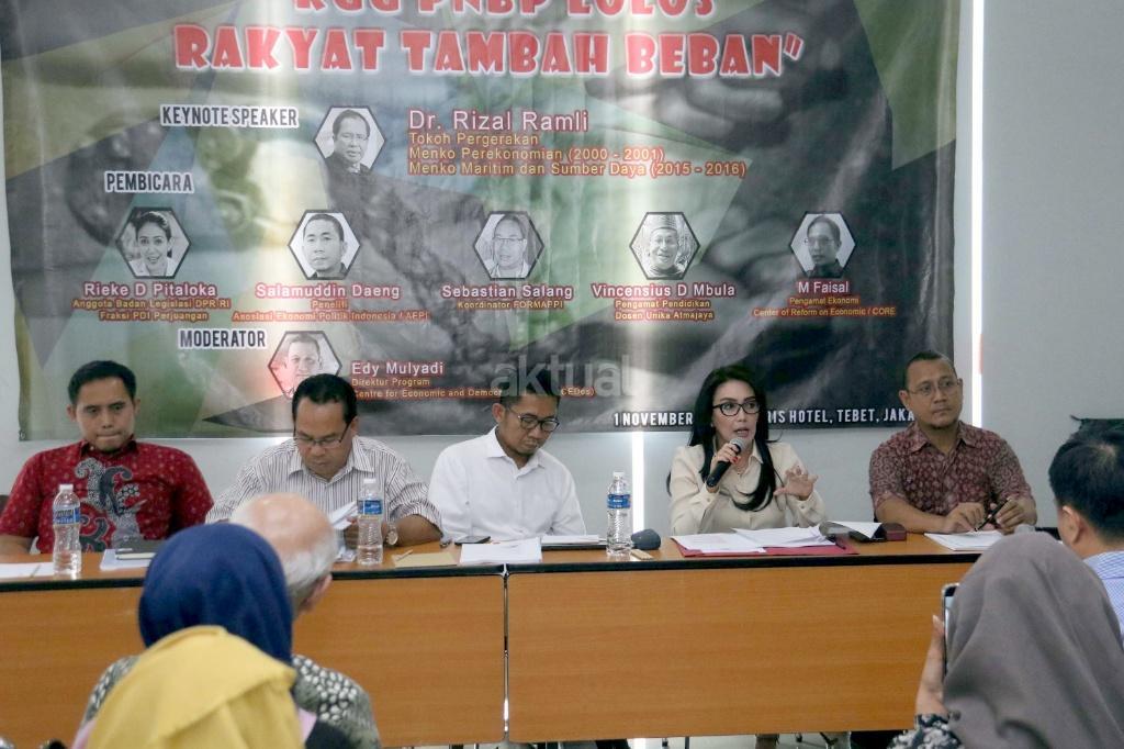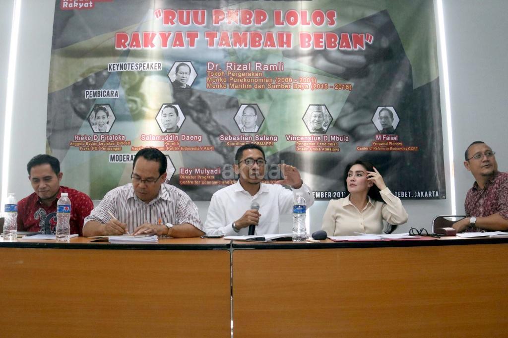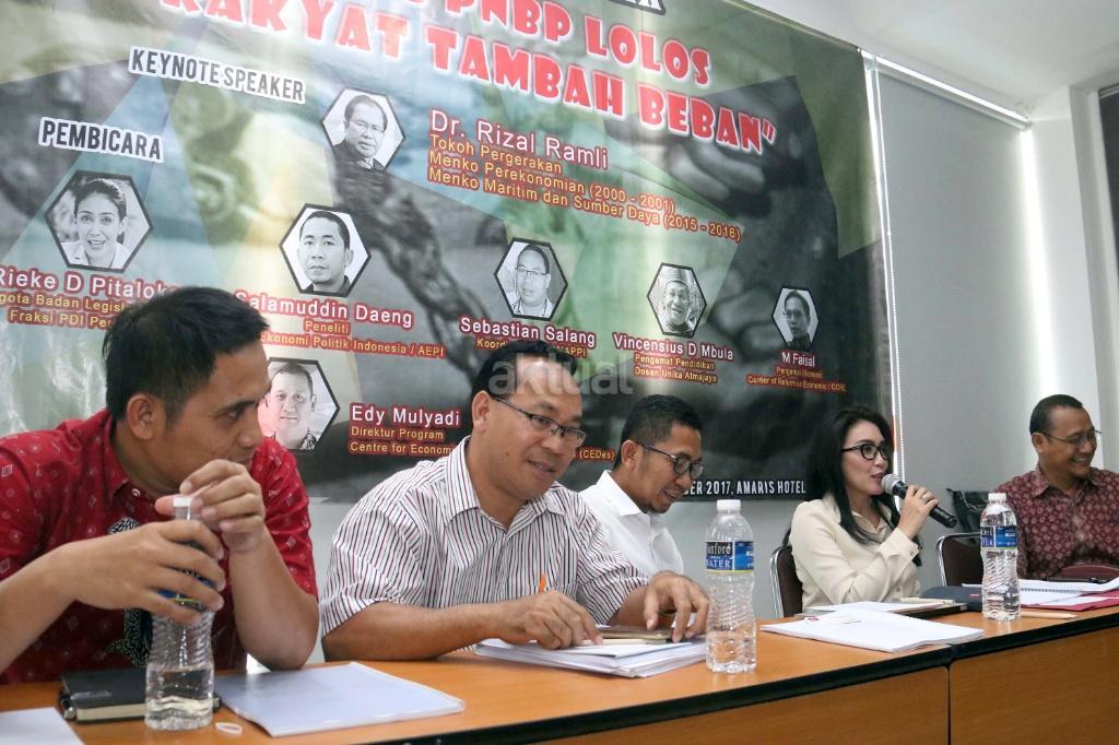 Kiri-kanan ; Pengamat Ekonomi Center of Reform on Economic (Core) M. Faisal, Koordinator Formappi Sebastian Salang, Peneliti Asosiasi Ekonomi Politik Indonesia (AEPI) Salamudin Daeng, Anggota Badan Legislasi DPR RI Fraksi PDI Perjuangan Rieke Diah Pitaloka, Direktur Program for Economic and Democracy Studies (Cedes) Edy Mulyadi saat berdiskusi terkait Pendapatan Negara Bukan Pajak (PNBP) di Jakarta, Rabu (1/11/2017). Diskusi Pendapatan Negara Bukan Pajak (PNBP) diselenggarakan oleh Pergerakan Kedaulatan Rakyat (PKR) dalam tema “RUU PNBP Lolos Rakyat Tambah Beban”. AKTUAL/Munzir