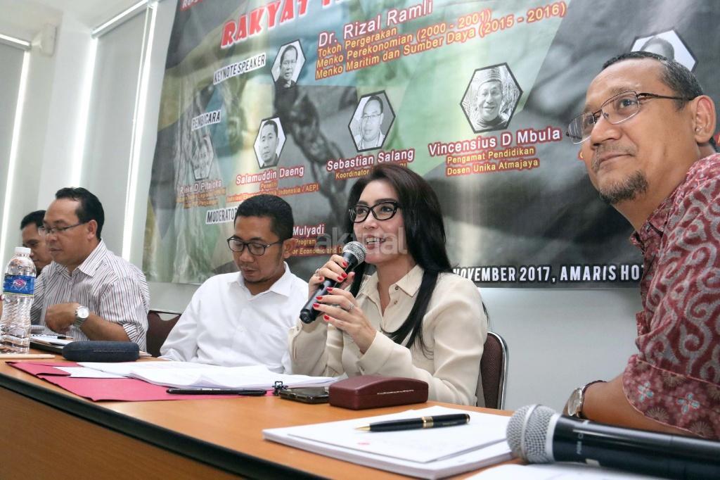 Kiri-kanan ; Pengamat Ekonomi Center of Reform on Economic (Core) M. Faisal, Koordinator Formappi Sebastian Salang, Peneliti Asosiasi Ekonomi Politik Indonesia (AEPI) Salamudin Daeng, Anggota Badan Legislasi DPR RI Fraksi PDI Perjuangan Rieke Diah Pitaloka, Direktur Program for Economic and Democracy Studies (Cedes) Edy Mulyadi saat berdiskusi terkait Pendapatan Negara Bukan Pajak (PNBP) di Jakarta, Rabu (1/11/2017). Diskusi Pendapatan Negara Bukan Pajak (PNBP) diselenggarakan oleh Pergerakan Kedaulatan Rakyat (PKR) dalam tema "RUU PNBP Lolos Rakyat Tambah Beban". AKTUAL/Munzir
