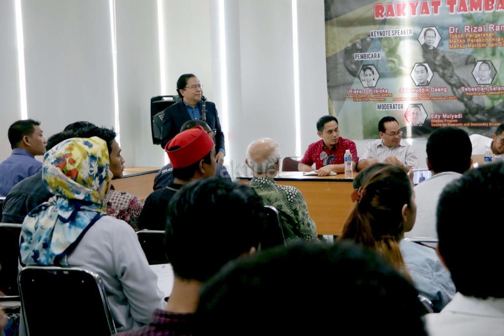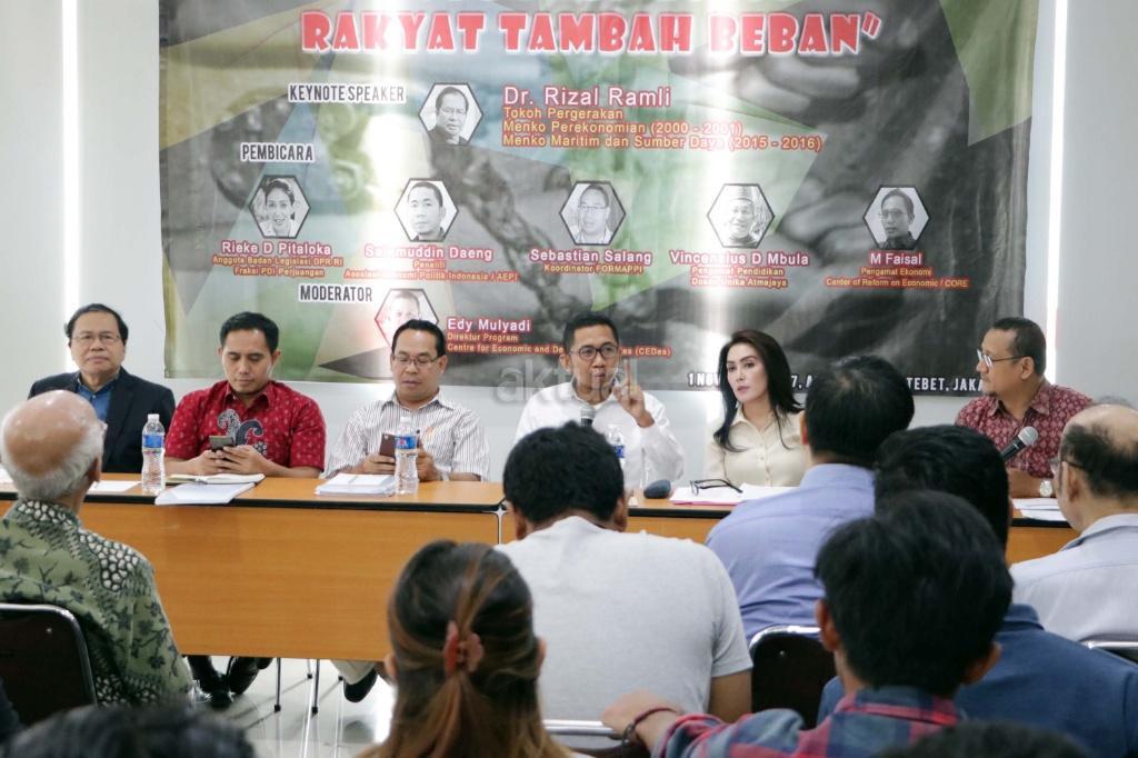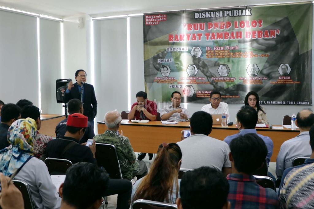 Kiri-kanan : Tokoh Pergerkan dan mantan Menko Maritim dan Sumber Daya Rizal Ramli , Pengamat Ekonomi Center of Reform on Economic (Core) M. Faisal, Koordinator Formappi Sebastian Salang, Peneliti Asosiasi Ekonomi Politik Indonesia (AEPI) Salamudin Daeng, Anggota Badan Legislasi DPR RI Fraksi PDI Perjuangan Rieke Diah Pitaloka, Direktur Program for Economic and Democracy Studies (Cedes) Edy Mulyadi saat berdiskusi terkait Pendapatan Negara Bukan Pajak (PNBP) di Jakarta, Rabu (1/11/2017). Diskusi Pendapatan Negara Bukan Pajak (PNBP) diselenggarakan oleh Pergerakan Kedaulatan Rakyat (PKR) dalam tema “RUU PNBP Lolos Rakyat Tambah Beban”. AKTUAL/Munzir