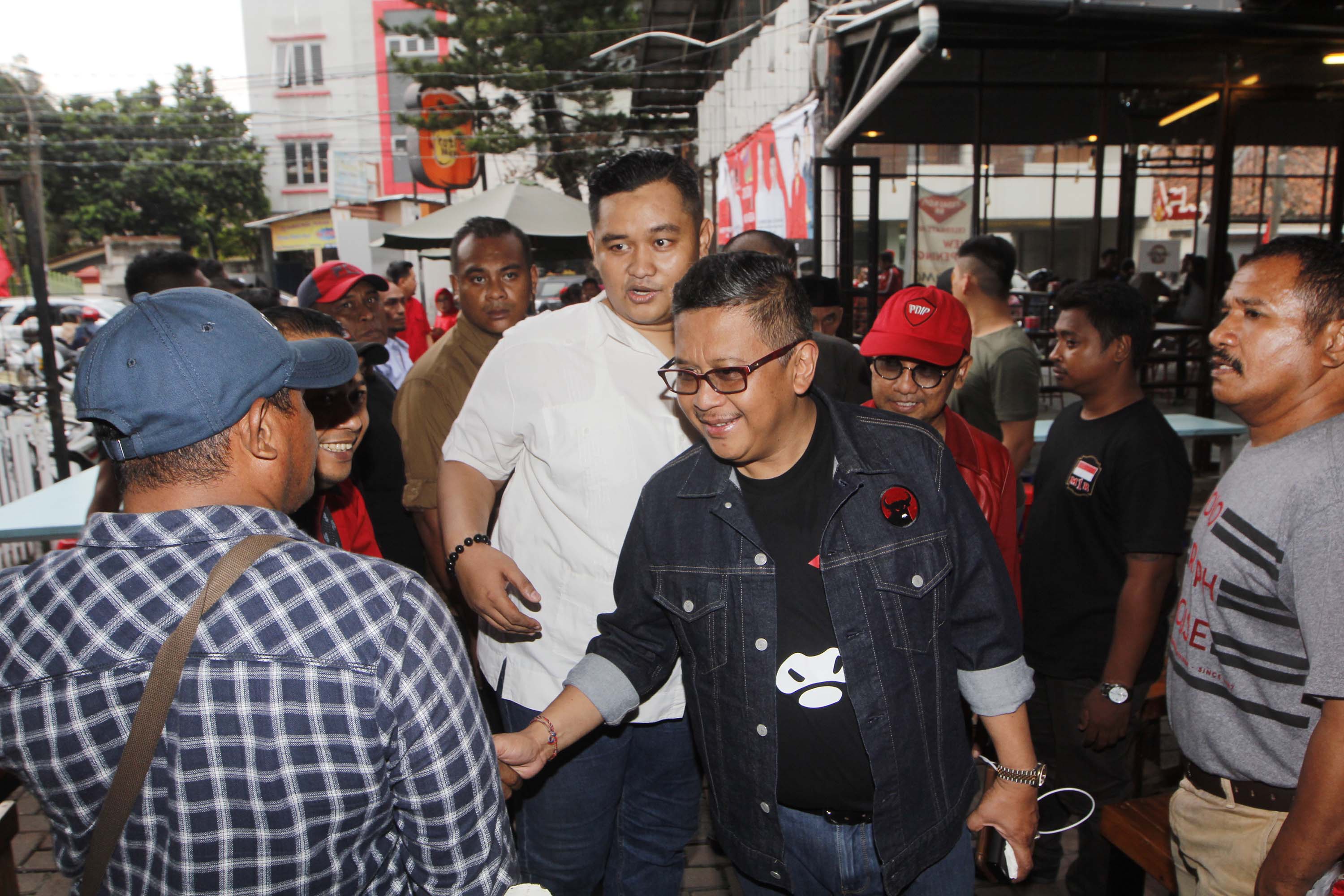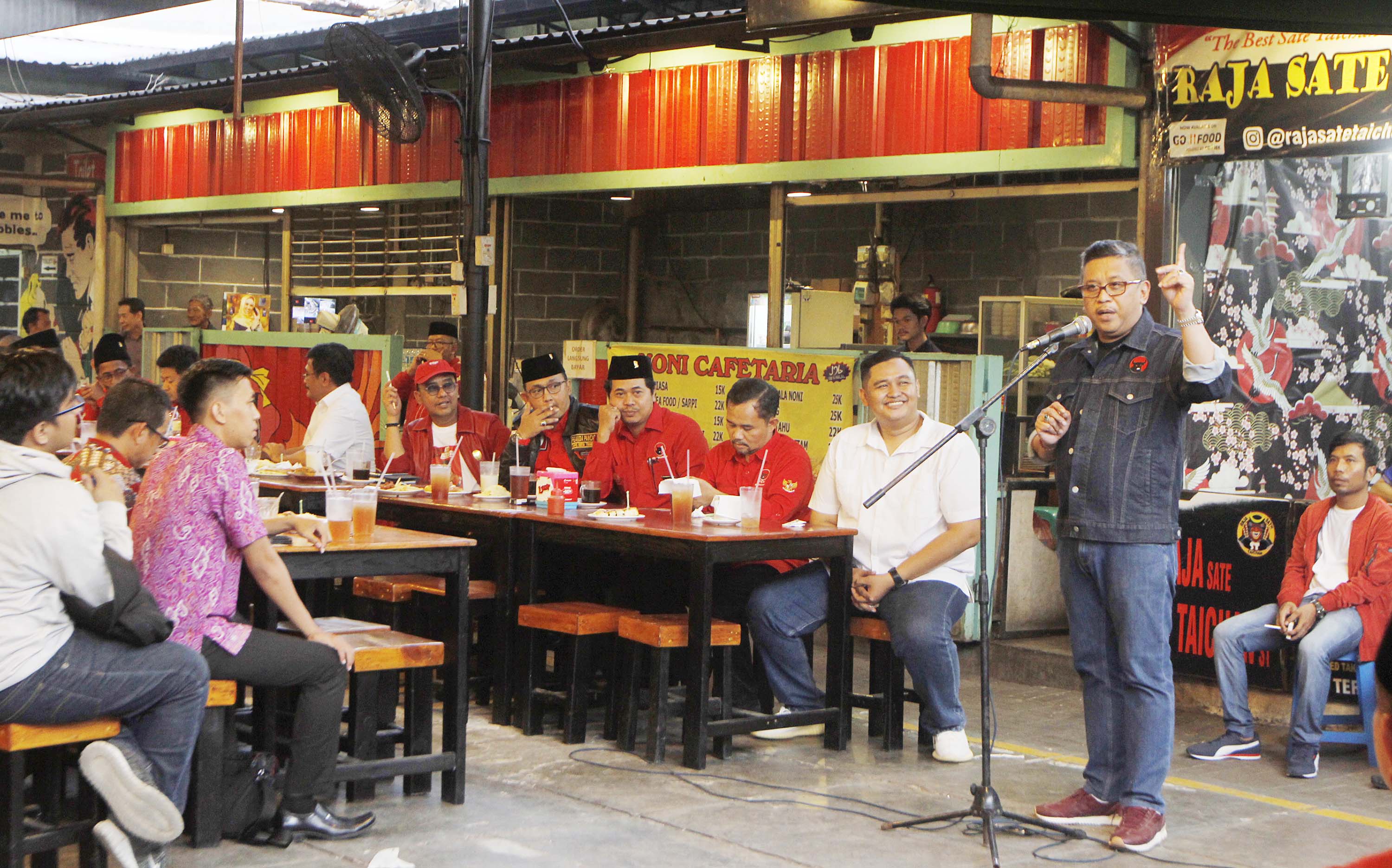 Sekjen PDI Perjuangan Hasto Kristianto didampingi Sekretaris DPC PDI Perjuangan Kota Tangerang Andri S Pernama saat menghadiri ngobrol santai dengan pemilih milenial dan organisasi pemuda di Roti Bakar 88, Tangerang, Banten, Jumat (21/12). Safari politik kebangsaan untuk meningkatkan politisi muda PDIP dalam memperoleh suara pemilih milenial, yang jumlahnya mencapai 40 persen dari total pemilih Pemilu 2019. AKTUAL/IST