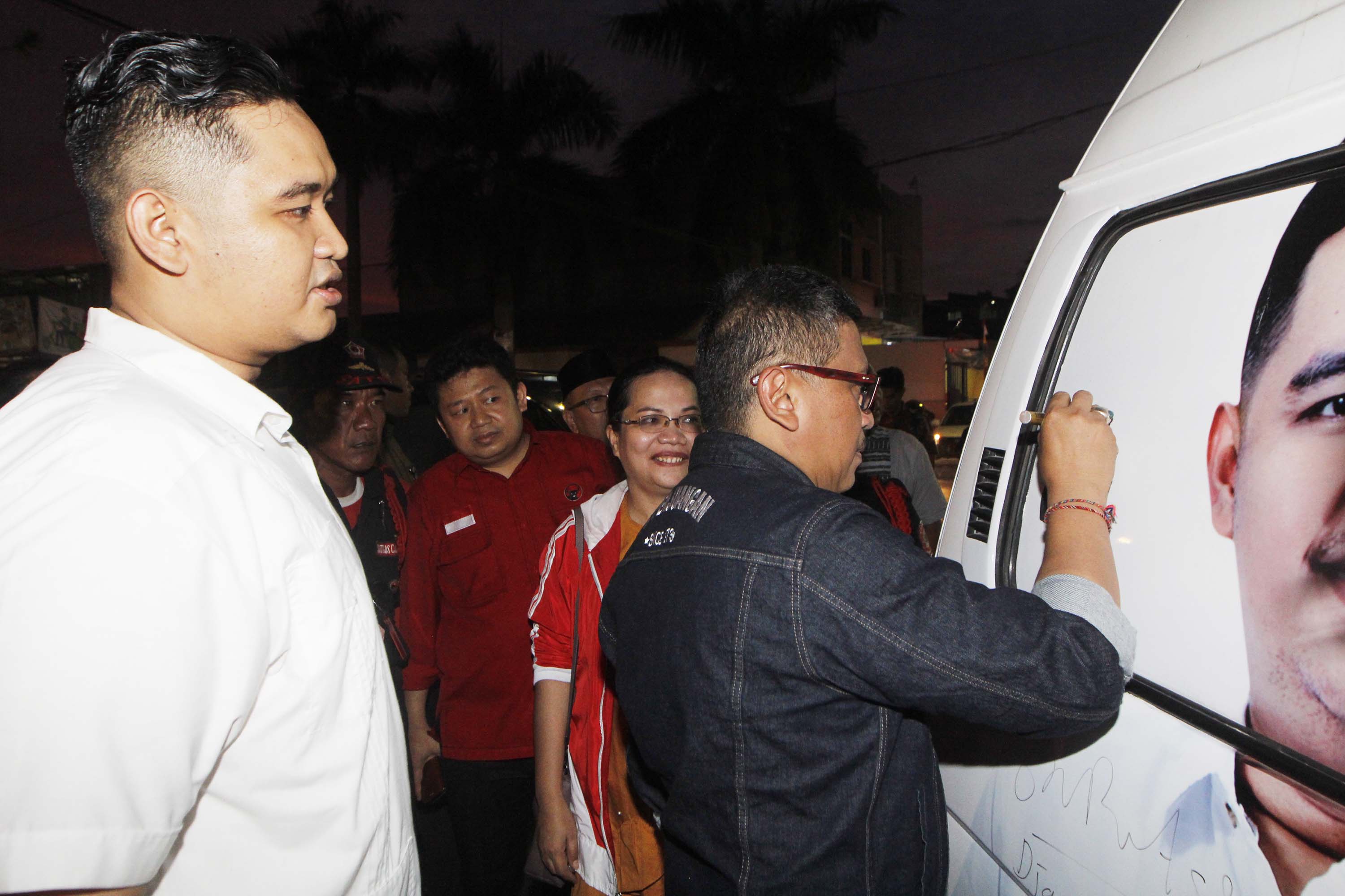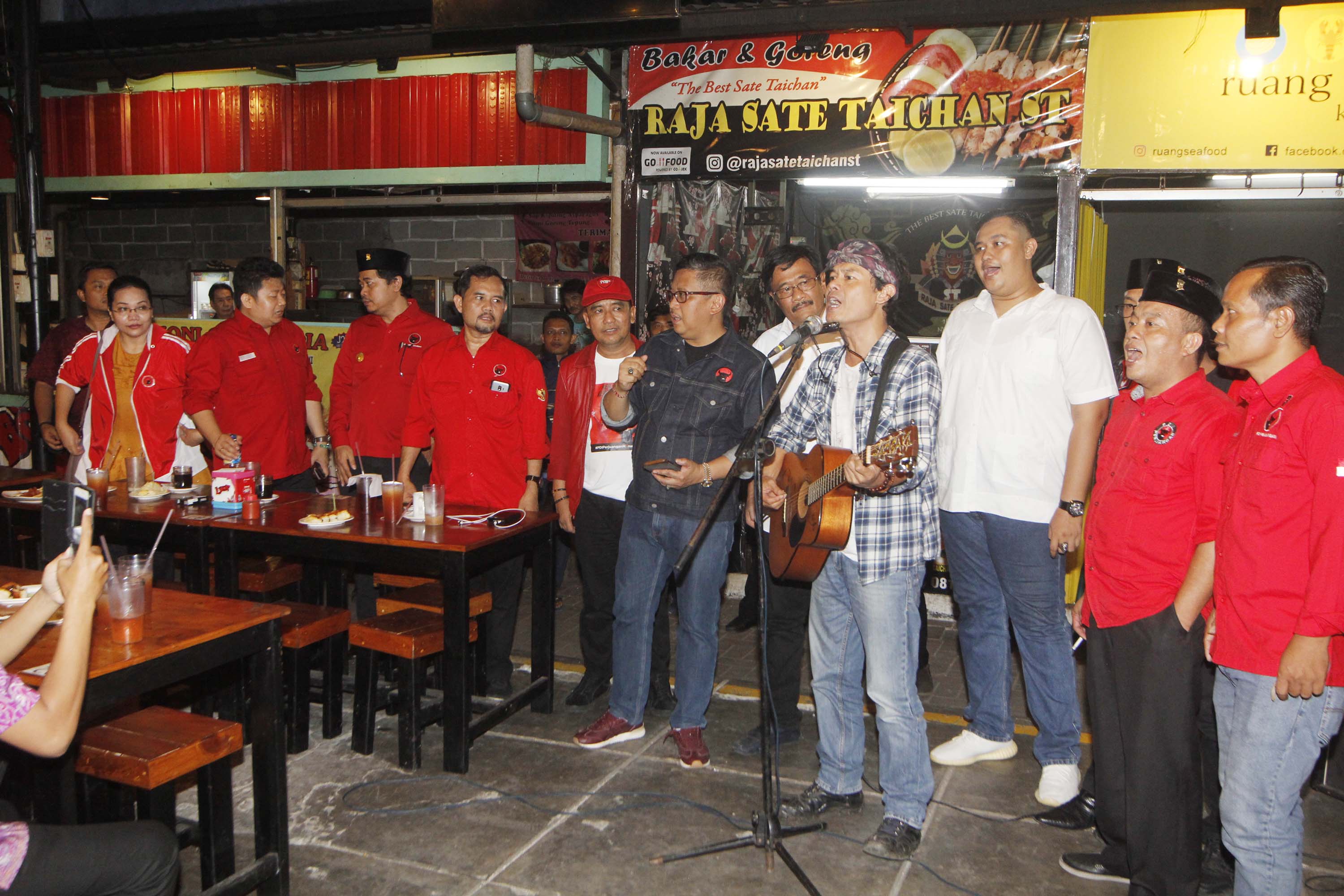 Sekretaris Tim Kampanye Nasional Jokowi Ma’ruf Amin Hasto Kristianto didampingi Sekretaris Tim Kampanye Nasional Jokowi-Ma’ruf Amin Kota Tangerang Andri S Pernama bernyanyi bersama saat menghadiri ngobrol santai dengan pemilih milenial dan organisasi kepemudaan di Roti Bakar 88, Tangerang, Banten, Jumat (21/12). Safari politik kebangsaan tersebut untuk meningkatkan politisi muda dalam memperoleh suara pemilih milenial, yang jumlahnya mencapai 40 persen dari total pemilih Pemilu 2019. AKTUAL/IST