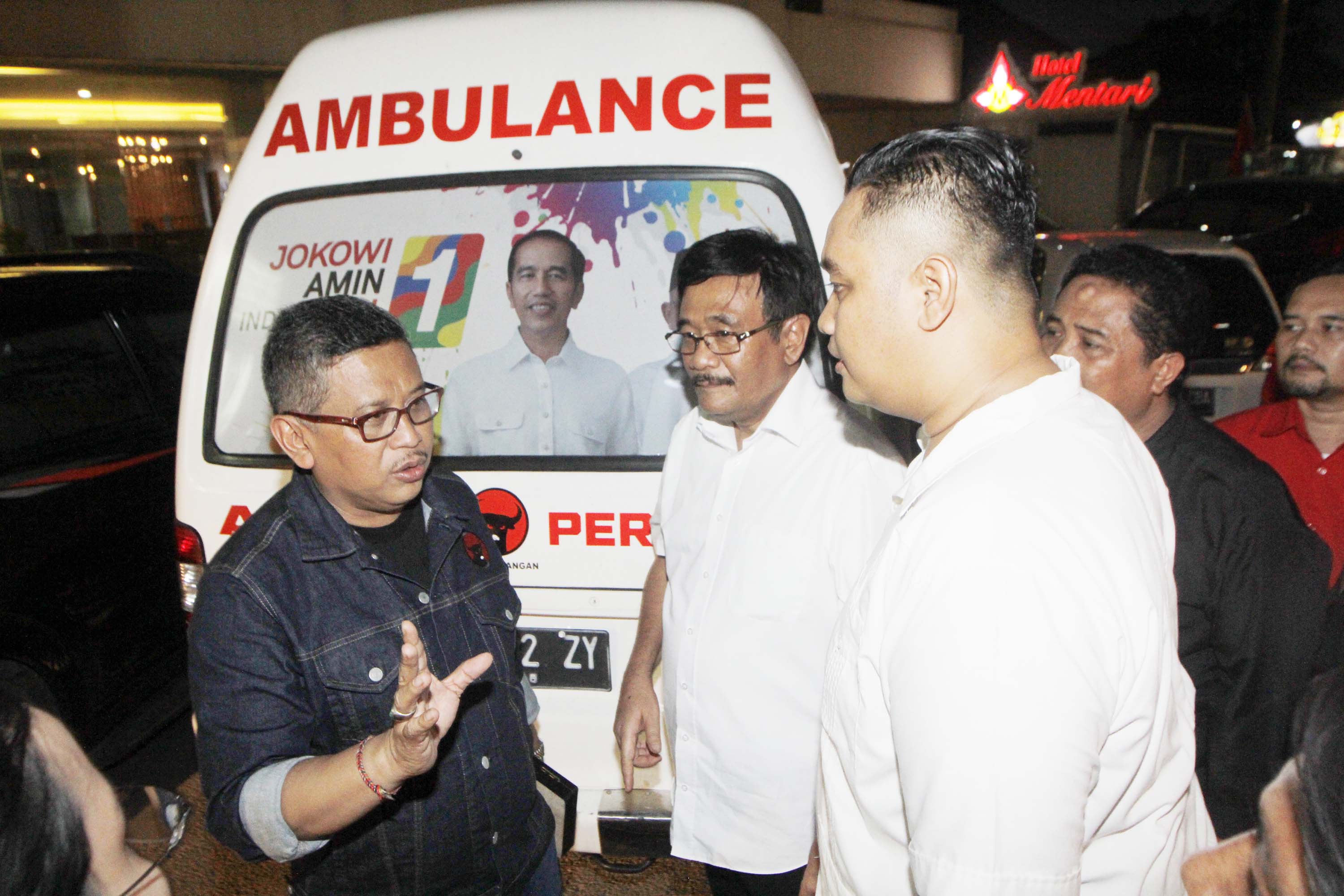 Sekretaris Tim Kampanye Nasional Jokowi Ma’ruf Amin Hasto Kristianto (kiri) didampingi Sekretaris Tim Kampanye Nasional Jokowi-Ma’ruf Amin Kota Tangerang Andri S Pernama (kanan) dan Ketua DPP PDIP Bidang Organisasi Djarot Saiful Hidayat saat menghadiri ngobrol santai dengan pemilih milenial dan organisasi kepemudaan di Roti Bakar 88, Tangerang, Banten, Jumat (21/12). Safari politik kebangsaan tersebut untuk meningkatkan politisi muda dalam memperoleh suara pemilih milenial, yang jumlahnya mencapai 40 persen dari total pemilih Pemilu 2019. AKTUAL/IST