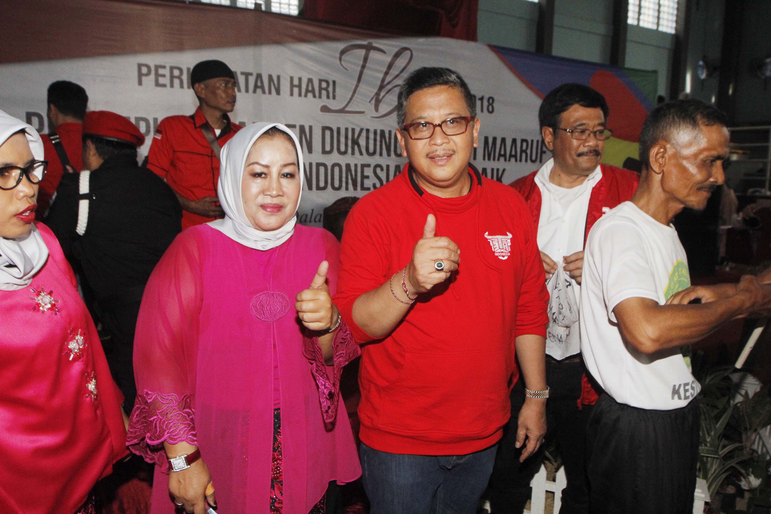Dari kiri ke kanan, Sekretaris Tim Kampanye Nasional Jokowi Ma’ruf Amin Hasto Kristianto didampingi Ketua Panitia Peringatan Hari Ibu Sri Hartarti bersama 1.500 perempuan Banten mendeklarasikan diri mendukung pasangan calon nomor urut 01 Joko Widodo-Ma’ruf Amin bertepatan dengan momentum peringatan Hari Ibu di GOR Dimyati, Kota Tangerang, Banten, Jumat (21/12). Safari politik kebangsaan tersebut untuk meningkatkan pemilih kaum perempuan-perempuan Tangerang dan memenangkan pasangan Jokowi-KH Maruf Amin, menjadi Presiden dan Wakil Presiden RI periode 2019 – 2024. AKTUAL/IST