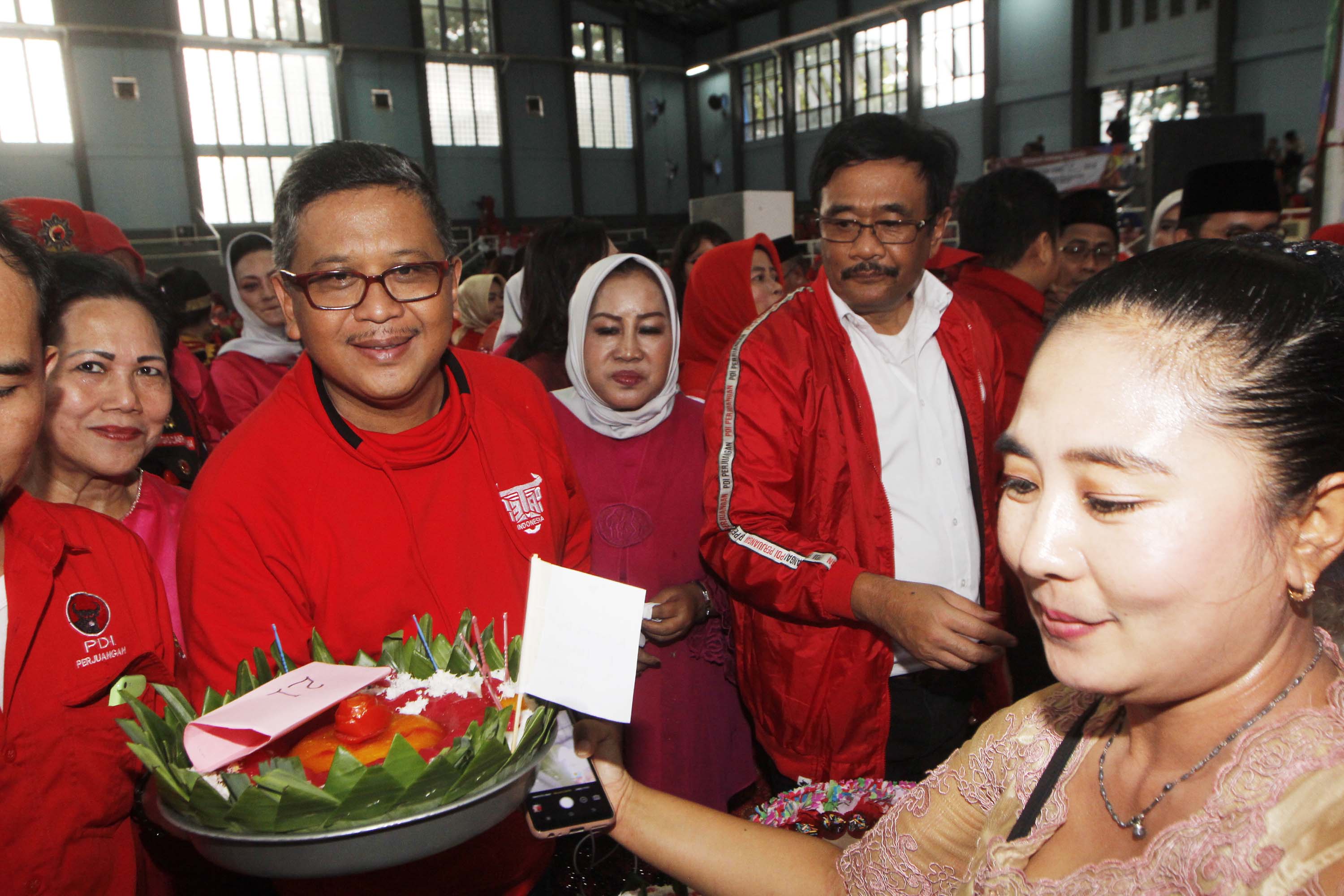 Sekretaris Tim Kampanye Nasional Jokowi Ma’ruf Amin Hasto Kristianto (tengah) didampingi Ketua Panitia Peringatan Hari Ibu Sri Hartarti (kiri) bersama 1.500 perempuan Banten mendeklarasikan diri mendukung pasangan calon nomor urut 01 Joko Widodo-Ma’ruf Amin bertepatan dengan momentum peringatan Hari Ibu di GOR Dimyati, Kota Tangerang, Banten, Jumat (21/12). Safari politik kebangsaan tersebut untuk meningkatkan pemilih kaum perempuan-perempuan Tangerang dan memenangkan pasangan Jokowi-KH Maruf Amin, menjadi Presiden dan Wakil Presiden RI periode 2019 – 2024. AKTUAL/IST