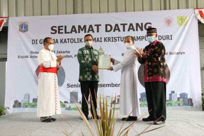 Jakarta, Aktual.com – Gubernur Provinsi DKI Jakarta, Anies Baswedan menyerahkan Izin Mendirikan Bangungan (IMB) sekaligus menghadiri proses peletakan batu pertama pembangunan Gereja Katolik Damai Kristus, yang berlokasi di Duri Selatan, Tambora, Jakarta Barat, pada Senin (20/12).