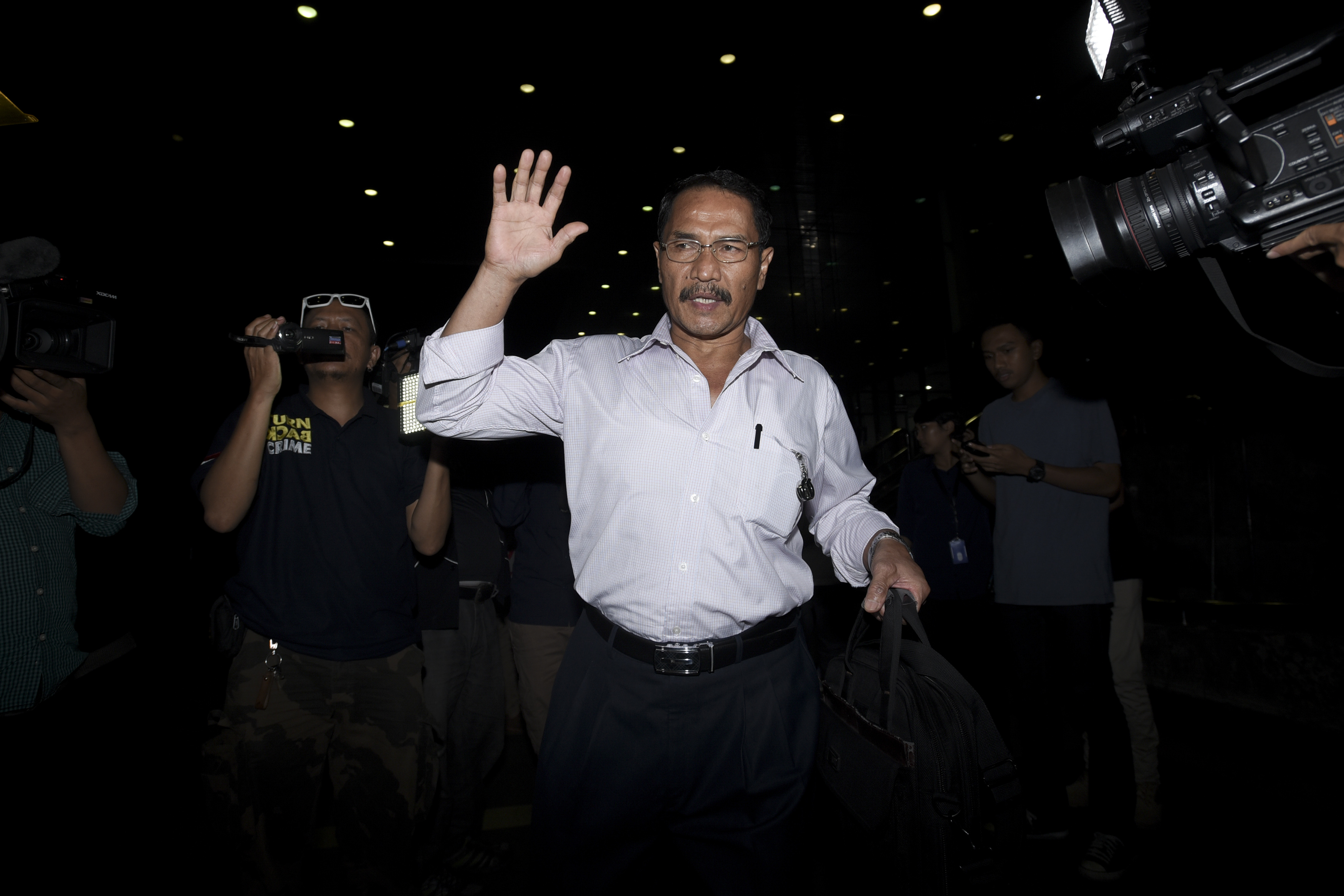 Panitera Pengadilan Tipikor Bengkulu Zailani Syihab melambaikan tangan seusai menjalani pemeriksaan di Gedung KPK, Jakarta, Senin (6/6). Zailani diperiksa KPK sebagai saksi terkait kasus dugaan suap dalam penanganan perkara korupsi penyalahgunaan honor Dewan Pembina RSUD M Yunus Bengkulu tahun 2011. ANTARA FOTO/Hafidz Mubarak A.pd//16