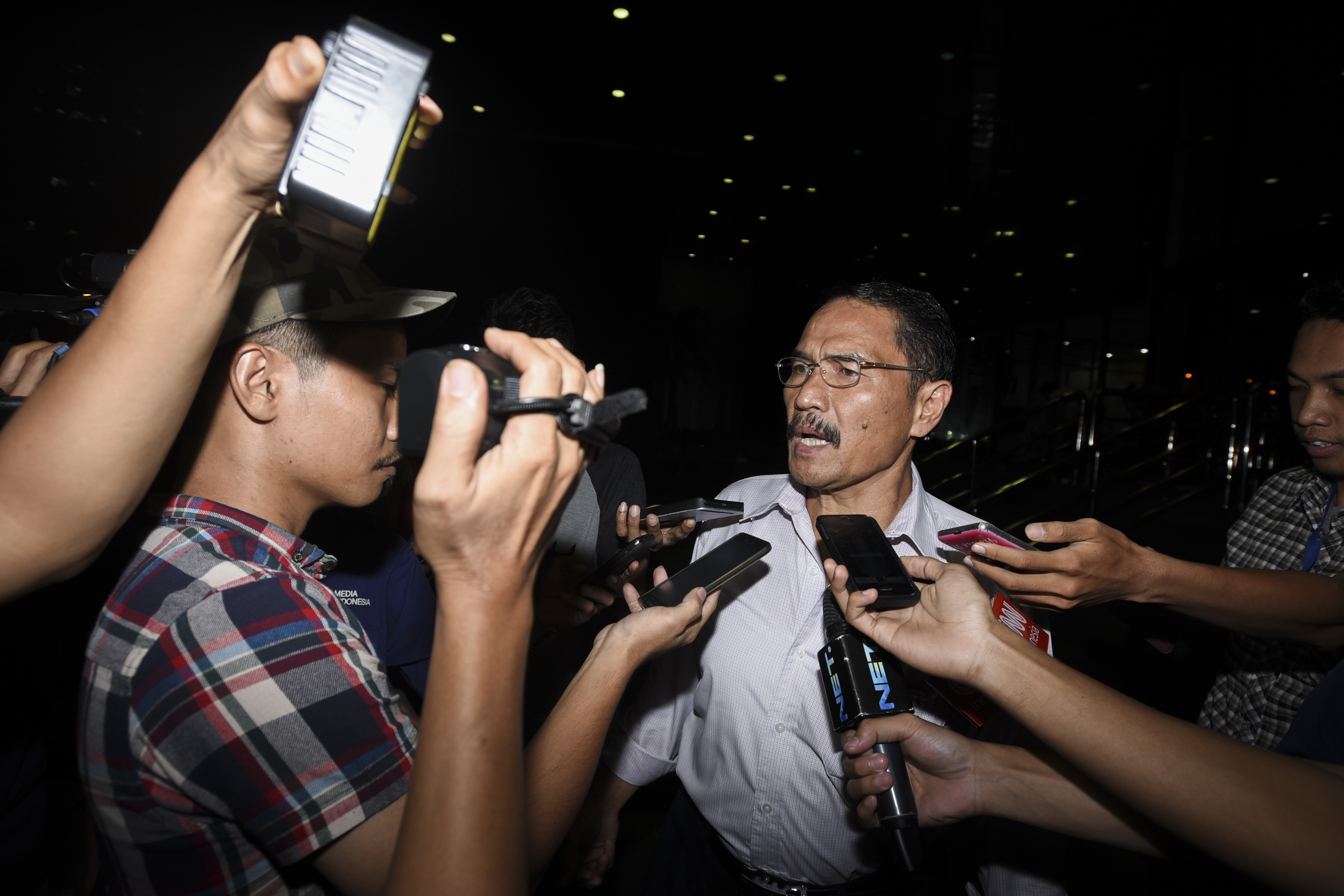 Panitera Pengadilan Tipikor Bengkulu Zailani Syihab (kanan) menjawab pertanyaan wartawan seusai menjalani pemeriksaan di Gedung KPK, Jakarta, Senin (6/6). Zailani diperiksa KPK sebagai saksi terkait kasus dugaan suap dalam penanganan perkara korupsi penyalahgunaan honor Dewan Pembina RSUD M Yunus Bengkulu tahun 2011. ANTARA FOTO/Hafidz Mubarak A./pd/16