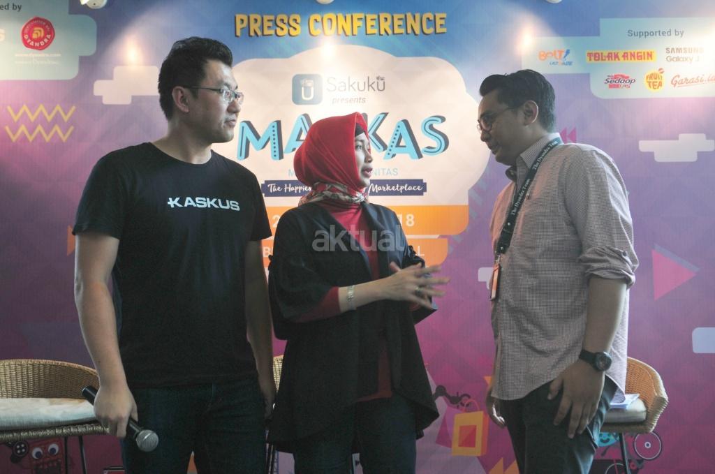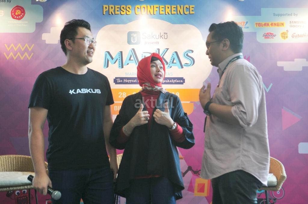 Senior Vice President Marketing Communication BCA Norisa Saifuddin (tengah) bersama Chief Marketing Officer Kaskus Ronny W. Sugiadha (kiri) dan Direktur PT Dyandra Promosindo Michael Bayu Sumarijanto (kanan) berbincang usai menggelar acara press conference MARKAS (Market x Komunitas) 2018 di Jakarta, Rabu (11/04). Gelaran MARKAS 2018 yang diselenggarakan pada 28 hingga 29 April 2018 di Bintaro Jaya Xchange mendatang akan memberikan promo atau penawaran bagi masyarakat khususnya pengguna Sakuku BCA seperti pembelian tiket masuk on the spot hanya senilai Rp61, program diskon 50% untuk pembelian Official Merchandise KASKUS, lelang gadget hingga program Happy Hour diskon 61% di tenant F&B. AKTUAL/Eko S Hilman