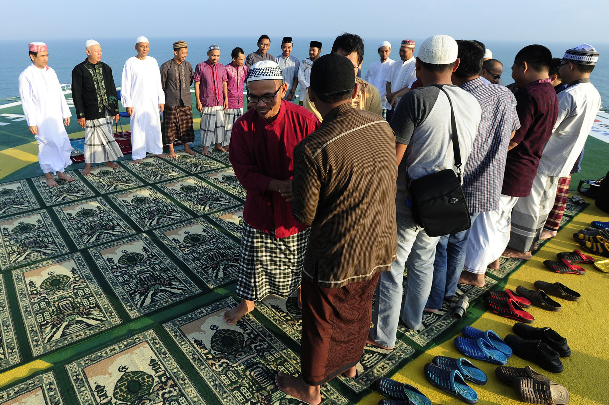 Pekerja mengikuti salat id di anjungan lepas pantai Mike-Mike milik Pertamina Hulu Energi Offshore North West Java (PHE ONWJ) di perairan Jawa Barar, Jumat (17/7). Umat muslim seluruh dunia merayakan Lebaran 1 Syawal 1436 H setelah melaksanakan ibadah puasa selama satu bulan. ANTARA FOTO/Wahyu Putro A/hp/15