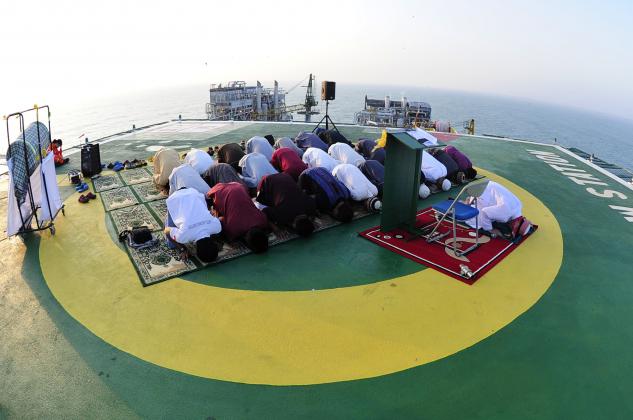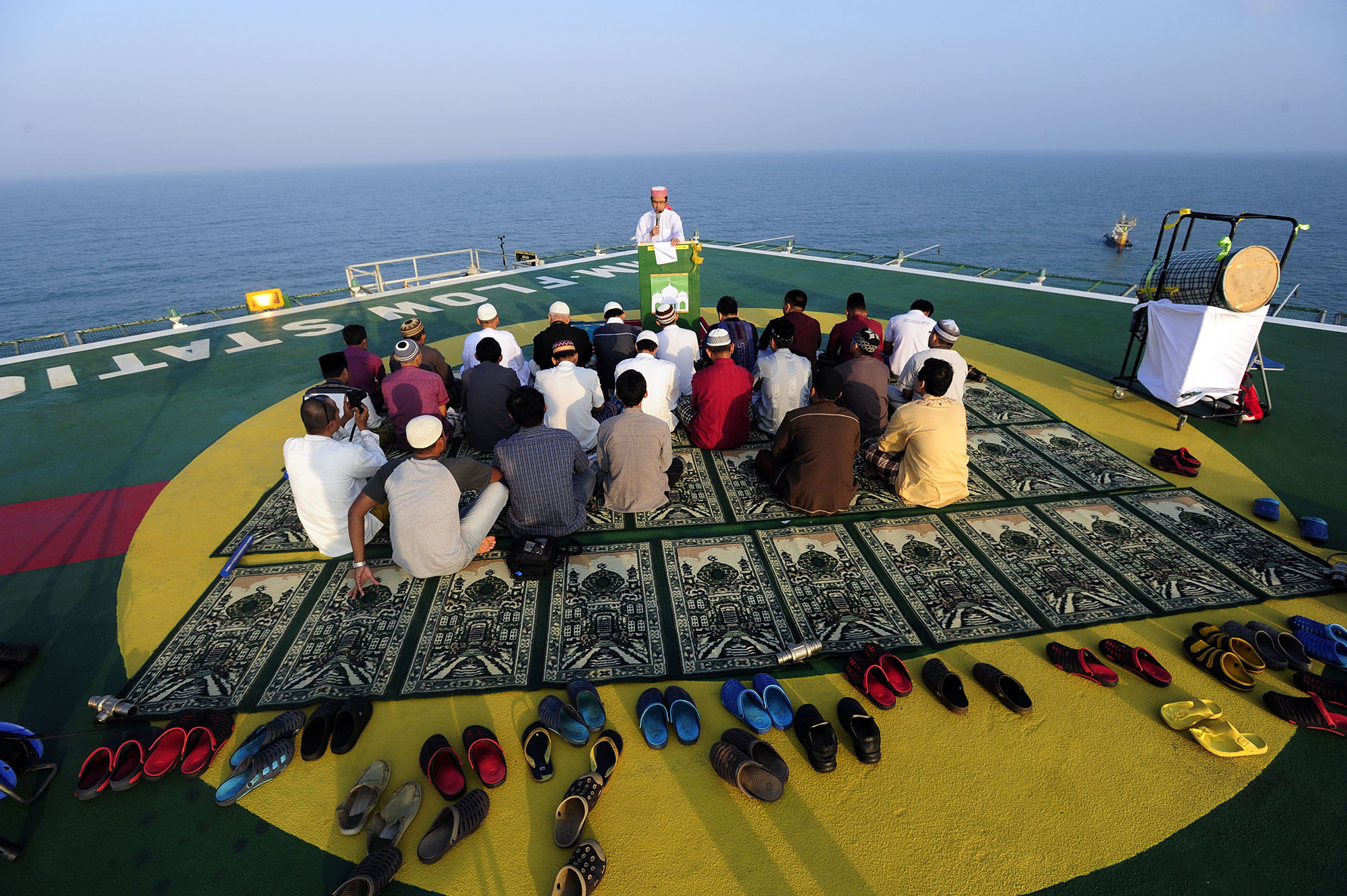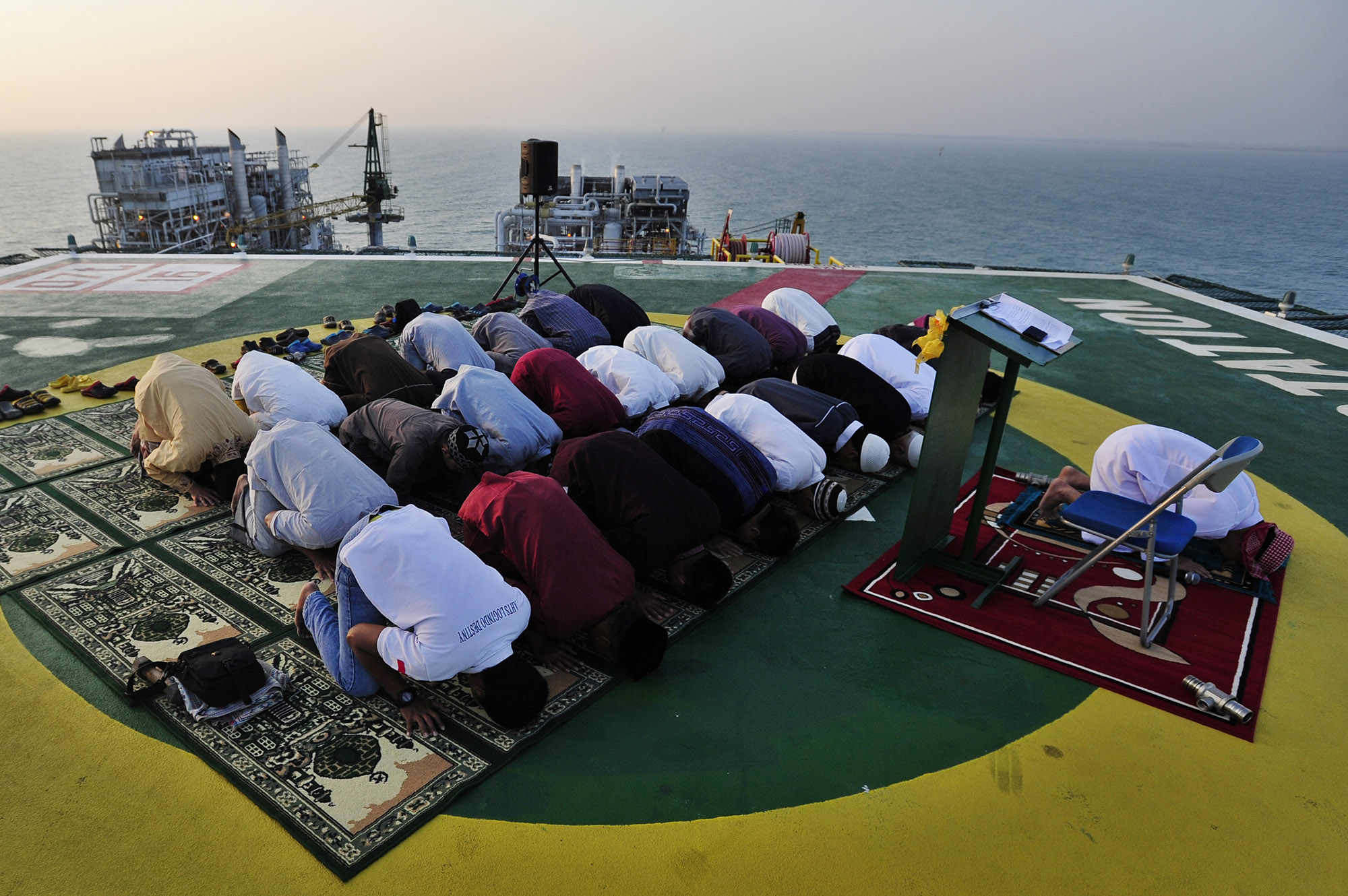 Pekerja mendengarkan kutbah ketika mengikuti salat id di anjungan lepas pantai Mike-Mike milik Pertamina Hulu Energi Offshore North West Java (PHE ONWJ) di perairan Jawa Barar, Jumat (17/7). Umat muslim seluruh dunia merayakan Lebaran 1 Syawal 1436 H setelah melaksanakan ibadah puasa selama satu bulan. ANTARA FOTO/Wahyu Putro A/hp/15