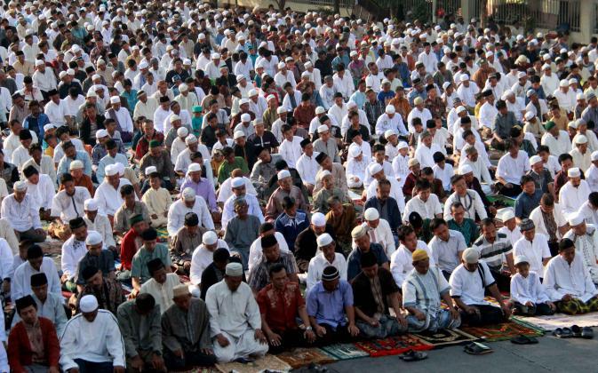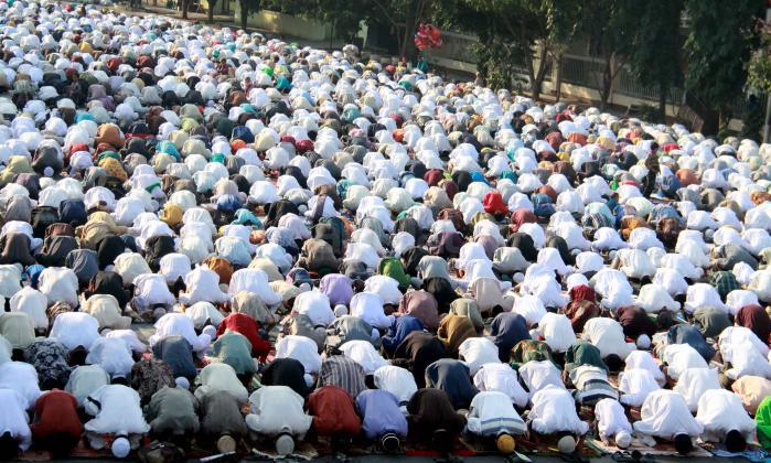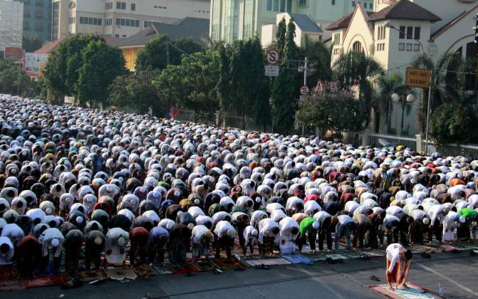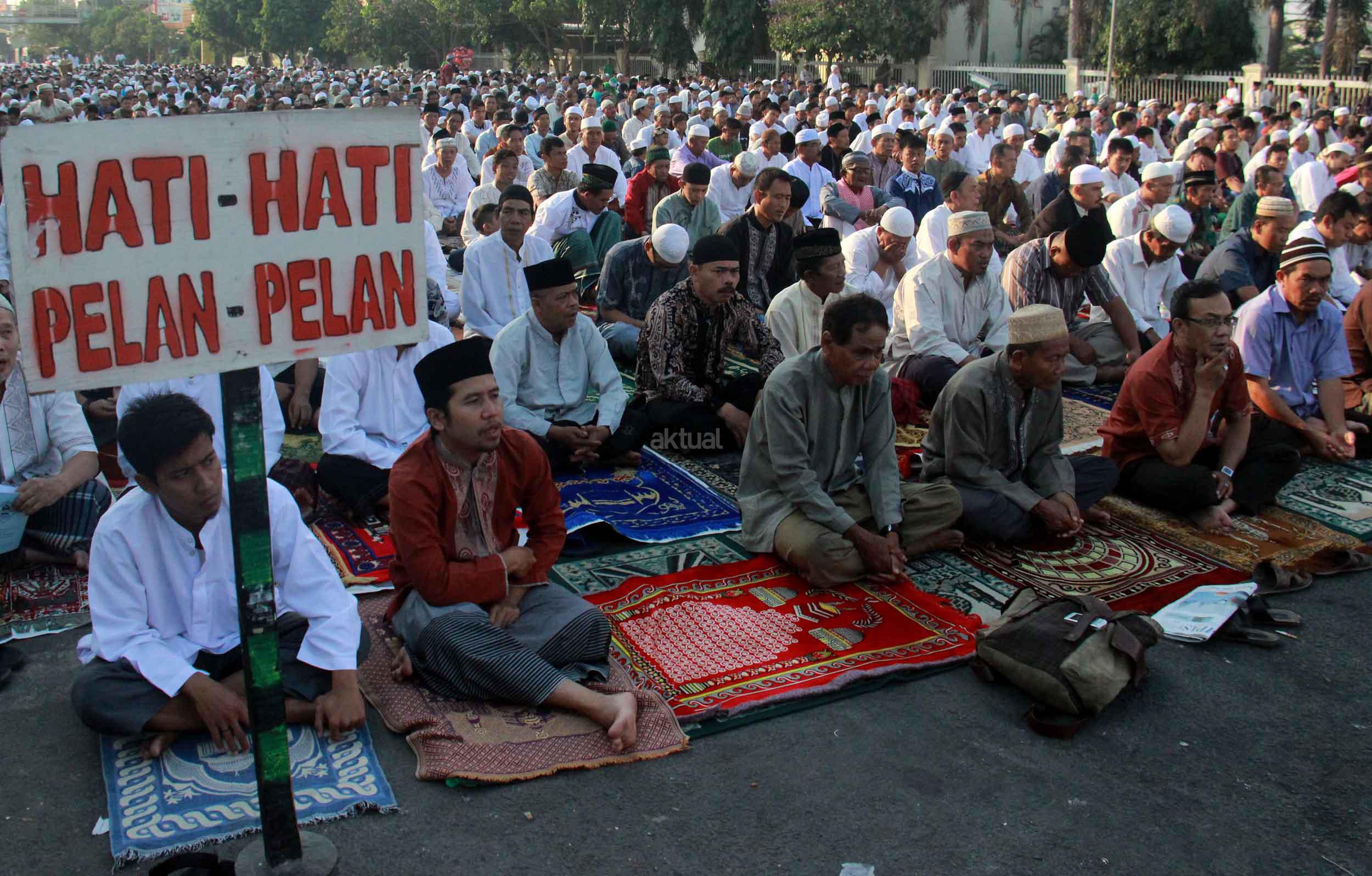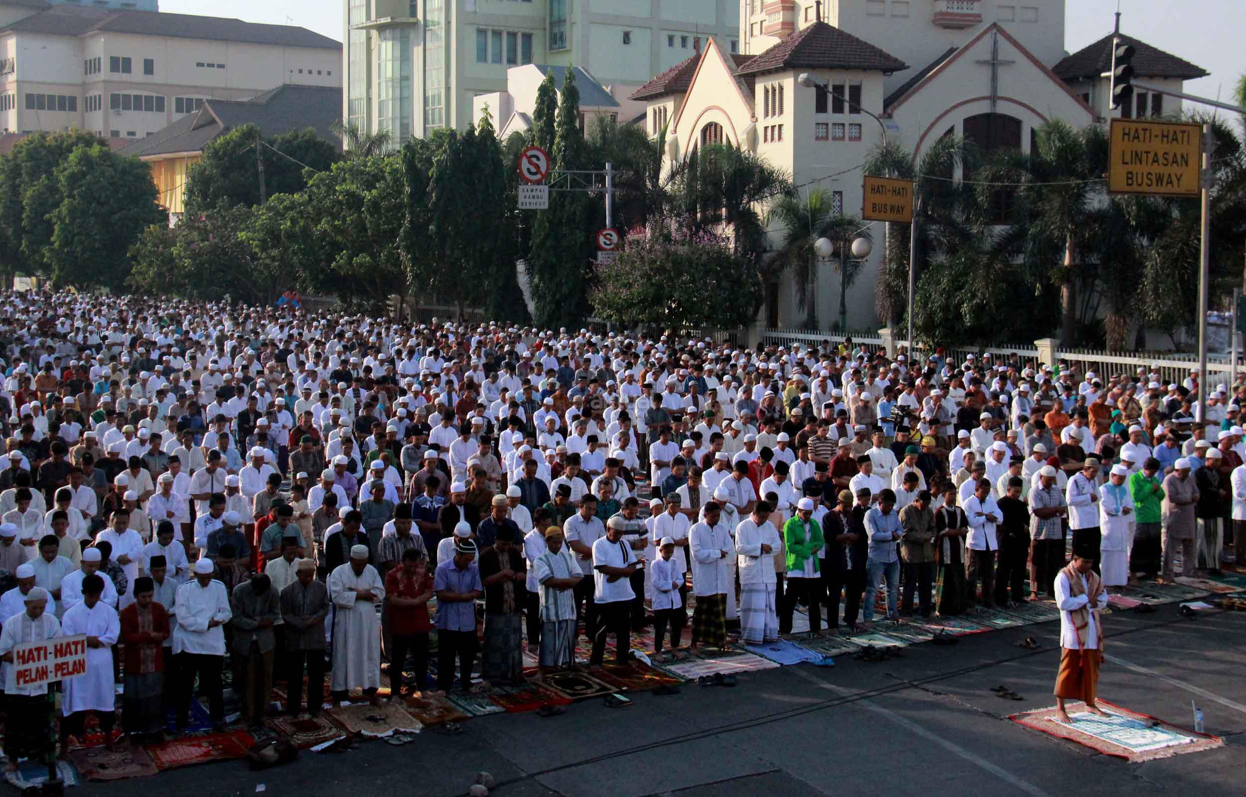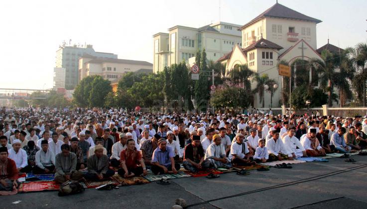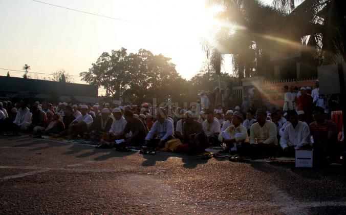 Ribuan umat muslim melaksanakan sholat Idul Adha 1436 H di simpang jalan Matraman Raya, Jakarta Timur, Kamis (24/9/2015). Umat muslim di seluruh dunia merayakan Hari Raya Idul Adha dengan berkurban dan menyembelih hewan-hewan ternak, berupa kambing, sapi untuk dibagikan dagingnya kepada fakir miskin.