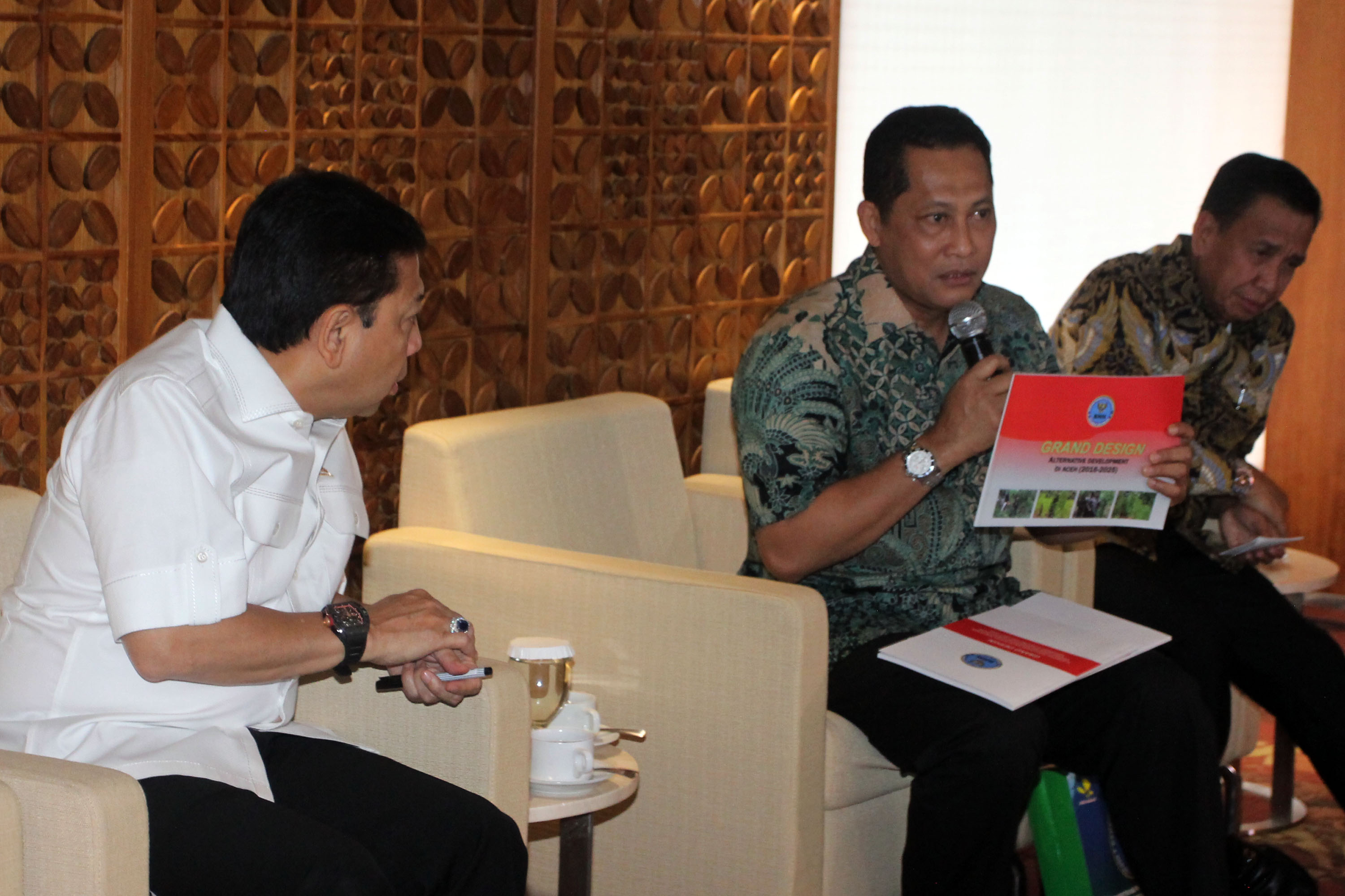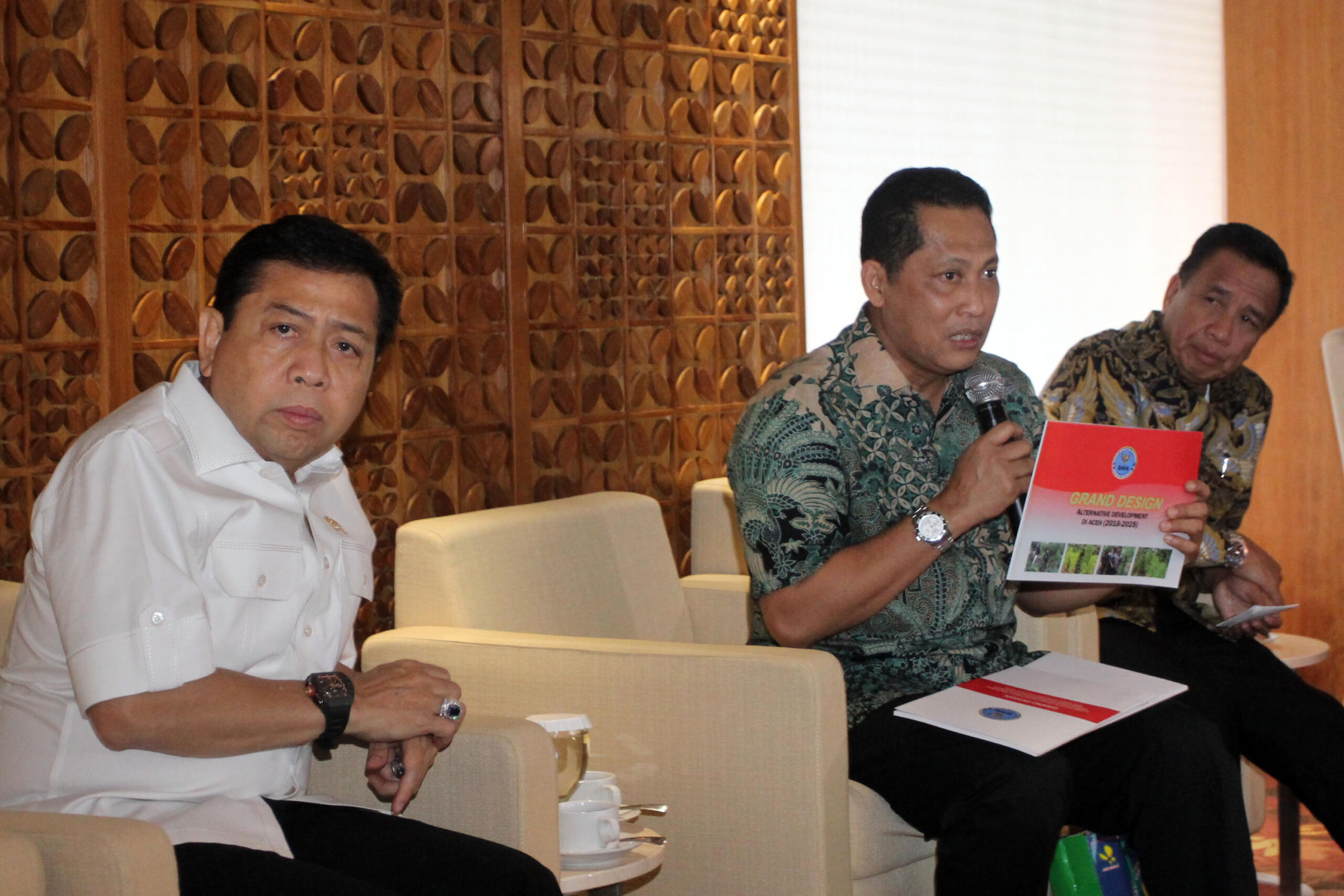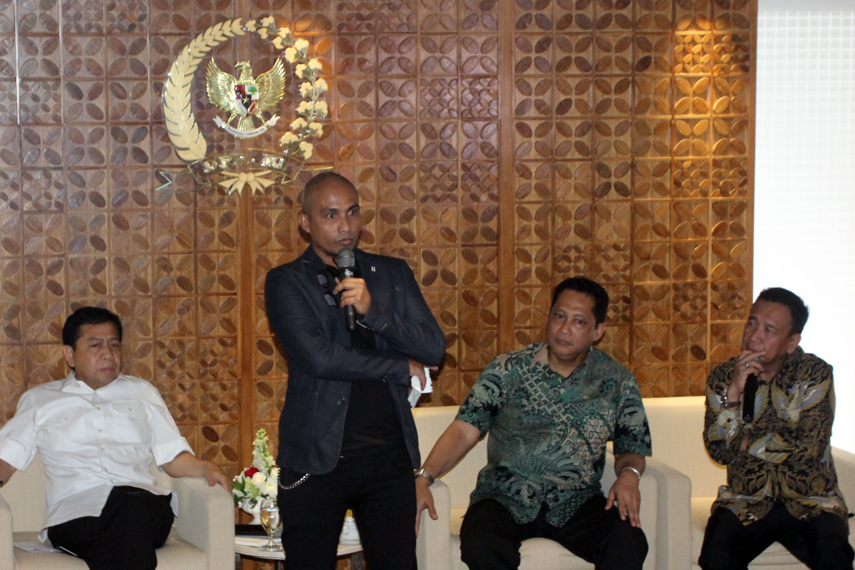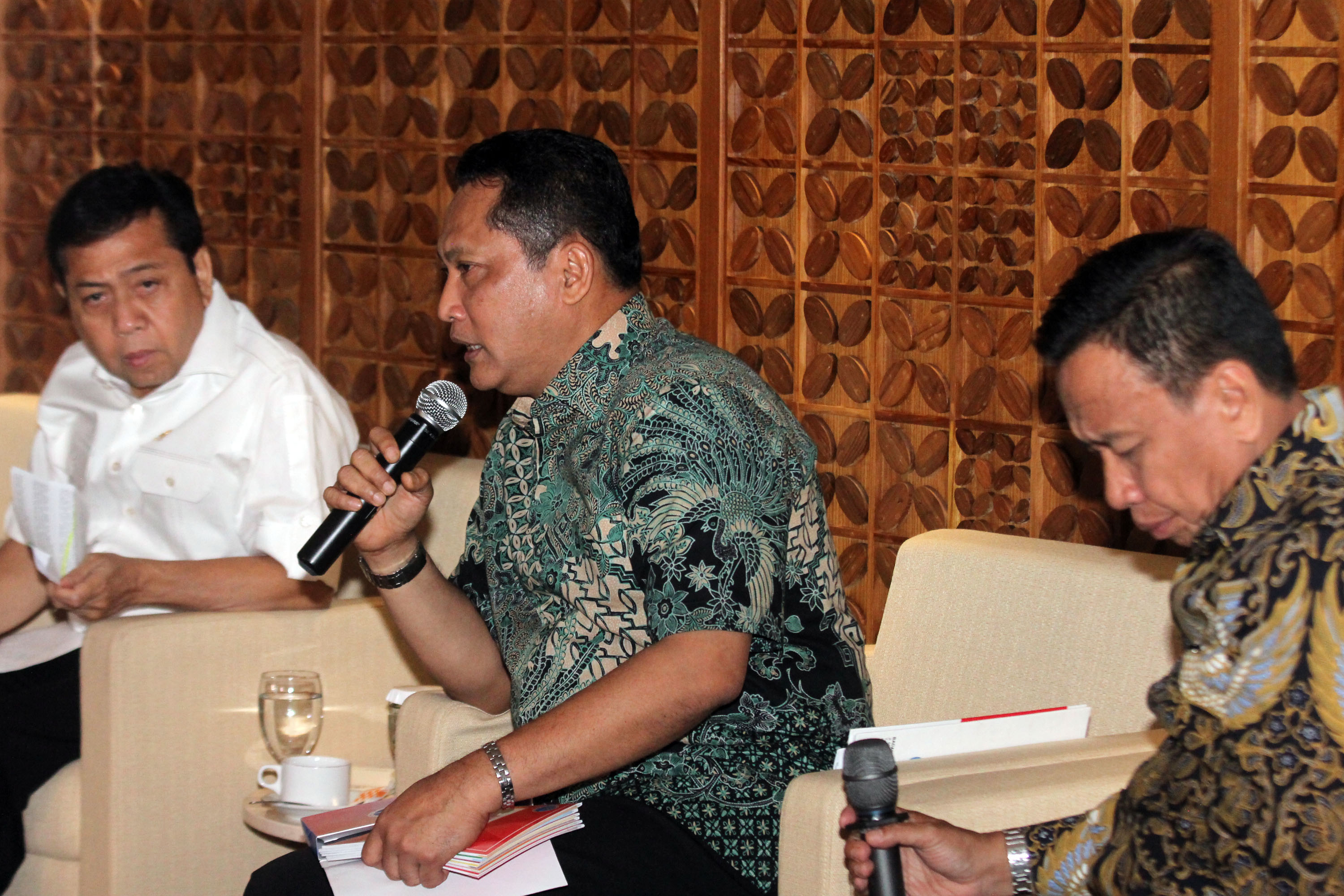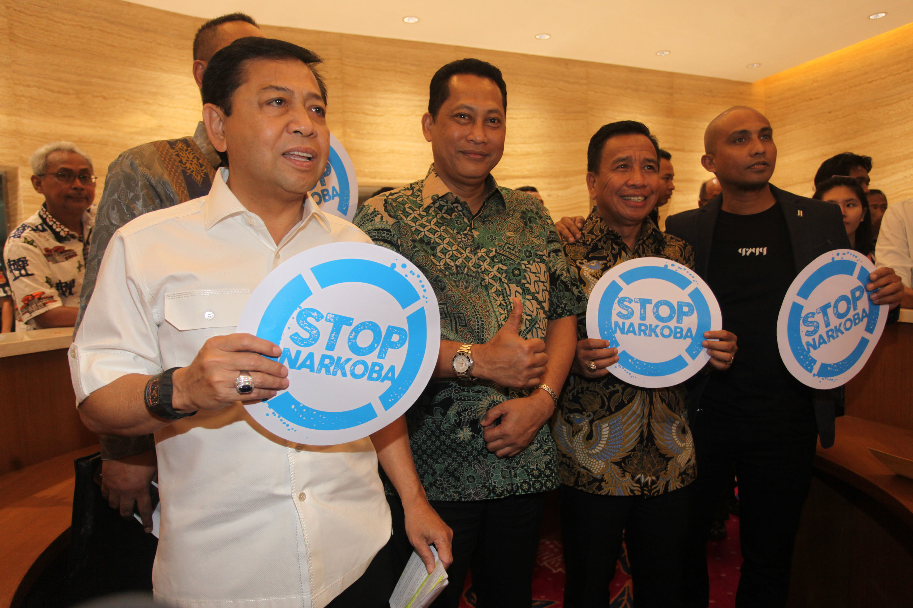 Ketua DPR Setya Novanto, Kepala Badan Narkotika Nasional (BNN) Budi Waseso dan Pelawak Dedi Gumelar (Miing) berbicara dalam diskusi "Solusi Nasional", betajuk Indonesia Darurat Narkoba, di Gedung Nusantara III, Kompleks Parlemen, Jakarta, Jumat (31/3). Dalam diskusi tersebut Buwas meminta semua pihak untuk terlibat dalam pencegahan sekaligus melawan narkoba disemua lini termasuk di Dunia Politik dan Hiburan, hal ini terkait pantauan BNN bahwa Narkoba sudah masuk hingga ke anak-anak. AKTUAL/Tino Oktaviano