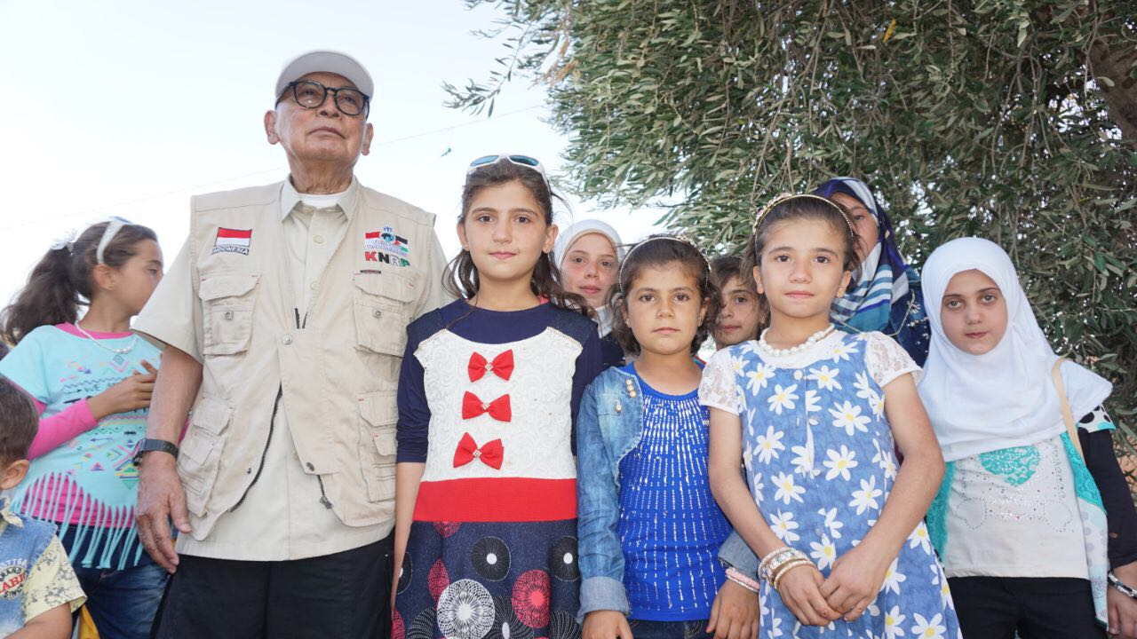 Ketua Umum KNRP Suripto foto bersama anak anak pengungsi Palestina dan Suriah yang berhasil masuk ke wilayah Aleppo Suriah, dalam rangka misi kemanusiaan Qurban Berkah untuk Palestina 1438 H, Sabtu (2/9/2017). Delegasi Merah Putih KNRP menyaksikan penyembelihan 300 ekor domba dan langsung didistribusikan ke kamp-kamp pengungsian rakyat Palestina dan Suriah. Ada sekitar 2000 warga disekitar pengungsian yang menerima manfaat daging qurban ini. Lokasi penyembelihan di dua kota, A’zaz dan Arra'i, provinsi Aleppo, Suriah. AKTUAL/HO