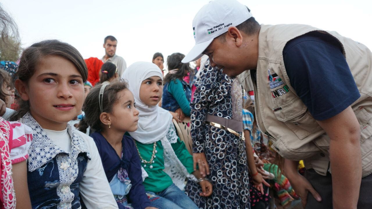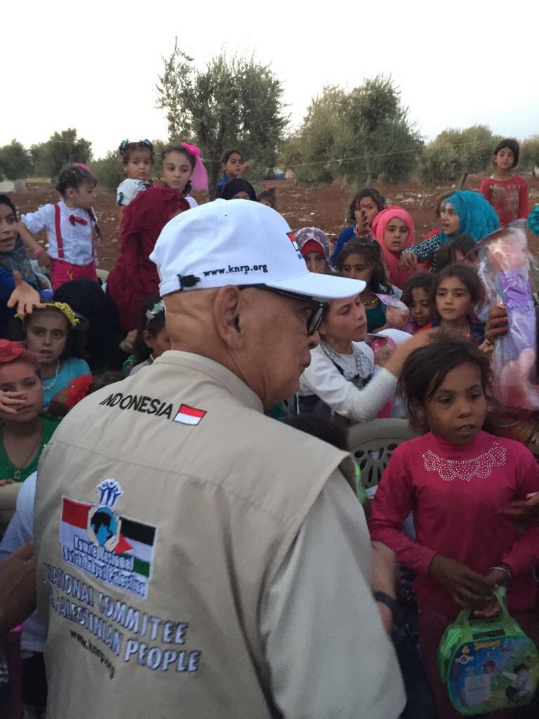 Ketua Umum KNRP Suripto bersama anak-anak pengungsi Palestina dan Suriah di kota A’zaz, Aleppo Suriah, Ahad (3/9/2017) dalam program Qurban Berkah untuk Palestina 1438 H, salah satunya memberikan Sedekah Hari Raya Qurban untuk pengungsi Palestina dan Suriah. AKTUAL/HO