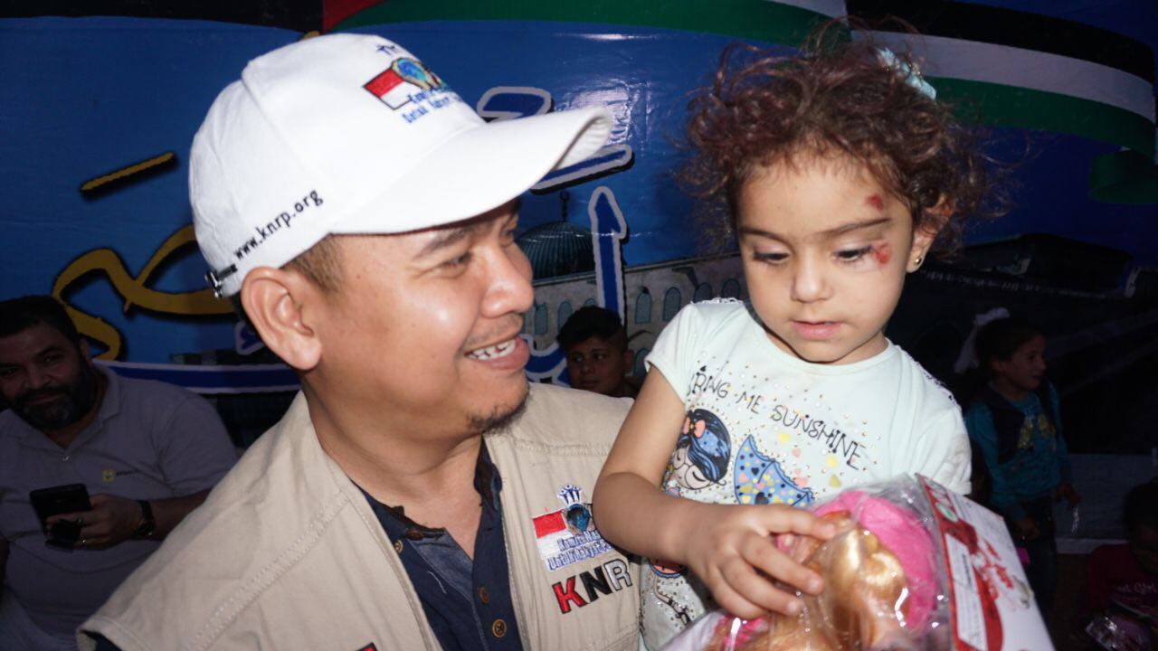 Sekjen KNRP Suhartono bercengkerama dengan anak-anak pengungsi Palestina dan Suriah, di kota A’zaz, Aleppo, Suriah, sesaat setelah tiba di lokasi acara Qurban Berkah untuk Palestina 1438 H. AKTUAL/HO