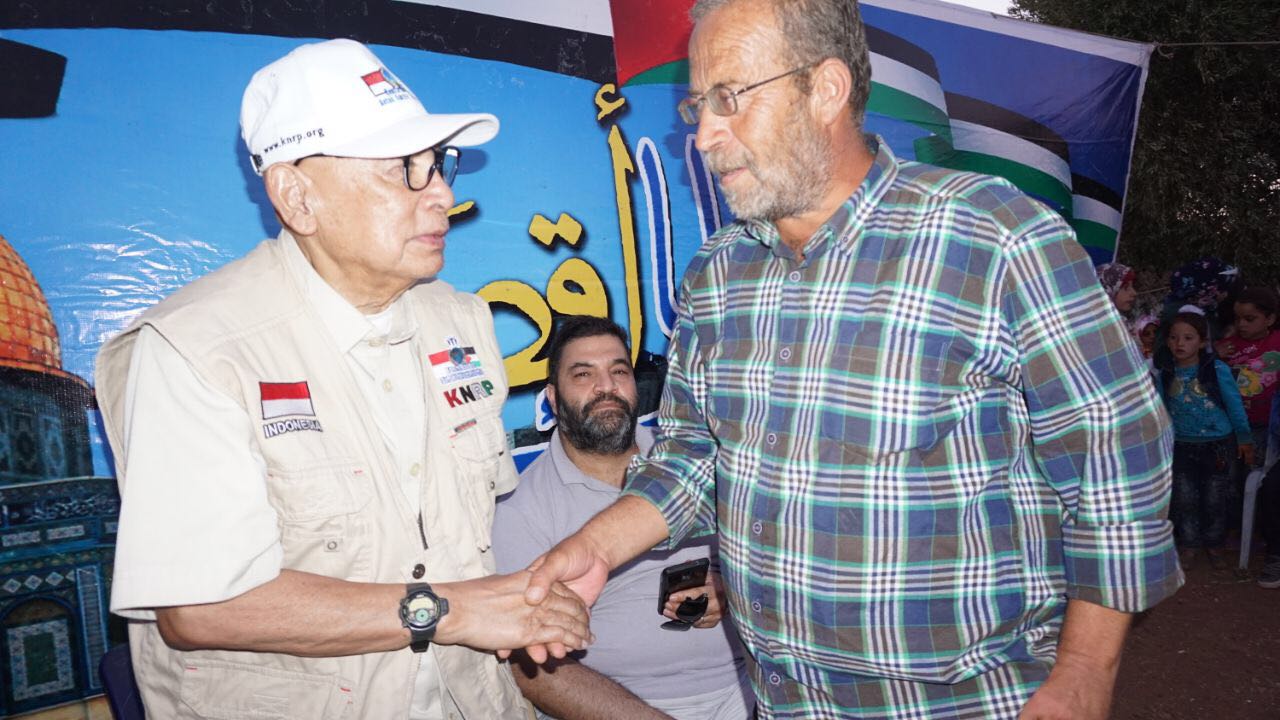 Ketua Umum KNRP Suripto bersama salah satu warga pengungsi Palestina dan Suriah di kota A’zaz, Aleppo Suriah, Ahad (3/9/2017) dalam program Qurban Berkah untuk Palestina 1438 H, salah satunya memberikan Sedekah Hari Raya Qurban untuk pengungsi Palestina dan Suriah. AKTUAL/HO
