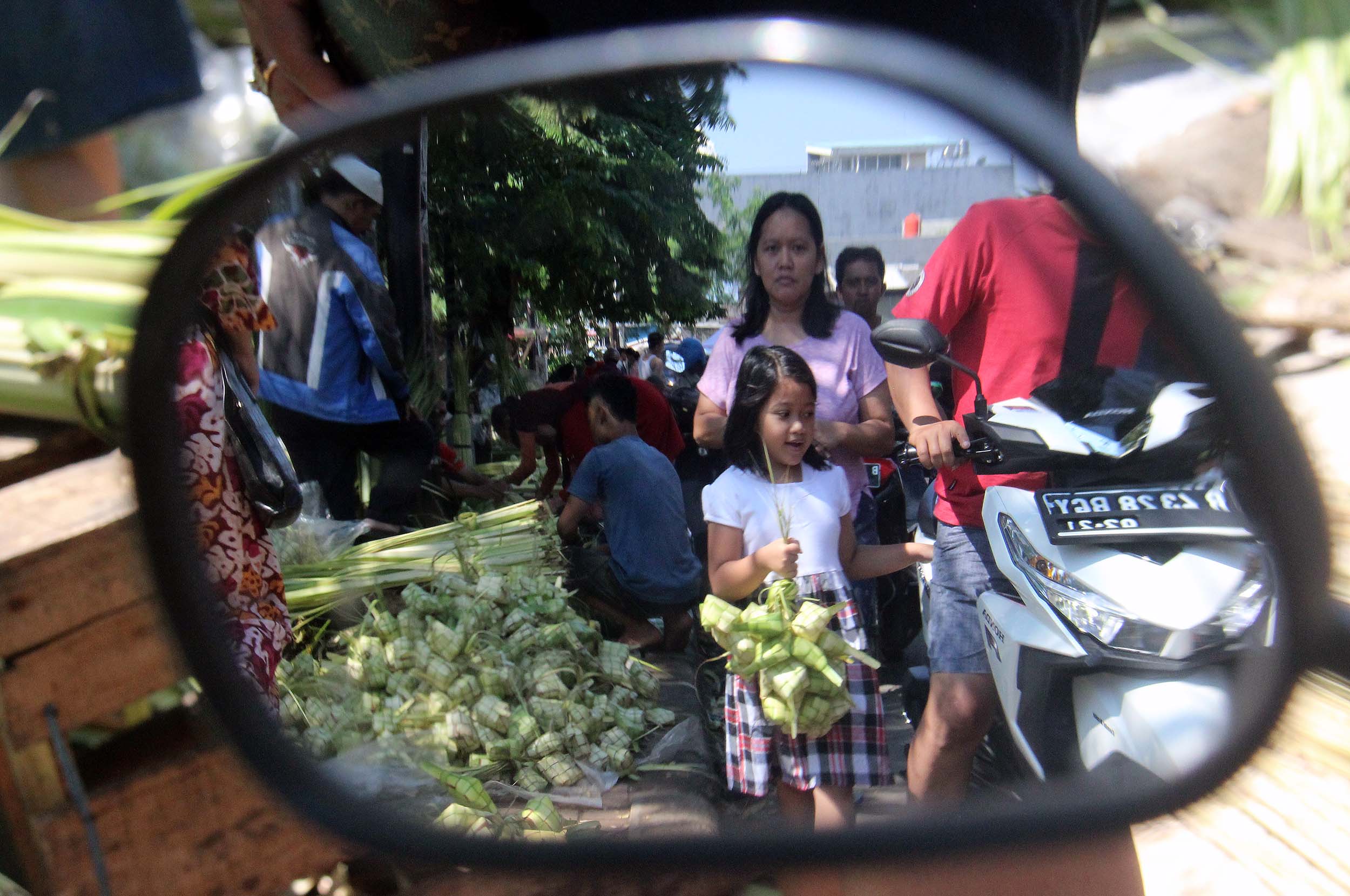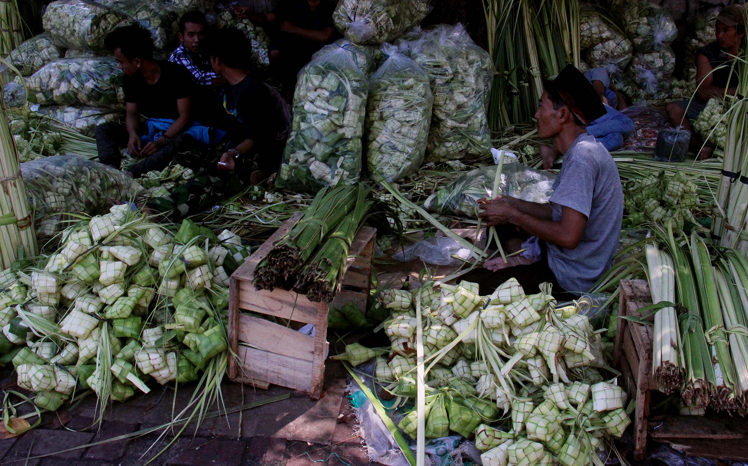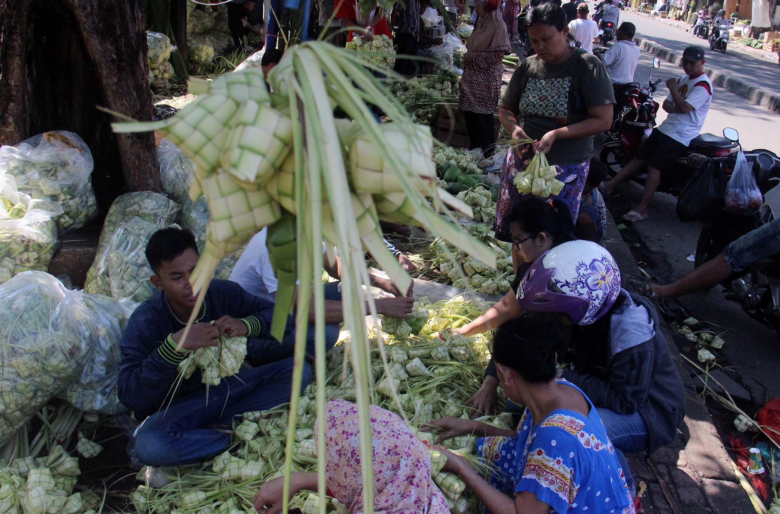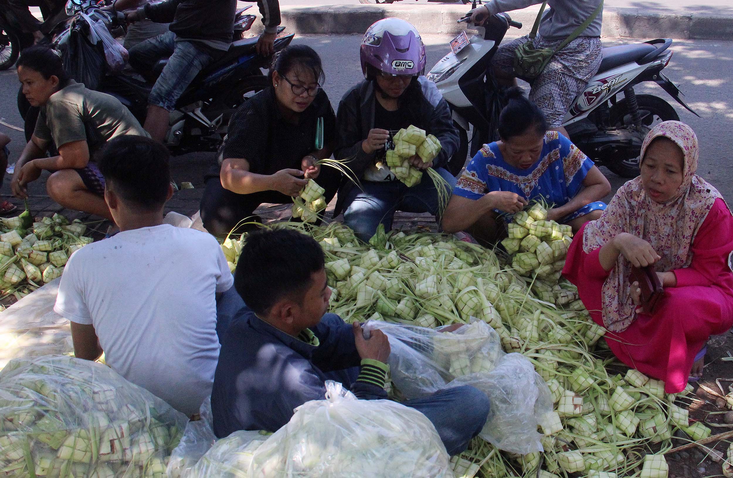 Menjelang perayaan Idul Fitri 1434 H, pedagang kulit ketupat H-2 mulai diramaikan pembeli di jalan Pasar Palmerah Barat, Jakarta, Senin (4/7/2016) . Jelang Hari Raya Idul Fitri 1437 H Permintaan Daun Ketupat Meningkat dengan harga penjualan 1 ikat (Isi 10 daun ketupat) seharga sepuluh ribu rupiah dan Ada cuma membali janurnya saja (daun kelapa yang masih muda) dan ada yang sudah jadi kulit ketupat.