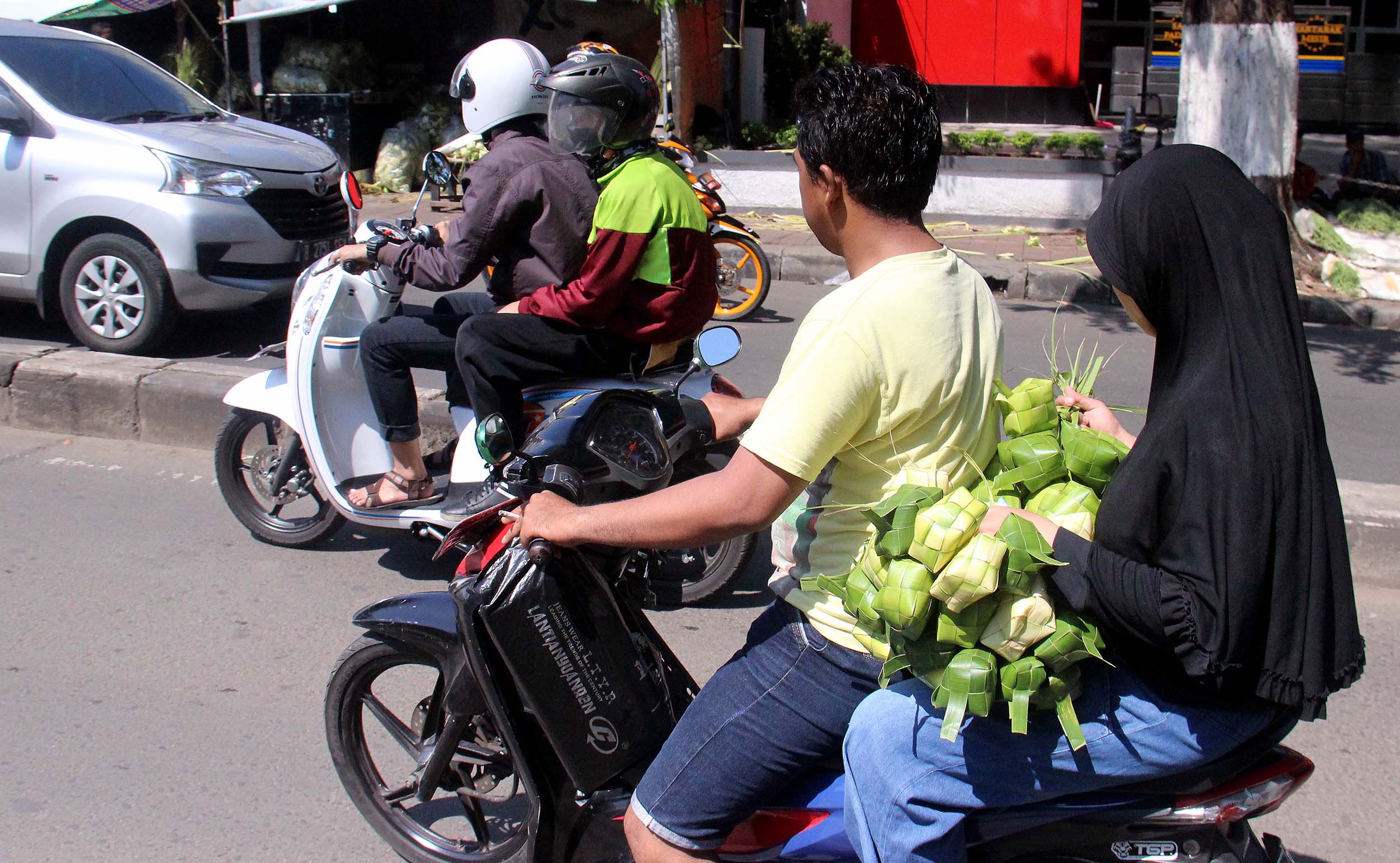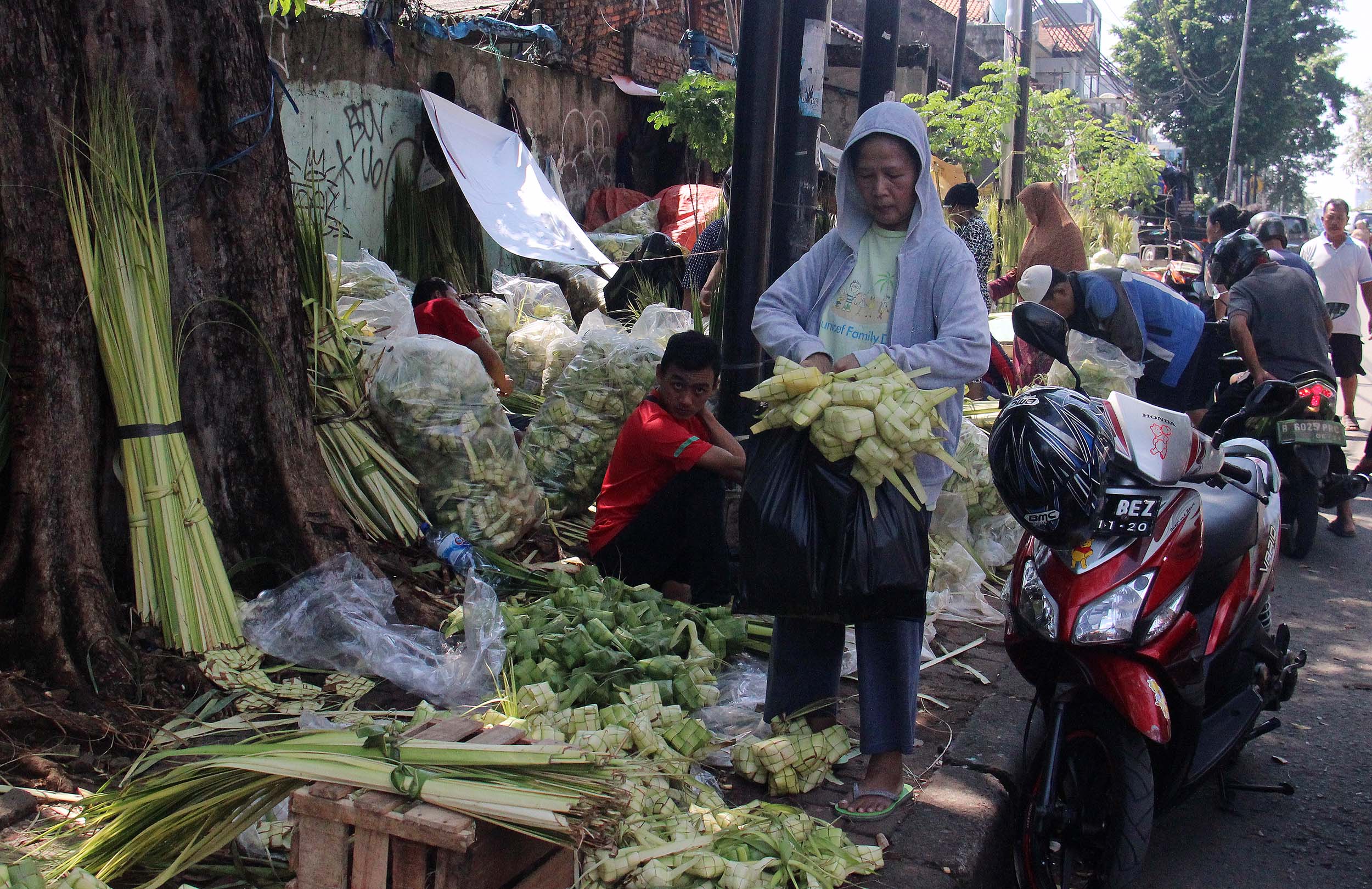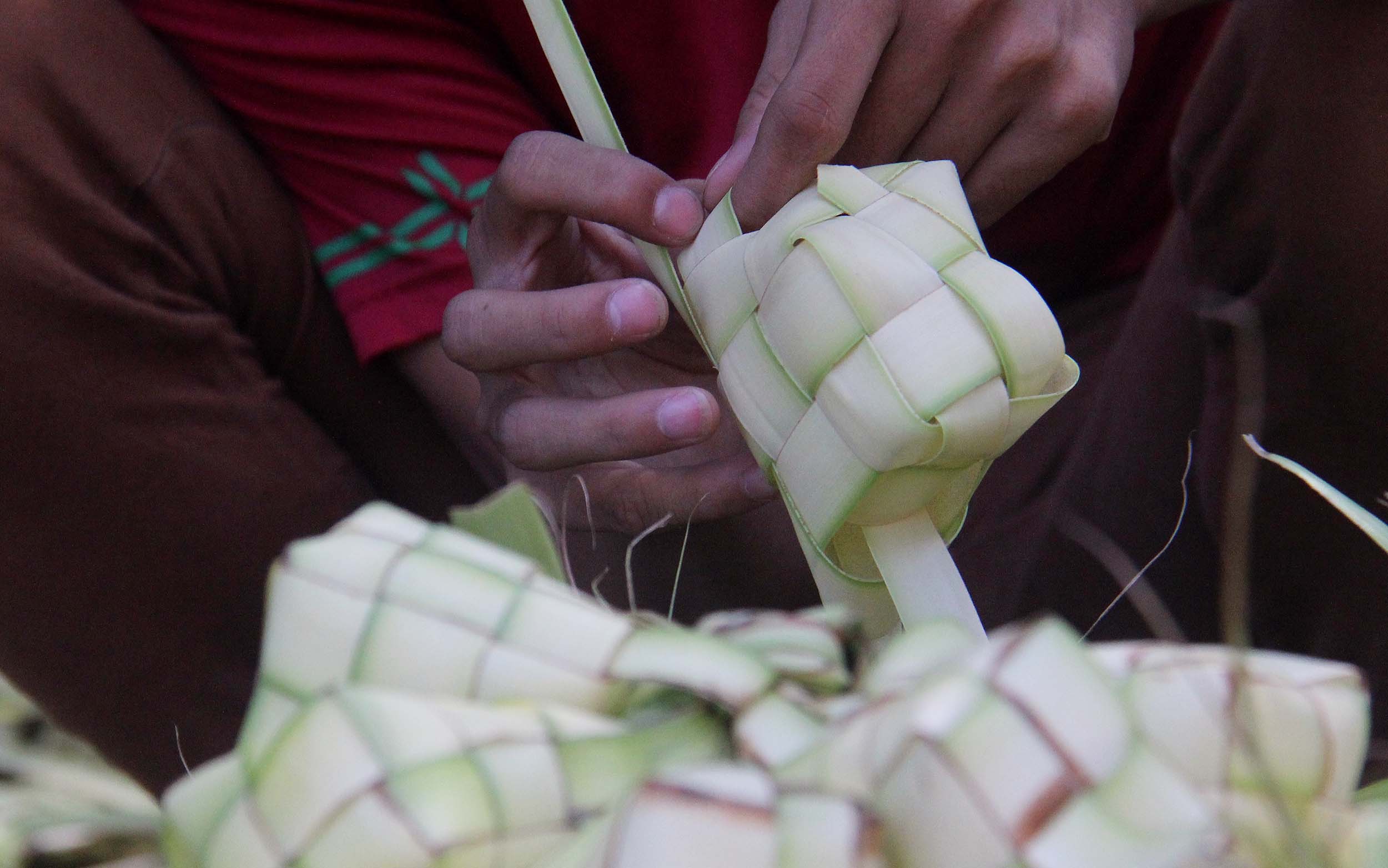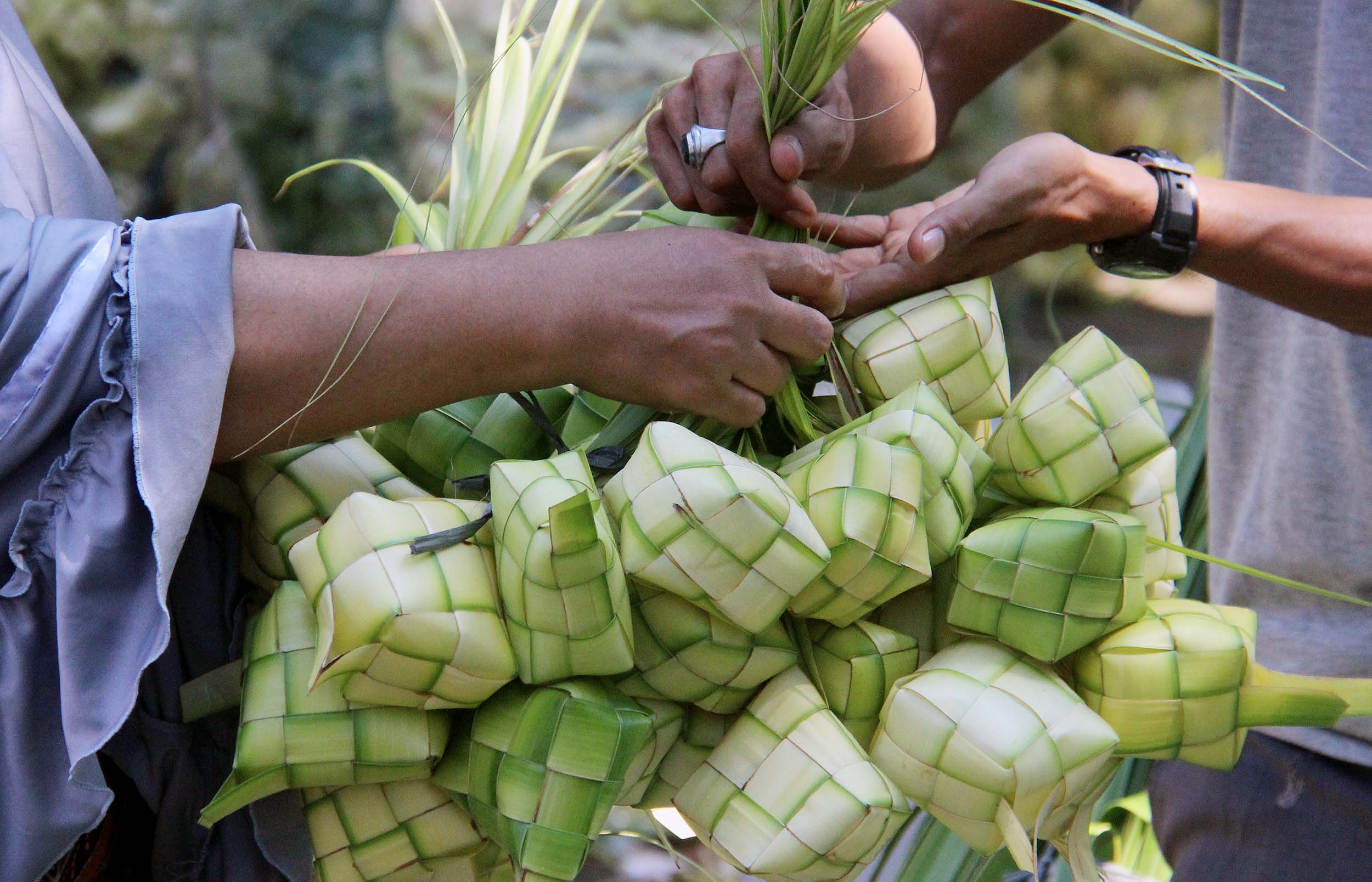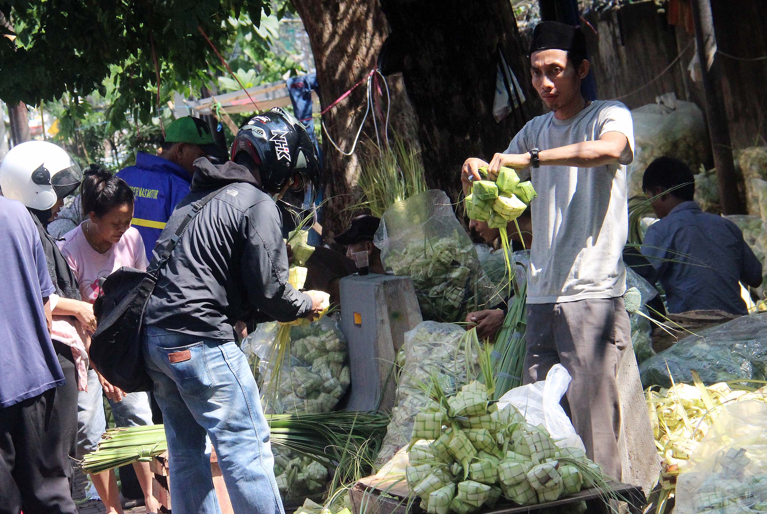 Menjelang perayaan Idul Fitri 1434 H, pedagang kulit ketupat H-2 mulai diramaikan pembeli di jalan Pasar Palmerah Barat, Jakarta, Senin (4/7/2016) . Jelang Hari Raya Idul Fitri 1437 H Permintaan Daun Ketupat Meningkat dengan harga penjualan 1 ikat (Isi 10 daun ketupat) seharga sepuluh ribu rupiah dan Ada cuma membali janurnya saja (daun kelapa yang masih muda) dan ada yang sudah jadi kulit ketupat.