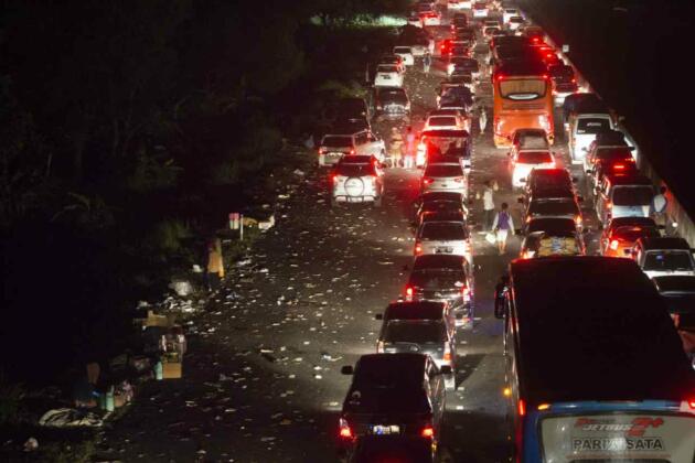 Sampah berserakan di antara kemacetan di arah keluar pintu tol Pejagan, di H-2 Lebaran, Jawa Tengah, Senin pagi (4/7). Pedagang dadakan hadir di tengah kemacetan, karena pemudik kehabisan makanan akibat terjebak di tol selama belasan jam membuat kondisi tol kotor oleh sampah. ANTARA FOTO/Rosa Panggabean/16.