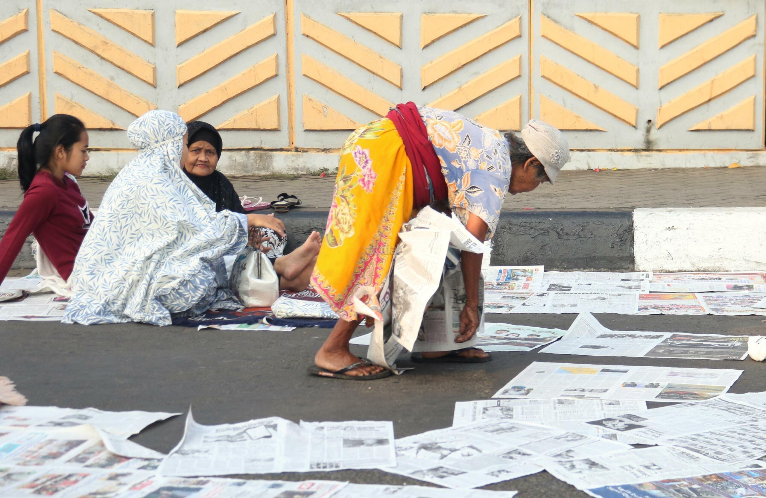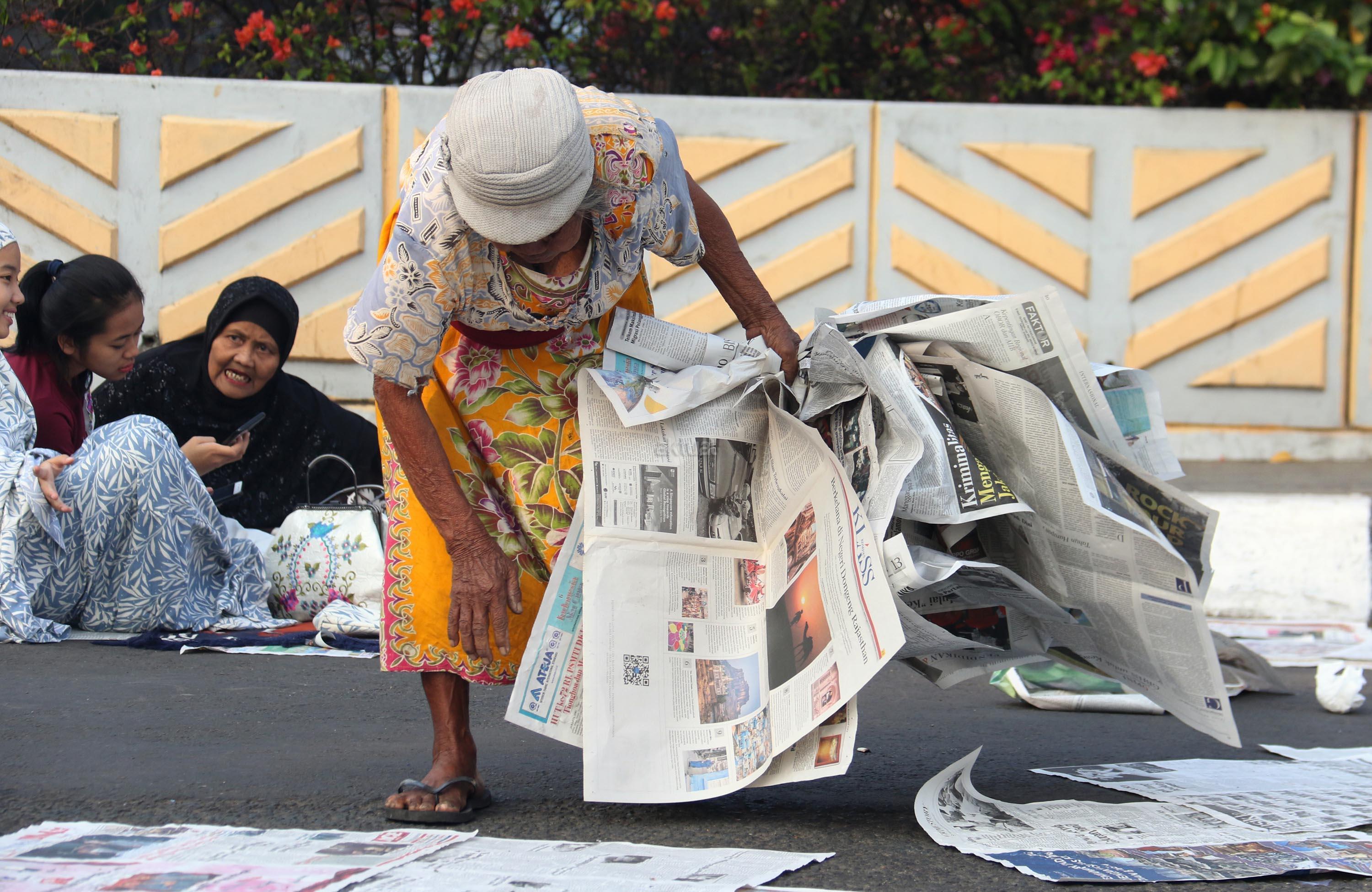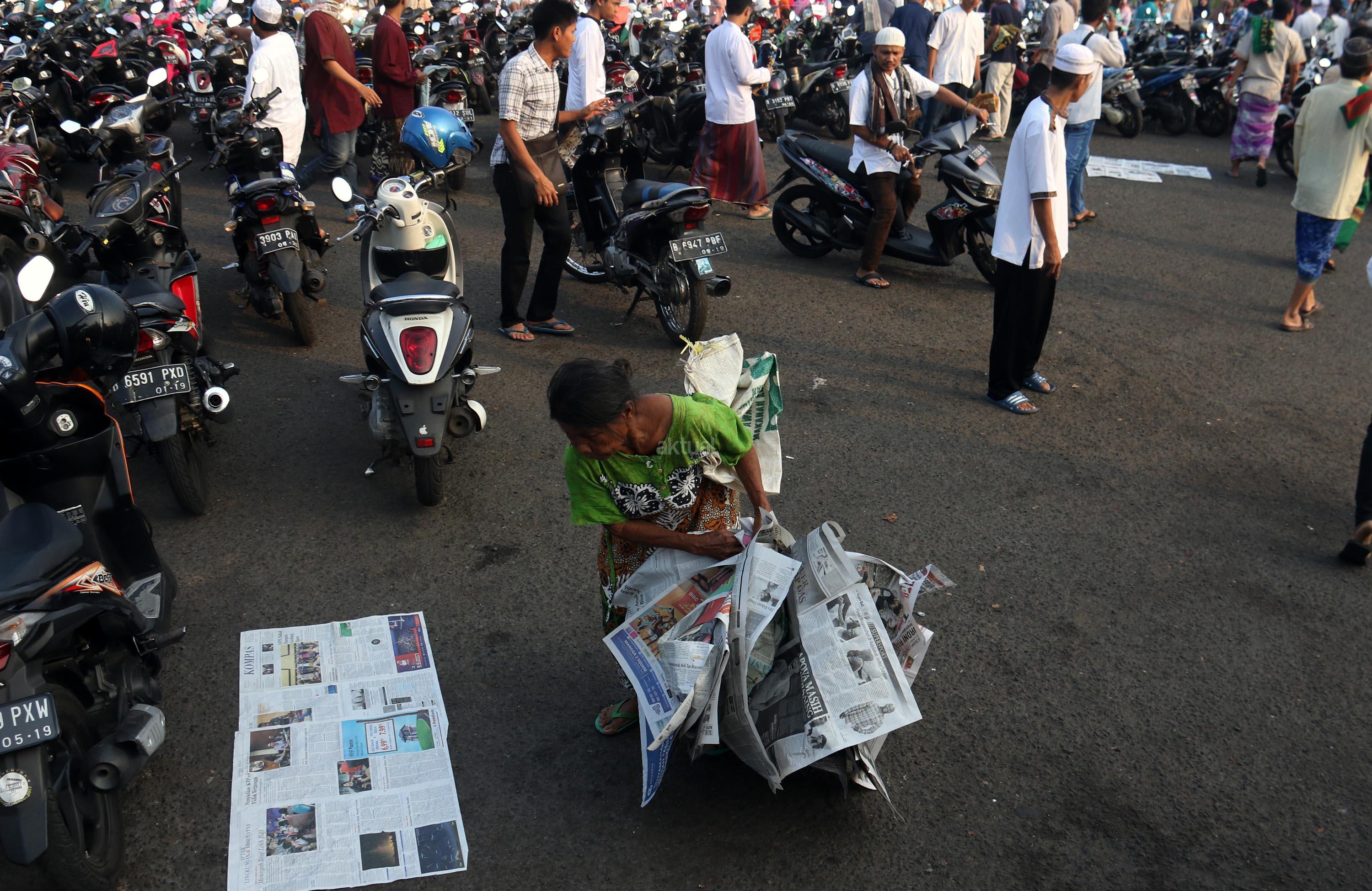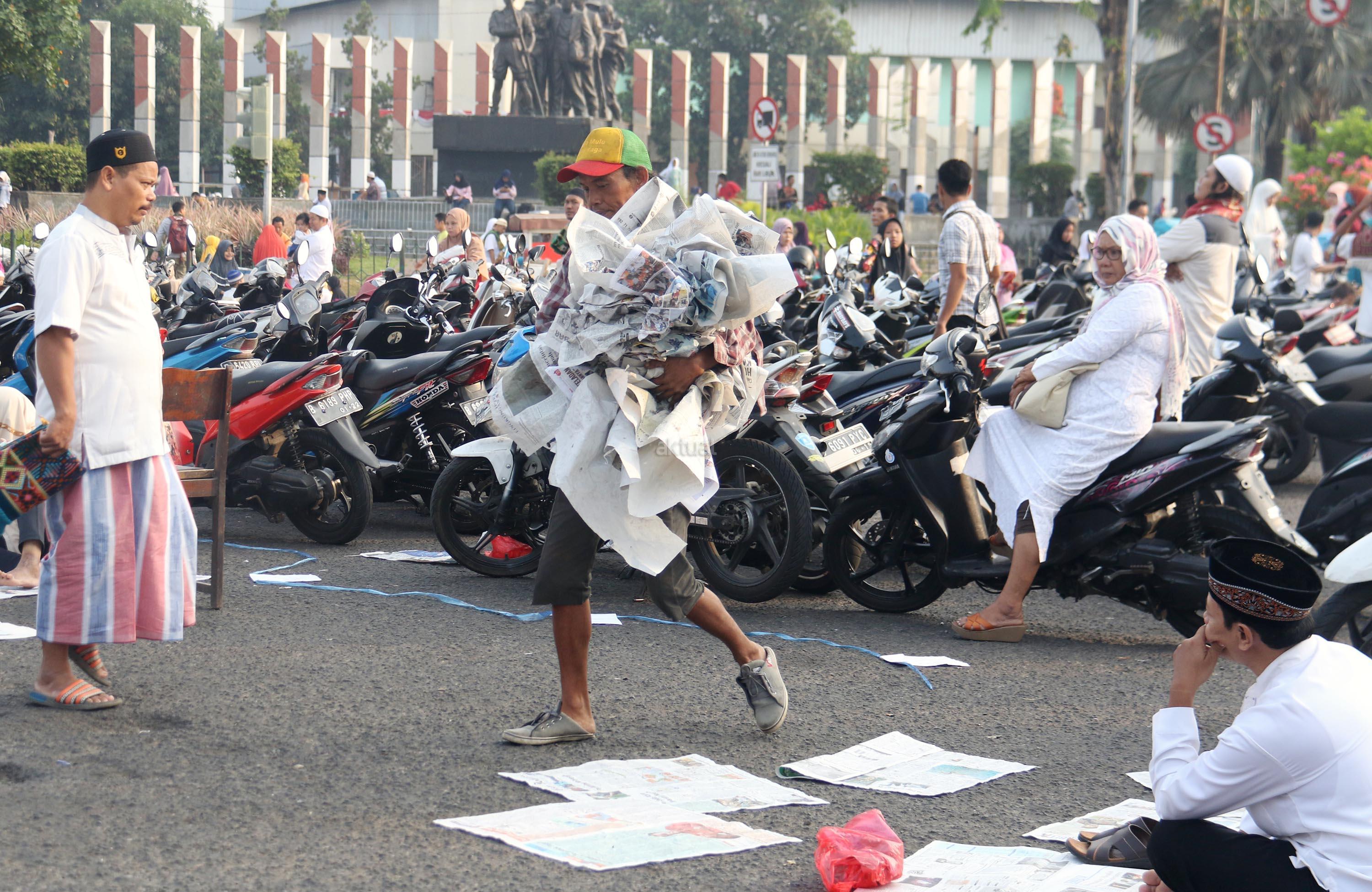 Pemulung mengais sampah koran yang ditinggalkan jemaah usai salat id Idul Adha di kawasan pasar Senen, Jakarta, Jumat (1/9/2017). Usai solat Idul Adha, koran yang digunakan sebagai alas ditinggalkan begitu saja sehingga mengotori jalanan. AKTUAL/Munzir