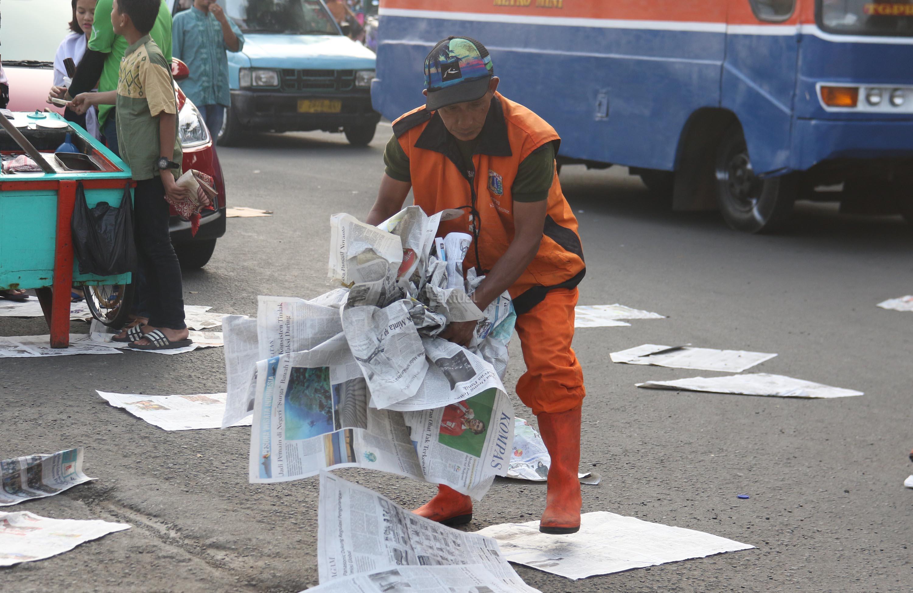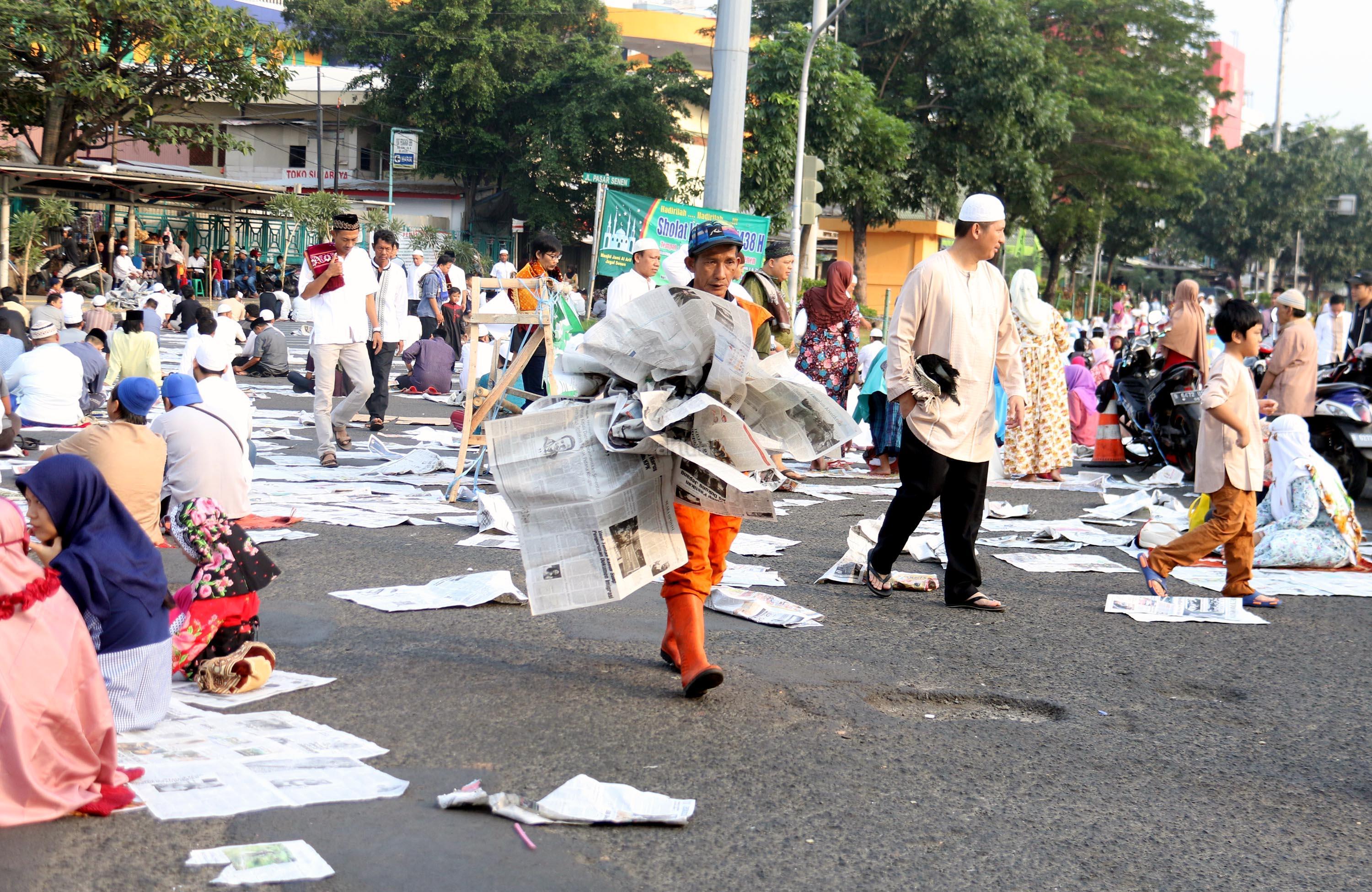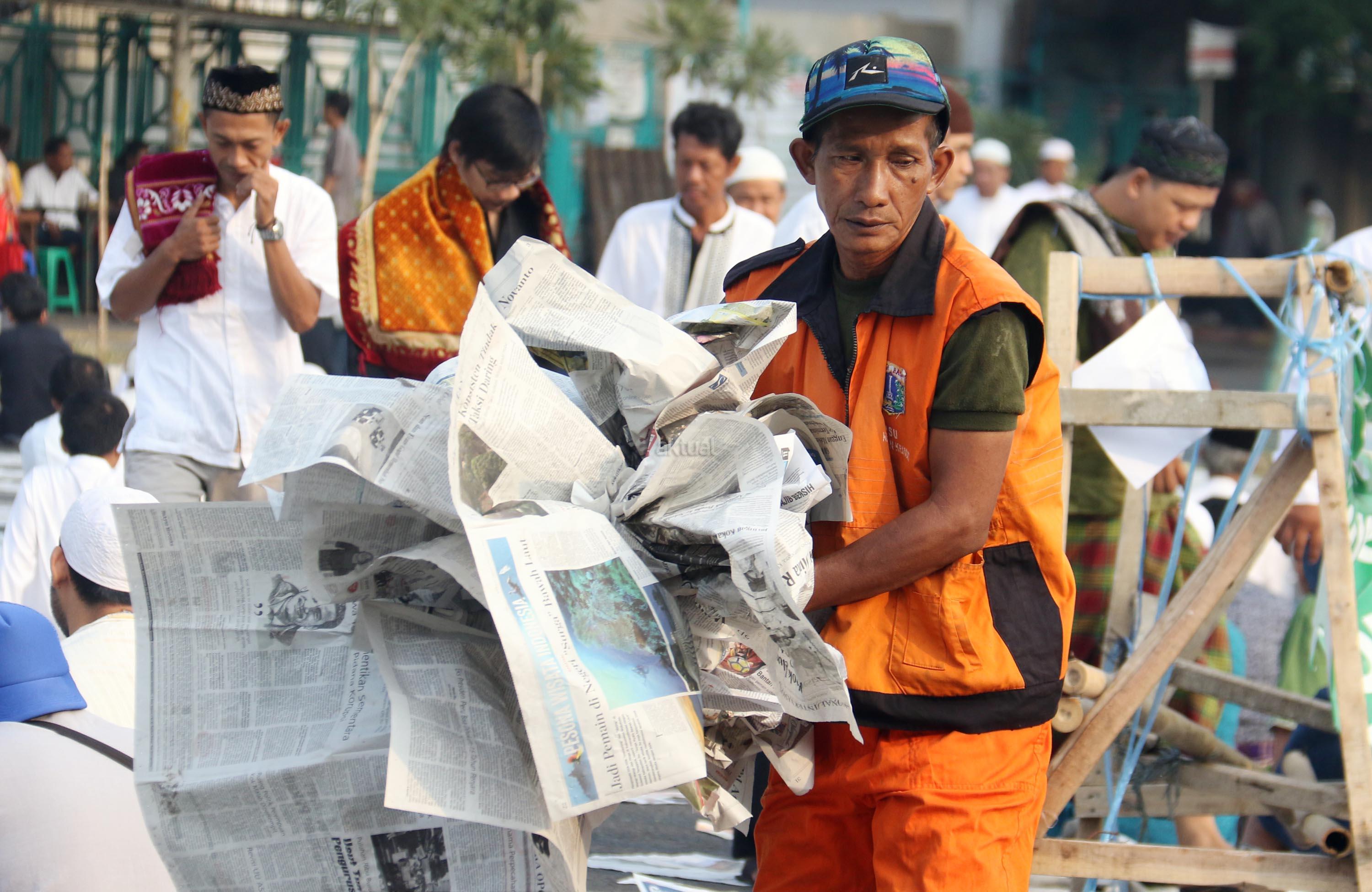 Seorang petugas kebersihan mengumpulkan sampah koran yang ditinggalkan jemaah usai salat id Idul Adha di kawasan pasar Senen, Jakarta, Jumat (1/9/2017). Usai solat Idul Adha, koran yang digunakan sebagai alas ditinggalkan begitu saja sehingga mengotori jalanan. AKTUAL/Munzir