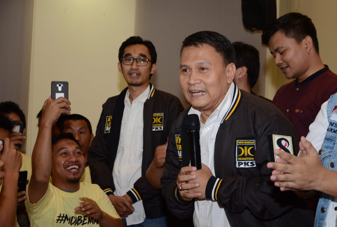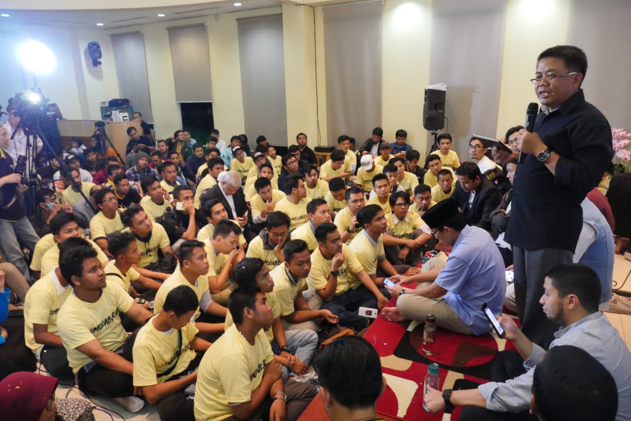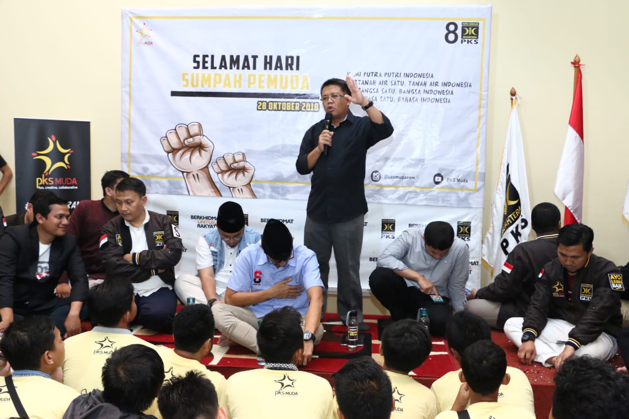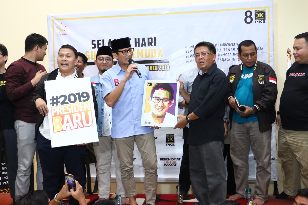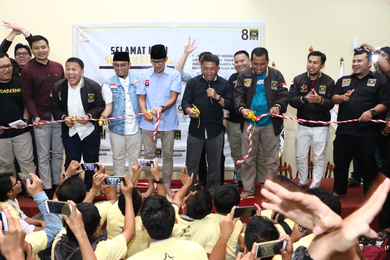 Presiden PKS Mohamad Sohibul Iman bersama Calon Wakil Presiden Sandiaga Uno saat acara Milad ke 1 tahun, PKS Muda gelar kegiatan bertema "Milenial Bergerak Menangkan Indonesia" di MD Building, DPP PKS, Tb. Simatupang, Jakarta Selatan, Ahad (28/10/2018). PKS muda yang sudah memiliki kurang lebih 285 chapter dan tersebar di 22 Provinsi ini berharap agar di milad ke-1 PKS Muda menjadi wajah baru PKS yang dapat diterima oleh semua golongan. Selain itu sebagai wadah tempat berkumpulnya anak-anak muda yg kreatif, yang mau berkontribusi, kemudian dia mau membuat karya-karya yang positif, dan juga mau bergerak untuk kebaikan bangsa Indonesia. AKTUAL/HO