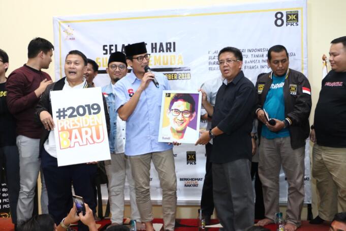 Presiden PKS Mohamad Sohibul Iman bersama Calon Wakil Presiden Sandiaga Uno saat acara Milad ke 1 tahun, PKS Muda gelar kegiatan bertema "Milenial Bergerak Menangkan Indonesia" di MD Building, DPP PKS, Tb. Simatupang, Jakarta Selatan, Ahad (28/10/2018). PKS muda yang sudah memiliki kurang lebih 285 chapter dan tersebar di 22 Provinsi ini berharap agar di milad ke-1 PKS Muda menjadi wajah baru PKS yang dapat diterima oleh semua golongan. Selain itu sebagai wadah tempat berkumpulnya anak-anak muda yg kreatif, yang mau berkontribusi, kemudian dia mau membuat karya-karya yang positif, dan juga mau bergerak untuk kebaikan bangsa Indonesia. AKTUAL/HO