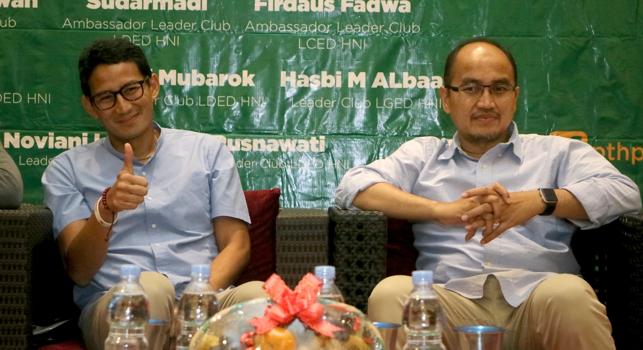 Cawapres Sandiaga Uno bersama politikus PKS yang juga Direktur Halal Network International (HNI) Agung Yulianto saat menghadiri seminar di Bekasi, Jawa Barat, Kamis (15/11/2018). Agung merupakan kader PKS yang disebut bakal diajukan sebagai calon Wagub DKI Jakarta. Dalam seminar tersebut, Sandiaga membahas bisnis dan ekonomi Indonesia di tahun 2019 hingga yang akan datang. AKTUAL/HO