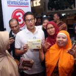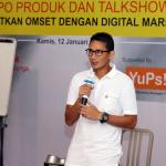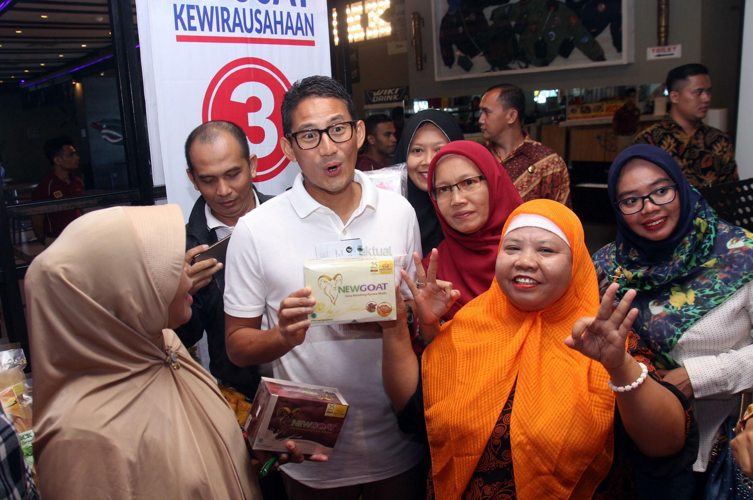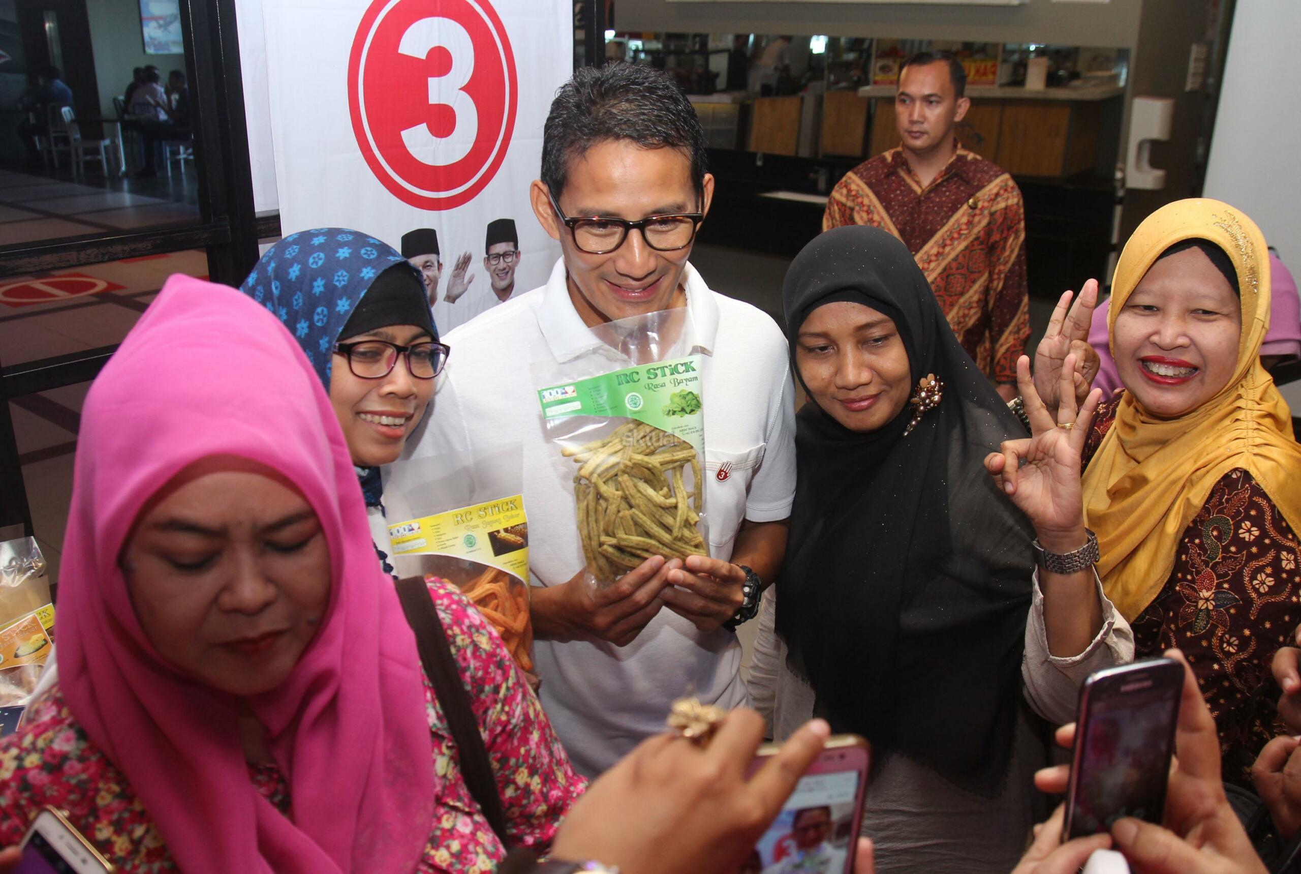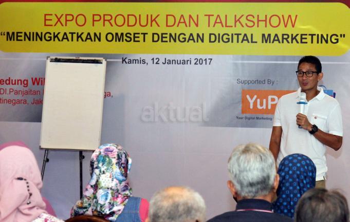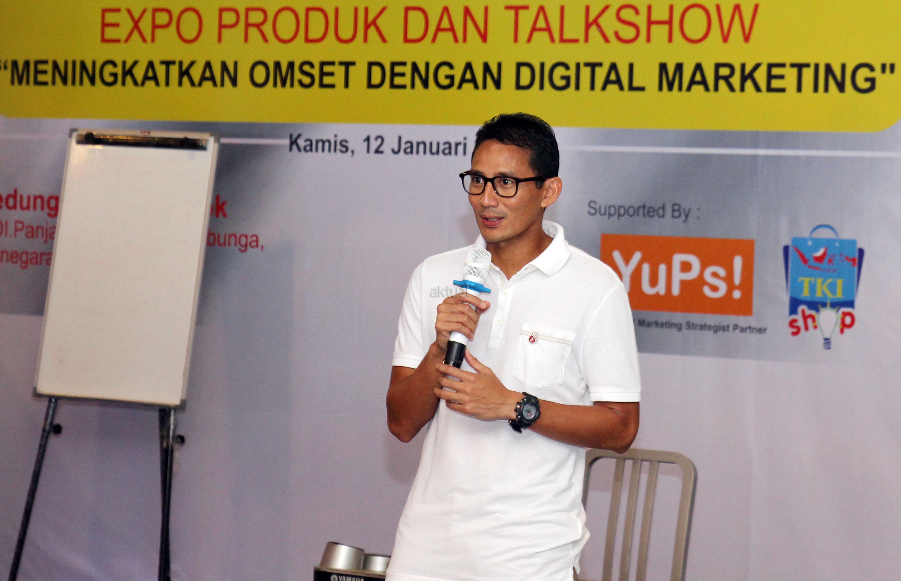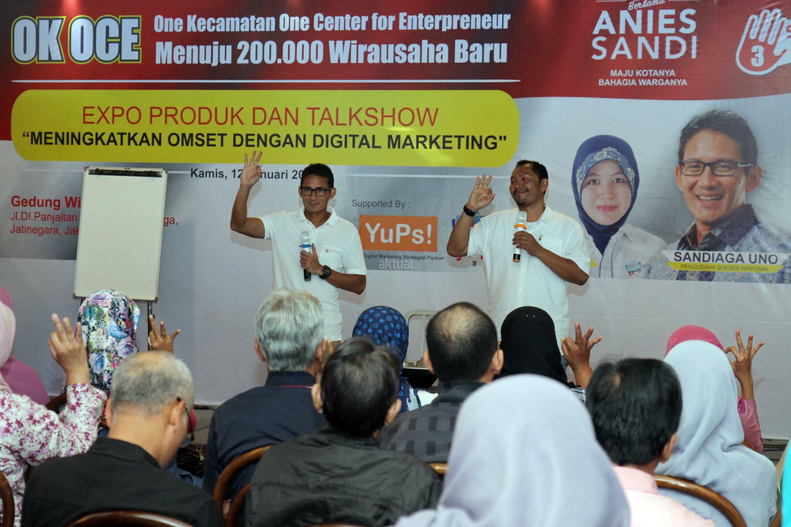 Calon Wakil Gubernur DKI Jakarta no urut 3 Sandiaga Uno menyampaikan visi dan misinya dihadapan pelaku usaha UMKM (Usaha Mikro Kecil Menengah) di Best Western, Cawang, Jakarta, Kamis (12/1). Pasangan Anis-Sandi dalam Pilkada DKI Jakarta mengusung program OK OCE ! (One Kecamatan One Center of Entrepreneur) bagi pelaku usaha UMKM warga ibukota Jakarta. AKTUAL/Tino Oktaviano
