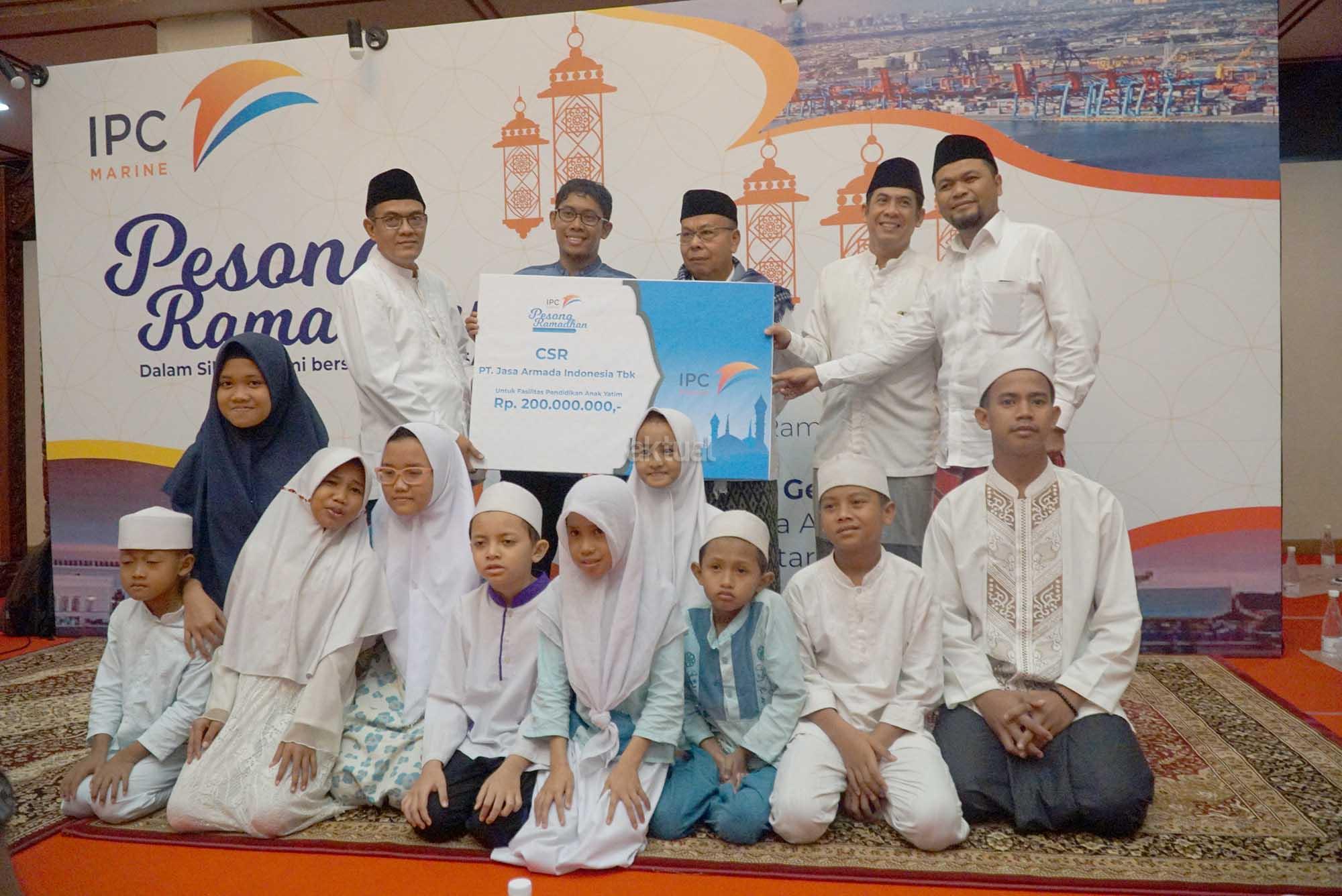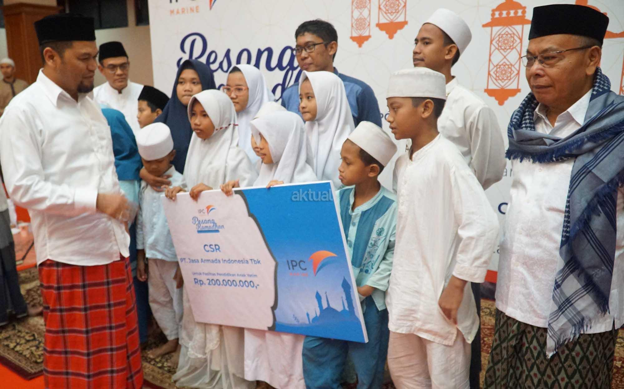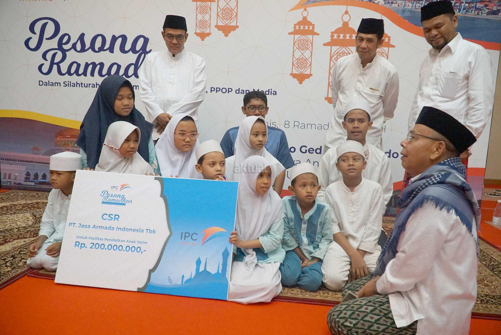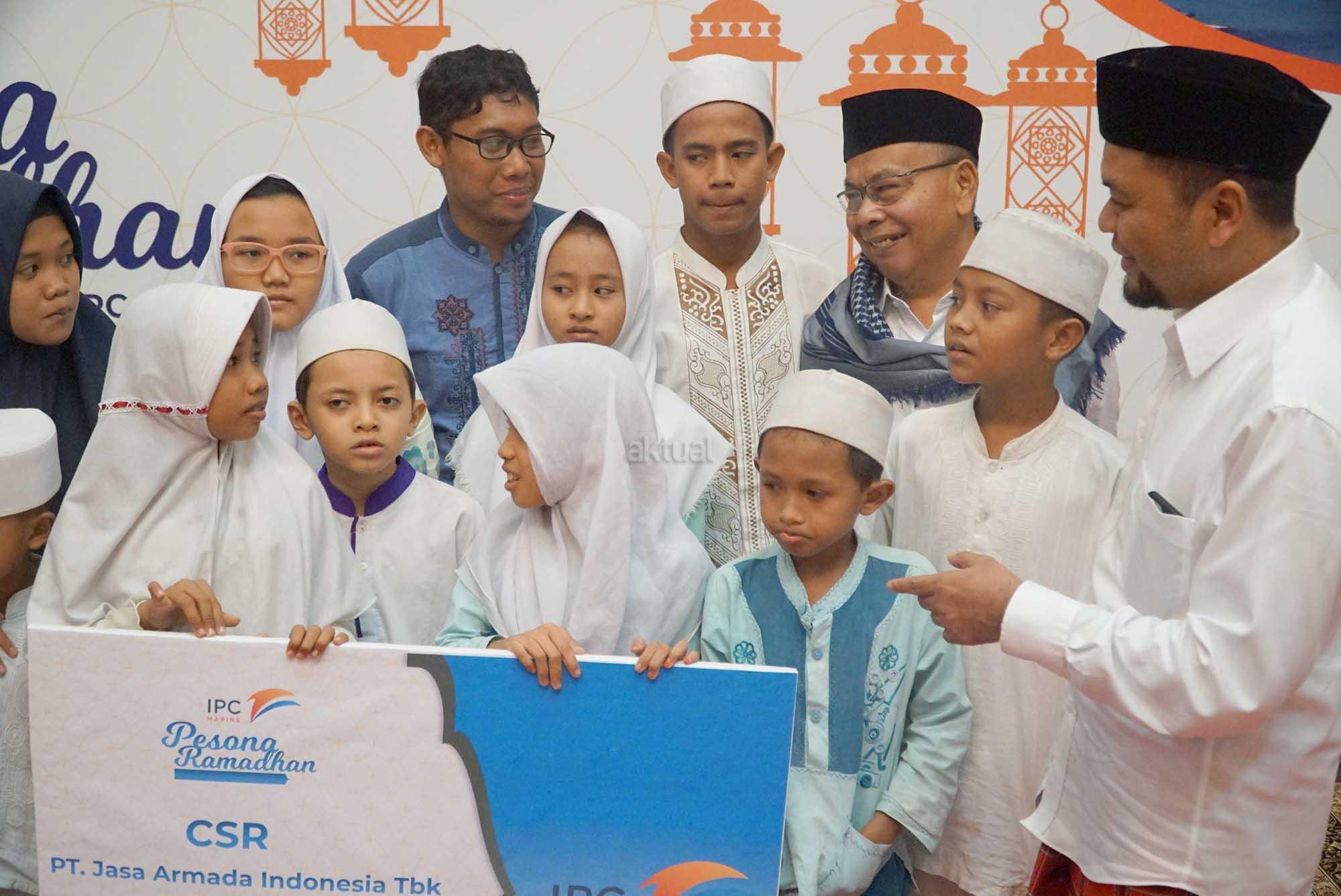 Direktur Utama PT Jasa Armada Indonesia Tbk, Dawam Atmosudiro (kanan) didampingi jajaran direksi lainnya berbincang dengan para penerima santunan dan yatim piatu disela penyerahan dana program csr untuk sarana pendidikan anak yatim piatu dan kaum dhuafa di Jakarta, Kamis (24/5). Perusahaan yang bergerak dalam bidang jasa pelabuhan yang terdiri dari layanan pilotage dan towage itu memberikan santunan sebesar Rp 200 juta sebagai bentuk dari komitmen perseroan untuk mendukung pendidikan dan pencegahan resiko. AKTUAL/Eko S Hilman