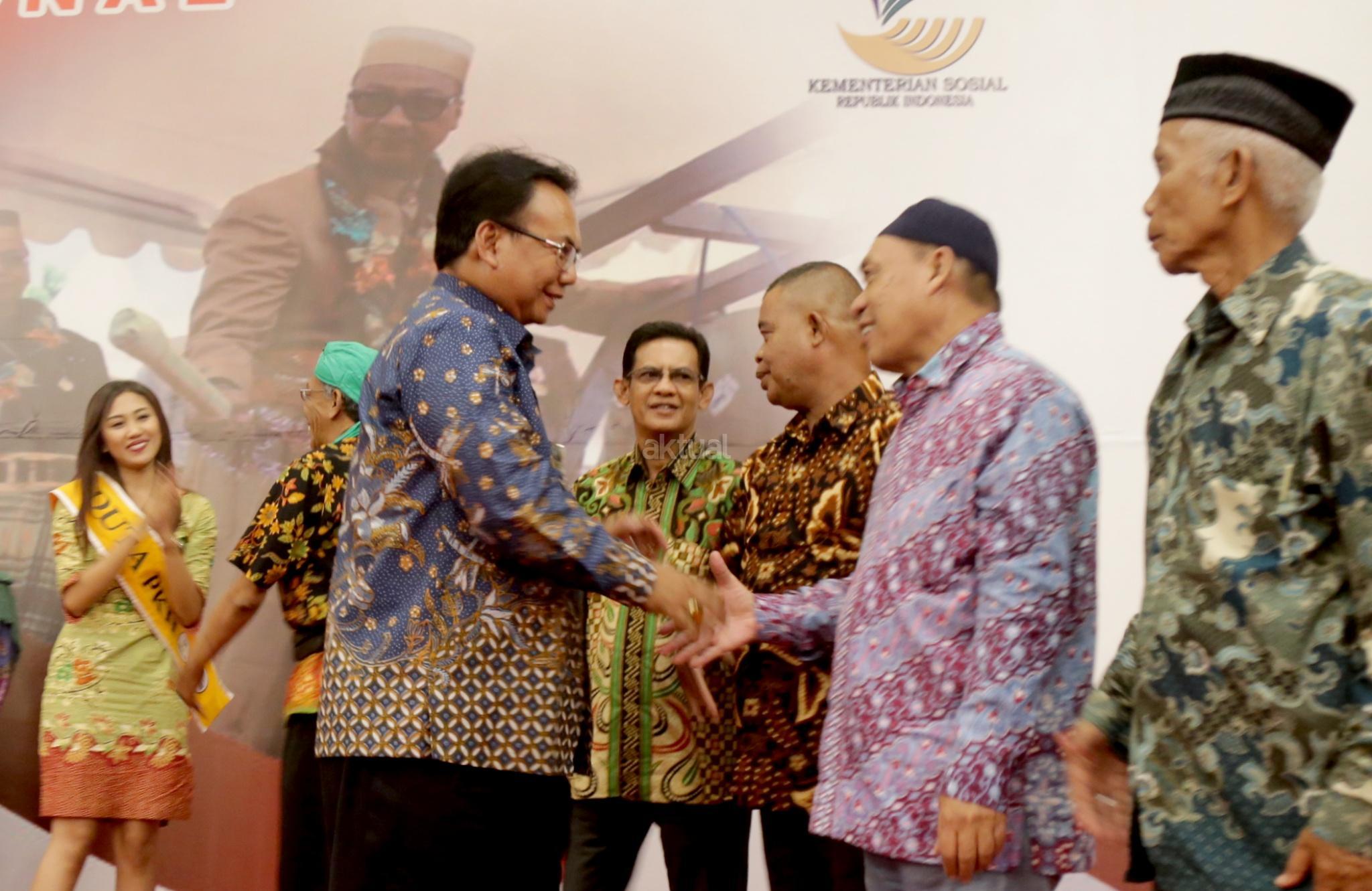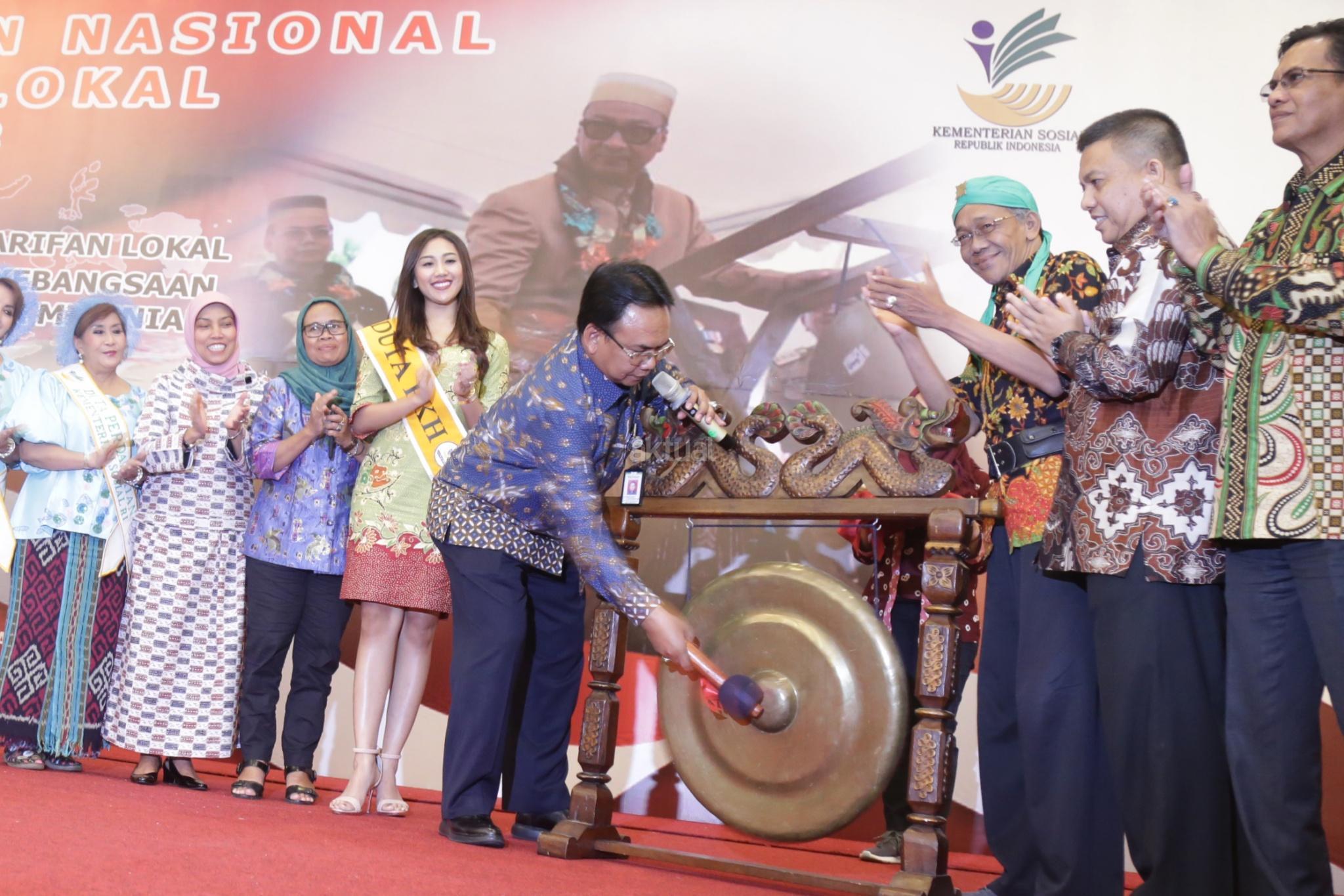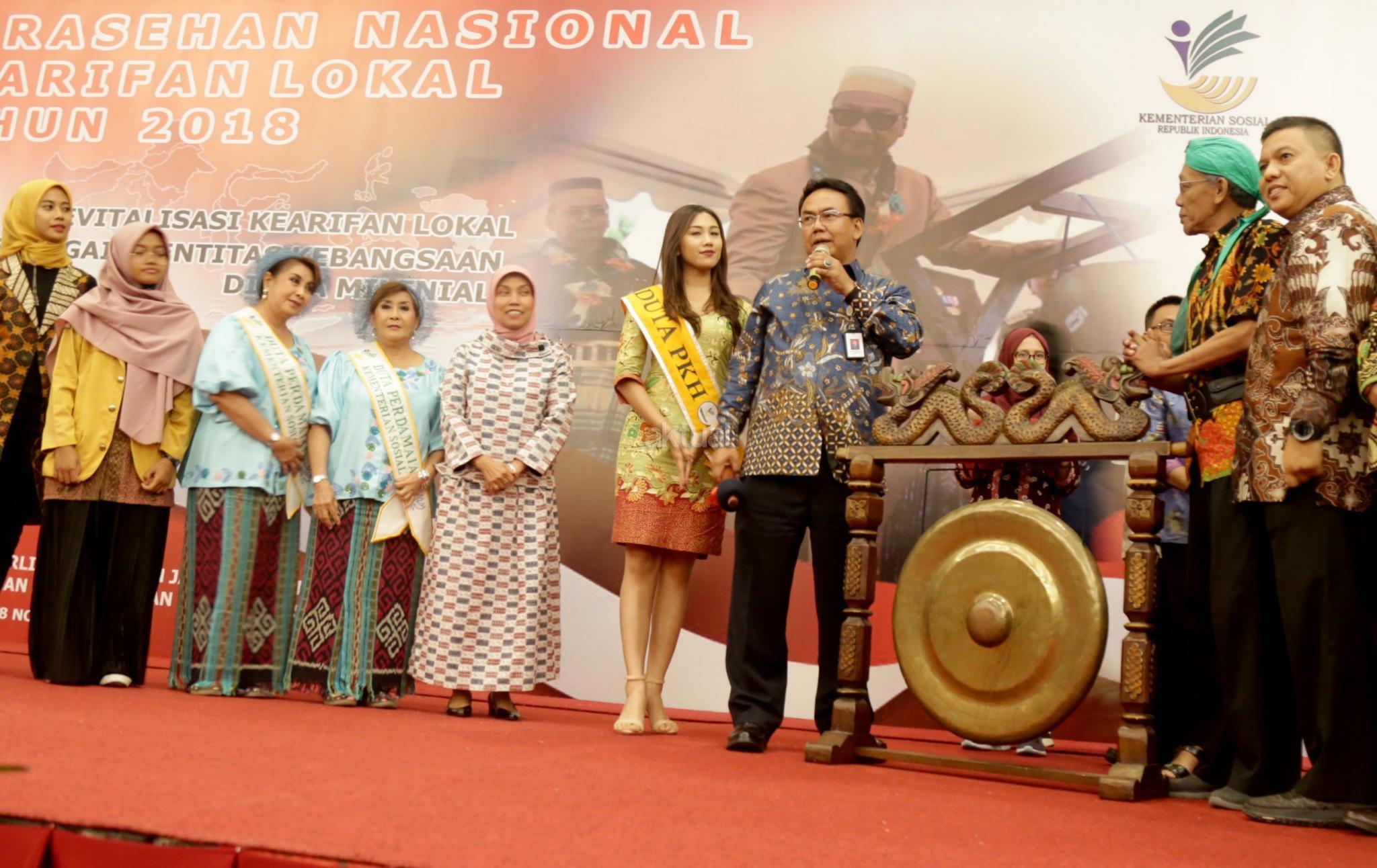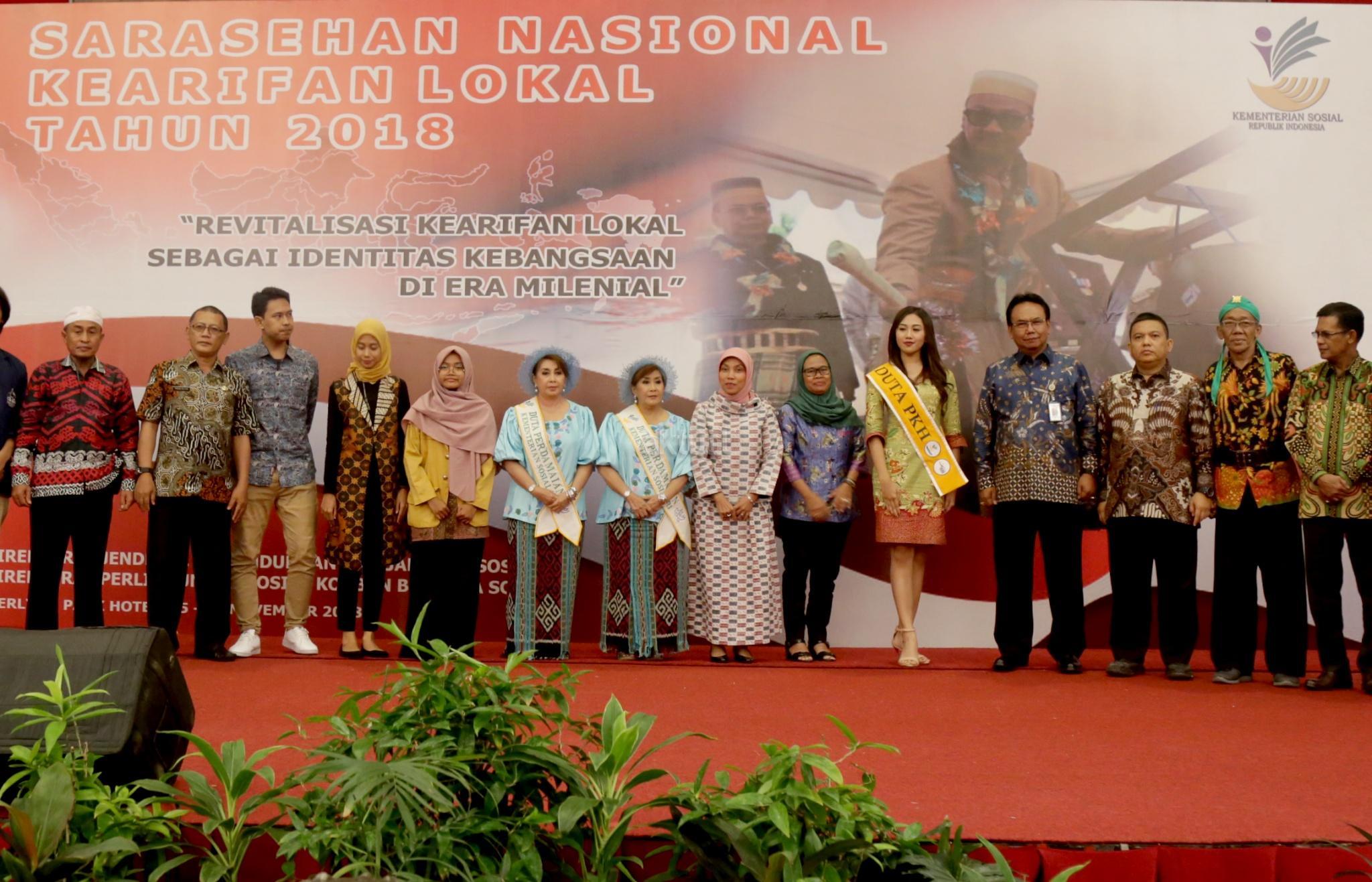 Dirjen Perlindungan dan Jaminan Sosial Kemensos RI Harry Hikmat (ketiga kanan), bersama Direktur Perlindungan Sosial Korban Bencana Sosial Nurul Farijati (tengah) dan duta PKH, saat menghadiri Sarasehan Nasional Kearifan Lokal di Jakarta, Selasa (27/11). Kegiatan yang dihadiri sejumlah elemen masyarakat, Kemensos berharap dapat meningkatkan komitmen peserta, untuk mencegah terjadinya konflik di masyarakat. AKTUAL/Tino Oktaviano