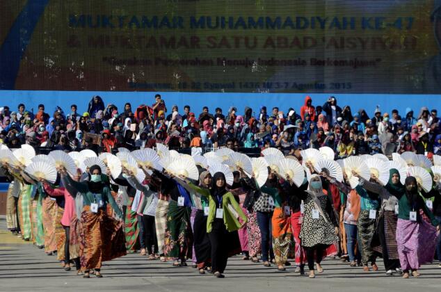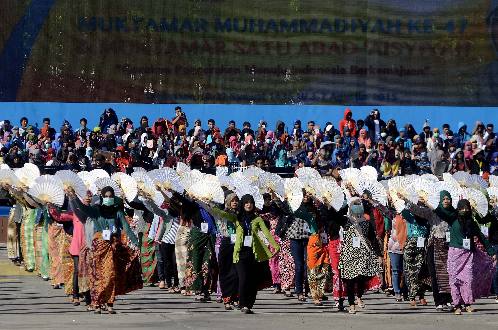 Penari mempertunjukkan tarian kolosal empat etnis Sulsel pada gladi bersih pembukaan Muktamar ke-47 Muhammadiyah di Lapangan Karebosi, Makassar, Sulawesi Selatan, Minggu (2/8). Sebanyak 800 penari akan mementaskan tarian kolosal empat etnis yakni Makassar, Bugis, Mandar dan Toraja untuk memeriahkan pembukaan Muktamar ke-47 Muhammadiyah dan Muktamar Satu Abad Aisyiyah pada 3 Agustus 2015. ANTARA FOTO/Sahrul Manda Tikupadang/ama/15