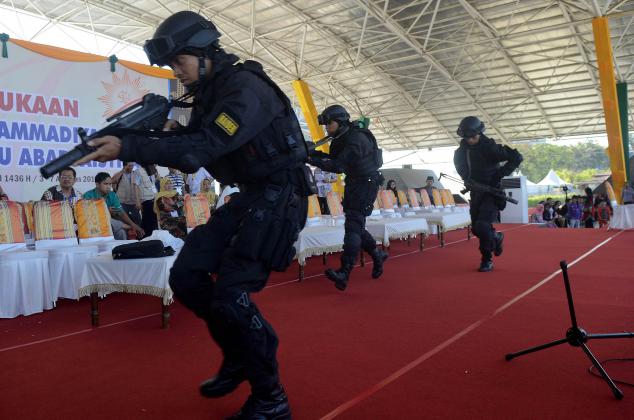 Pasukan anti teror Yonif 700 Raider Kodam VII Wirabuana melakukan simulasi pengamanan presiden di arena pembukaan Muktamar ke-47 Muhammadiyah di Lapangan Karebosi, Makassar, Sulawesi Selatan, Minggu (2/8). Presiden Joko Widodo menurut rencana akan menghadiri pembukaan Muktamar ke-47 Muhammadiyah dan Muktamar Satu Abad Aisyiyah di Makassar pada 3 Agustus 2015. ANTARA FOTO/Sahrul Manda Tikupadang/ama/15