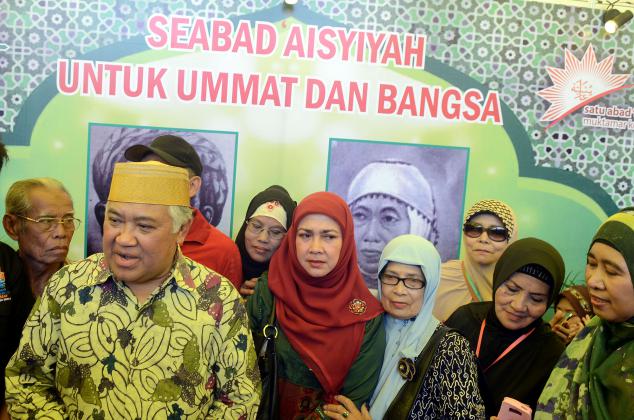 Ketua Umum PP Muhammadiyah, Din Syamsuddin (kiri) mengunjungi stand pameran Aisyiyah di Monomen Mandala, Makassar, Sulawesi Selatan, Minggu (2/8). Aisyiyah salah satu organisasi otonom Wanita Muhammadiyah yang bergerak dalam bidang sosial, pendidikan, kesehatan dan keagamaan menggelar sejumlah kegiatan guna menopang kegiatan Muktamar ke-47 Muhammadiya dan Muktamar Satu Abad Aisyiyah di Makassar 3-7 Agustus 2015. ANTARA FOTO/Sahrul Manda Tikupadang/ama/15