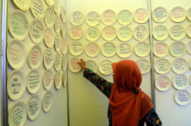 Simpatisan Muhammadiyah menempelkan pesan harapan di stand pameran Aisyiyah di Monomen Mandala, Makassar, Sulawesi Selatan, Minggu (2/8). Aisyiyah salah satu organisasi otonom Wanita Muhammadiyah yang bergerak dalam bidang sosial, pendidikan, kesehatan dan keagamaan menggelar sejumlah kegiatan guna menopang kegiatan Muktamar ke-47 Muhammadiya dan Muktamar Satu Abad Aisyiyah di Makassar 3-7 Agustus 2015. ANTARA FOTO/Sahrul Manda Tikupadang/ama/15