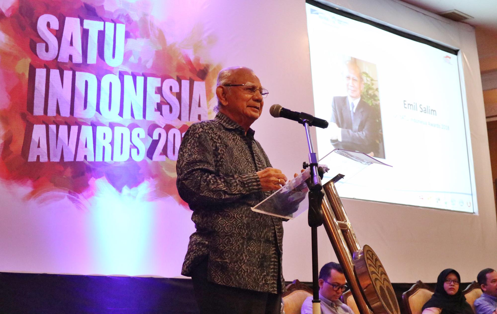 Prof. Emil Salim, dosen Ilmu Lingkungan Pasca Sarjana Universitas Indonesia, sekaligus Dewan Juri SATU Indonesia Awards 2018 mengobarkan semangat kepada para peserta bincang inspiratif yang juga dihadiri oleh Head of Corporate Communications PT Astra International Tbk Boy Kelana Soebroto, Head of Environment & Social Responsibility PT Astra International Tbk Riza Deliansyah serta para penerima apresiasi SATU Indonesia Awards 2017 Triana Rahmawati dan penerima apresiasi SATU Indonesia Awards 2016 Muhammad Aripin di Samarinda, Kalimantan Timur, Kamis (12/7). PT Astra International Tbk kembali menyebarkan inspirasi SATU Indonesia Awards 2018 yang dikemas dalam sebuah bincang inspiratif dalam rangka menyosialisasikan program Semangat Astra Terpadu Untuk Indonesia (SATU Indonesia) Awards 2018. AKTUAL/Eko S Hilman