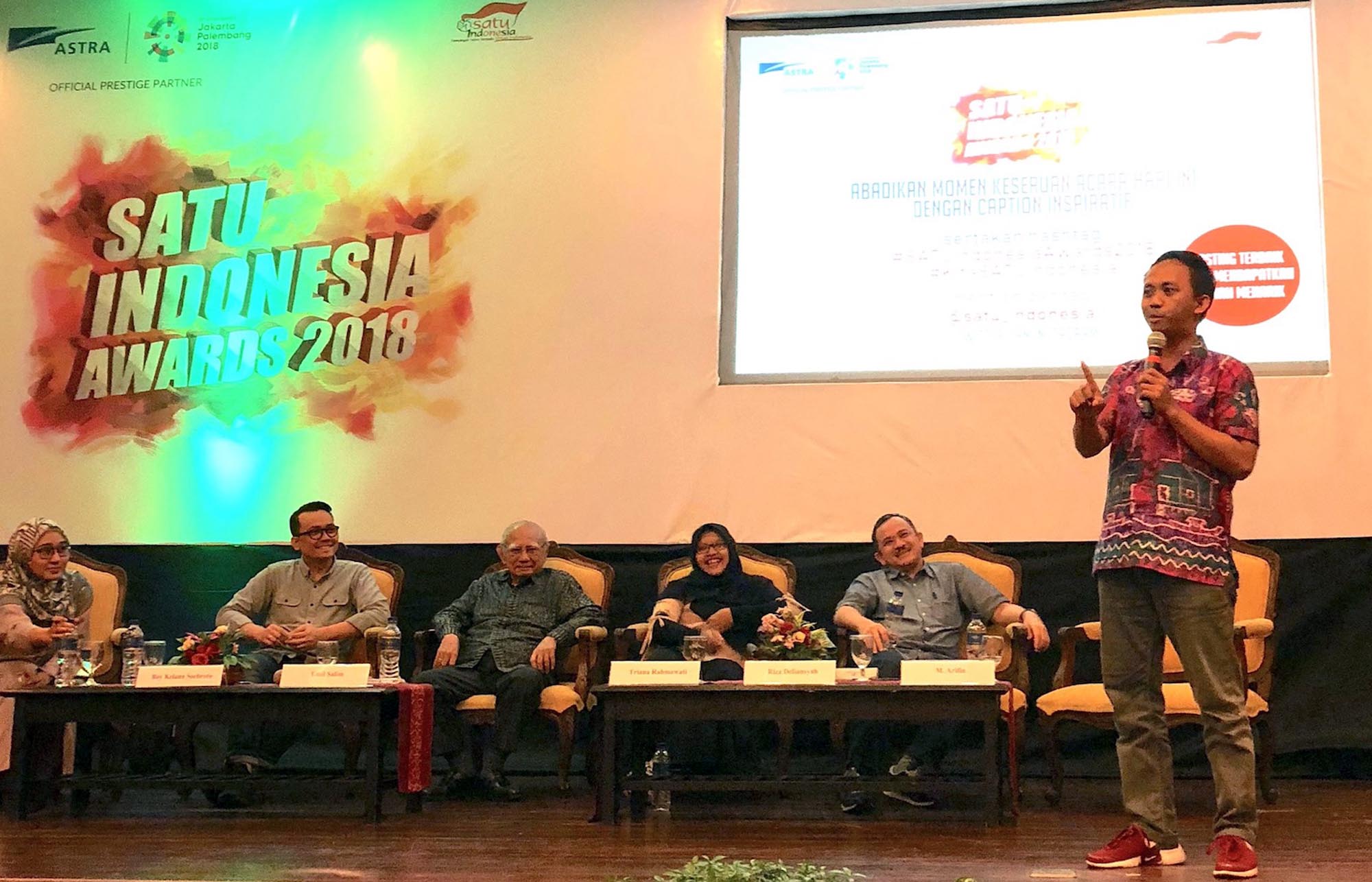 Penerima apresiasi SATU Indonesia Awards 2016 yang merupakan putra daerah Kalimantan Muhammad Aripin (berdiri), penerima apresiasi SATU Indonesia Awards 2016 dan penerima apresiasi SATU Indonesia Awards 2017 Triana Rahmawati (duduk, kedua dari kanan) berbagi pengalamannya didampingi Dewan Juri SATU Indonesia Awards 2018 Prof. Emil Salim (duduk, ketiga dari kiri) yang juga Dosen Ilmu Lingkungan Pasca Sarjana Universitas Indonesia, Head of Corporate Communications PT Astra International Tbk Boy Kelana Soebroto (duduk, kedua dari kiri) dan Head of Environment & Social Responsibility PT Astra International Tbk Riza Deliansyah (duduk, pertama dari kanan) di Samarinda, Kalimantan Timur, Kamis (12/7). PT Astra International Tbk kembali menyebarkan inspirasi SATU Indonesia Awards 2018 yang dikemas dalam sebuah bincang inspiratif dalam rangka menyosialisasikan program Semangat Astra Terpadu Untuk Indonesia (SATU Indonesia) Awards 2018. AKTUAL/Eko S Hilman