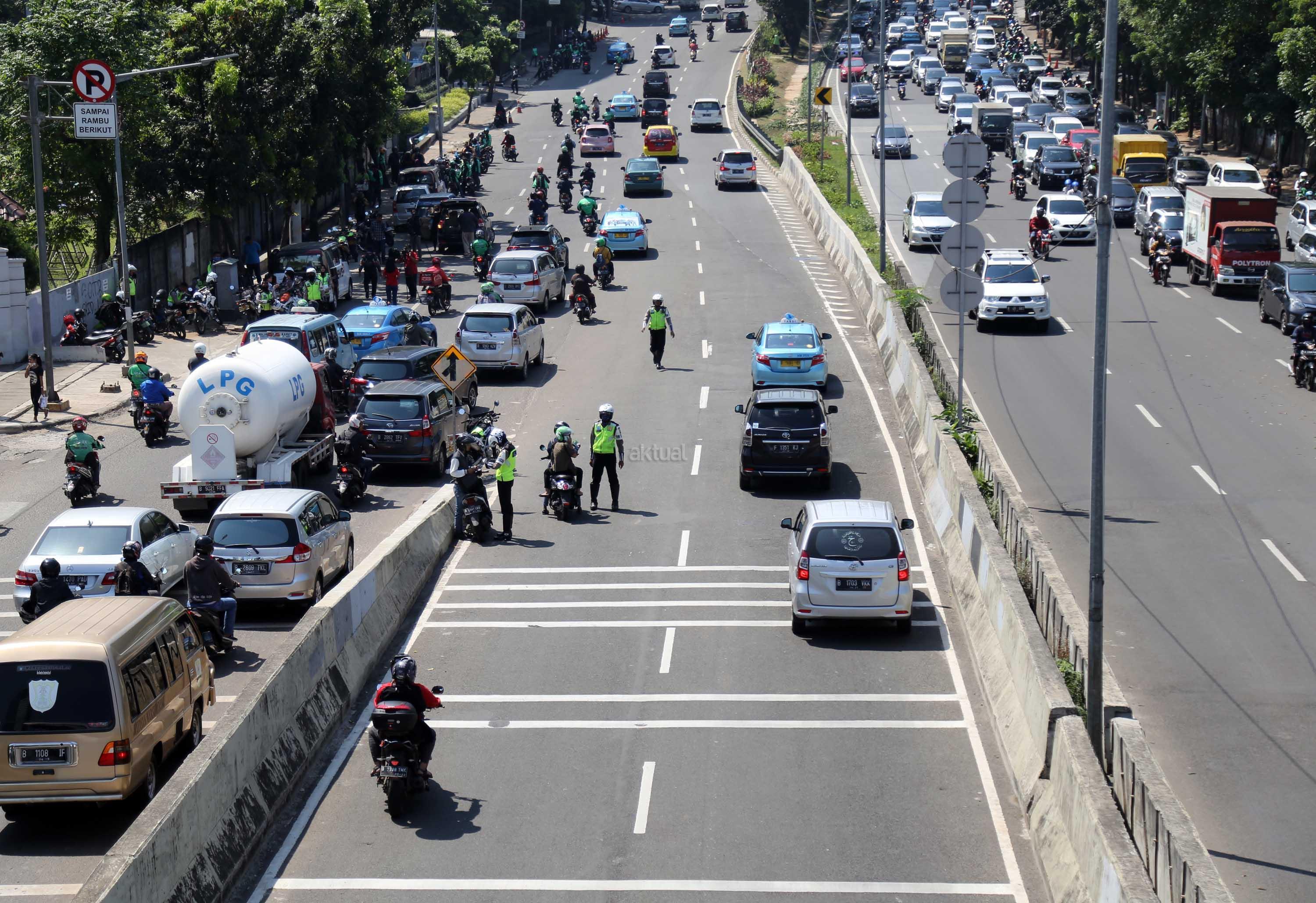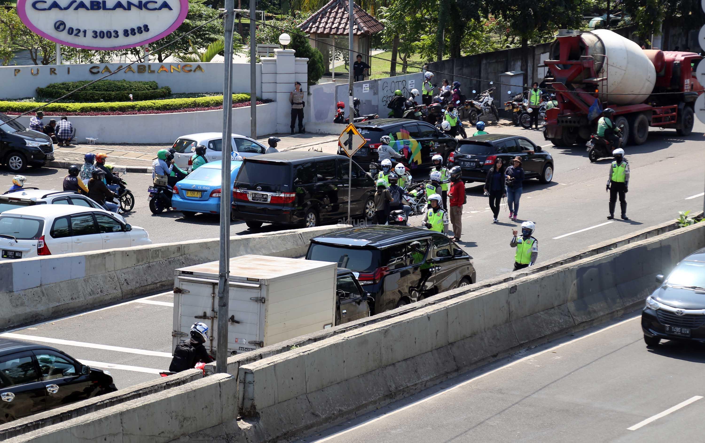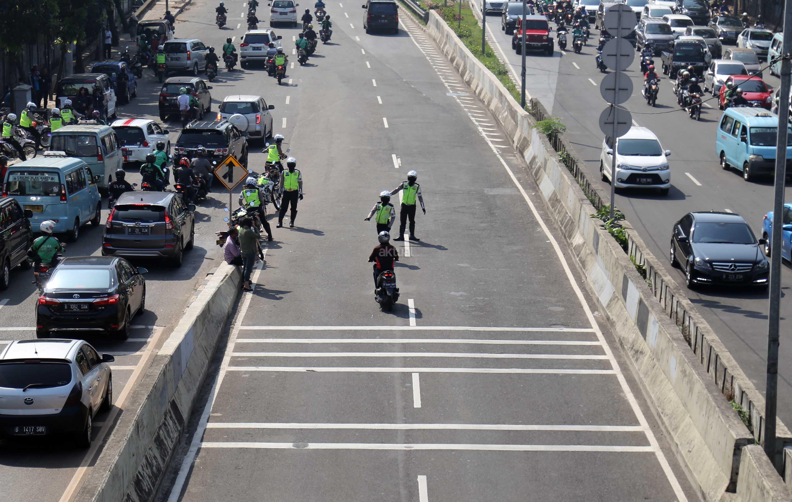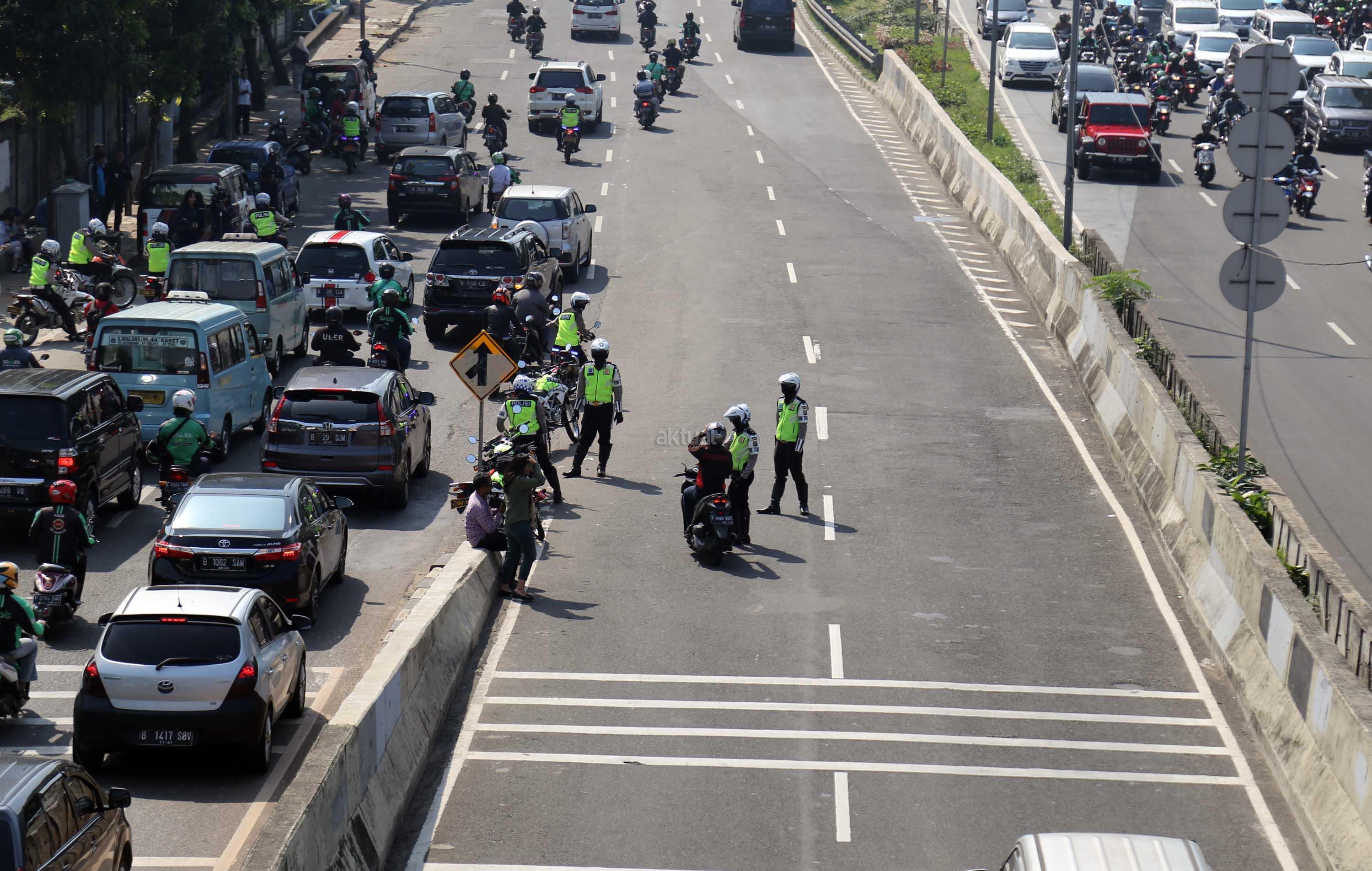 Pengendara sepeda melawan arah menghindari razia yang dilakukan Petugas Satuan Ketertiban dan Kelancaran (Tibcar) lalu lintas Polda Metro Jaya motor yang melintasi Jalan Layang Non Tol Casablanca, Jakarta Selatan, Rabu (26/7). Razia dilakukan untuk membuat jalan layang itu steril dari para pengendara sepeda motor. AKTUAL/Tino Oktaviano