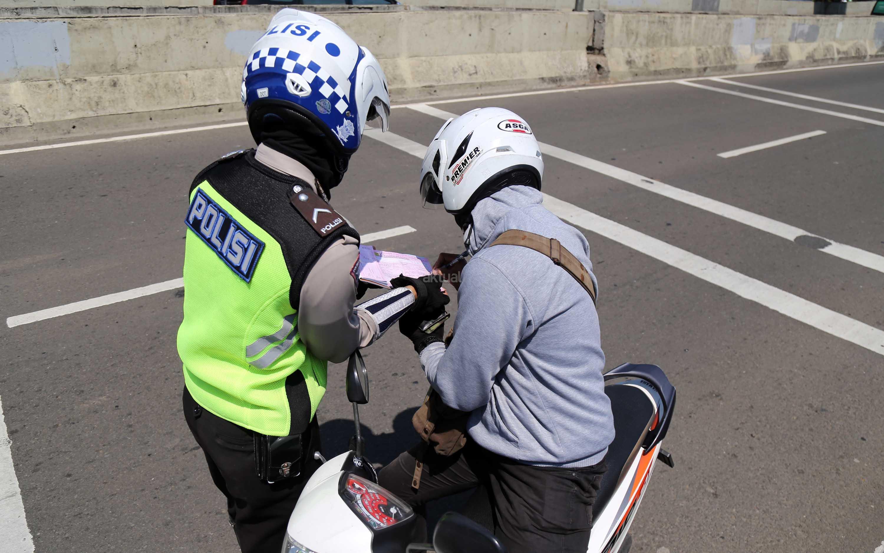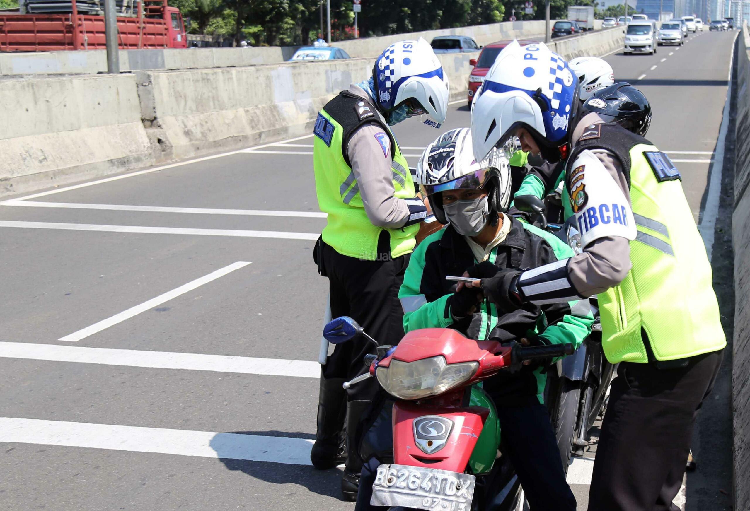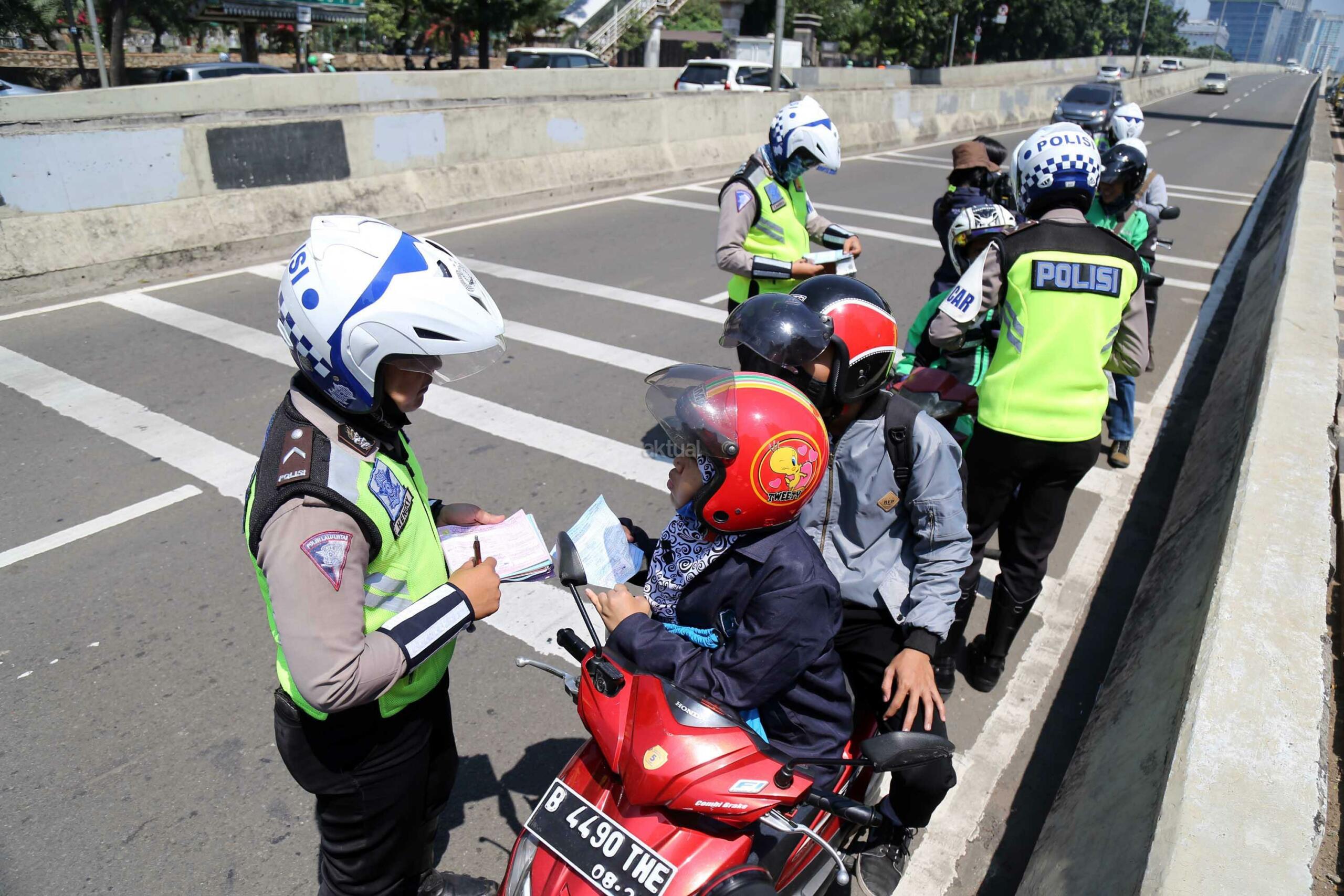 Satuan Tibcar Polda Metro Menilang Pengendara Sepeda Motor yang Melintasi JLNT
