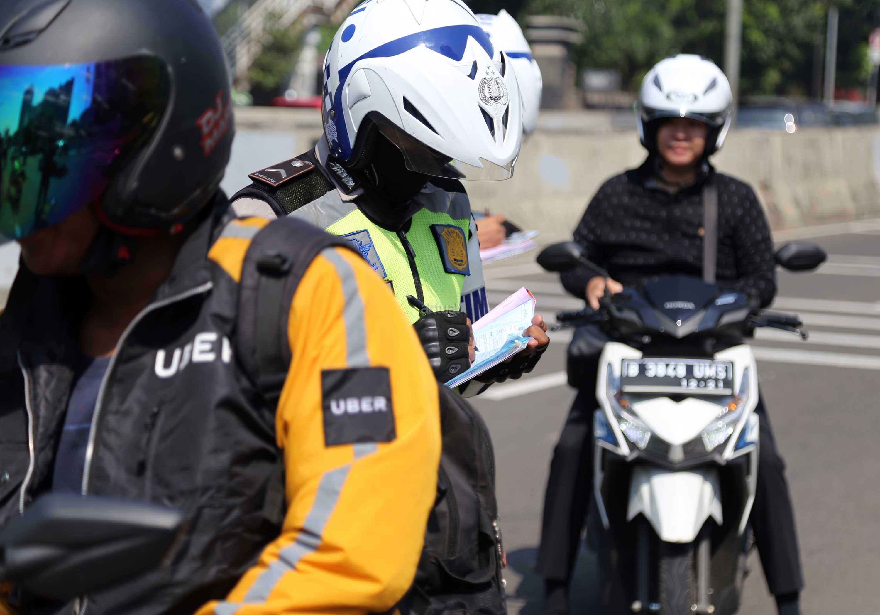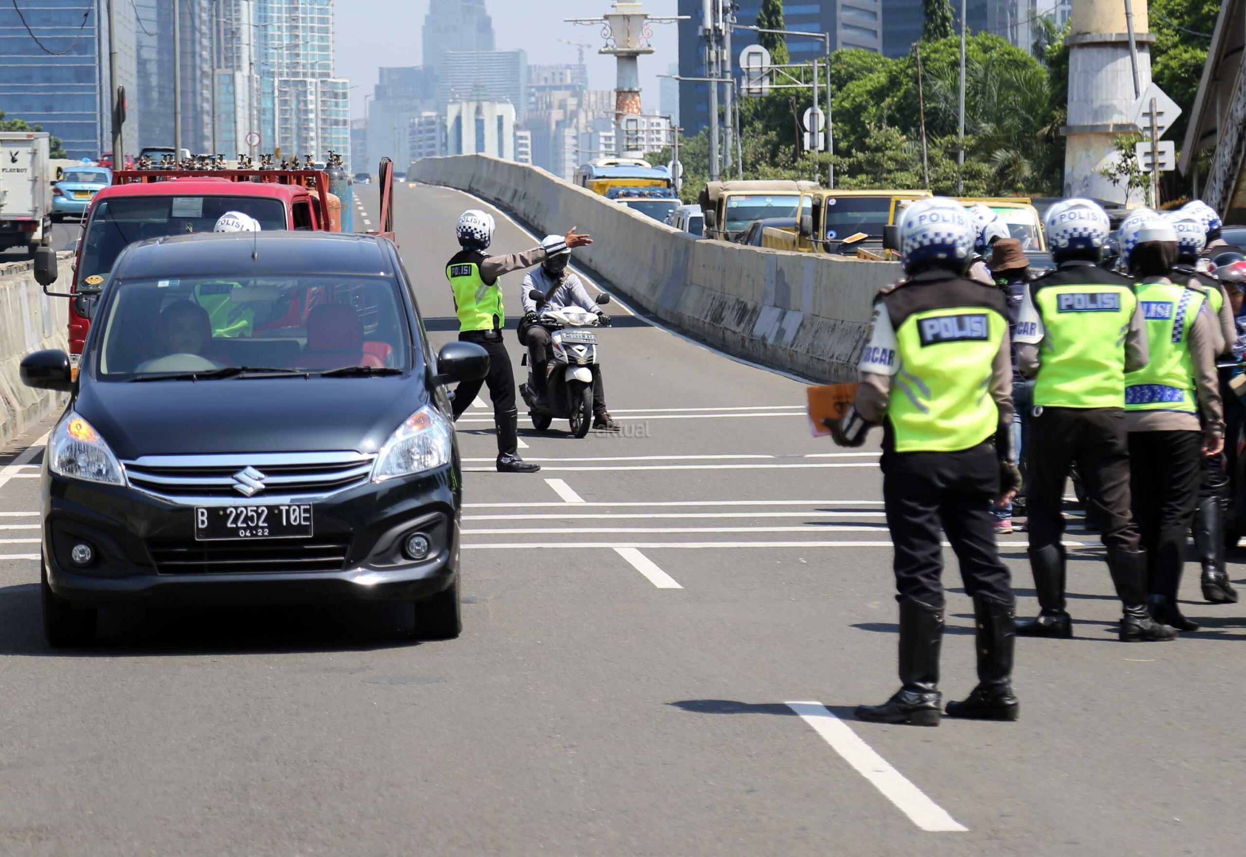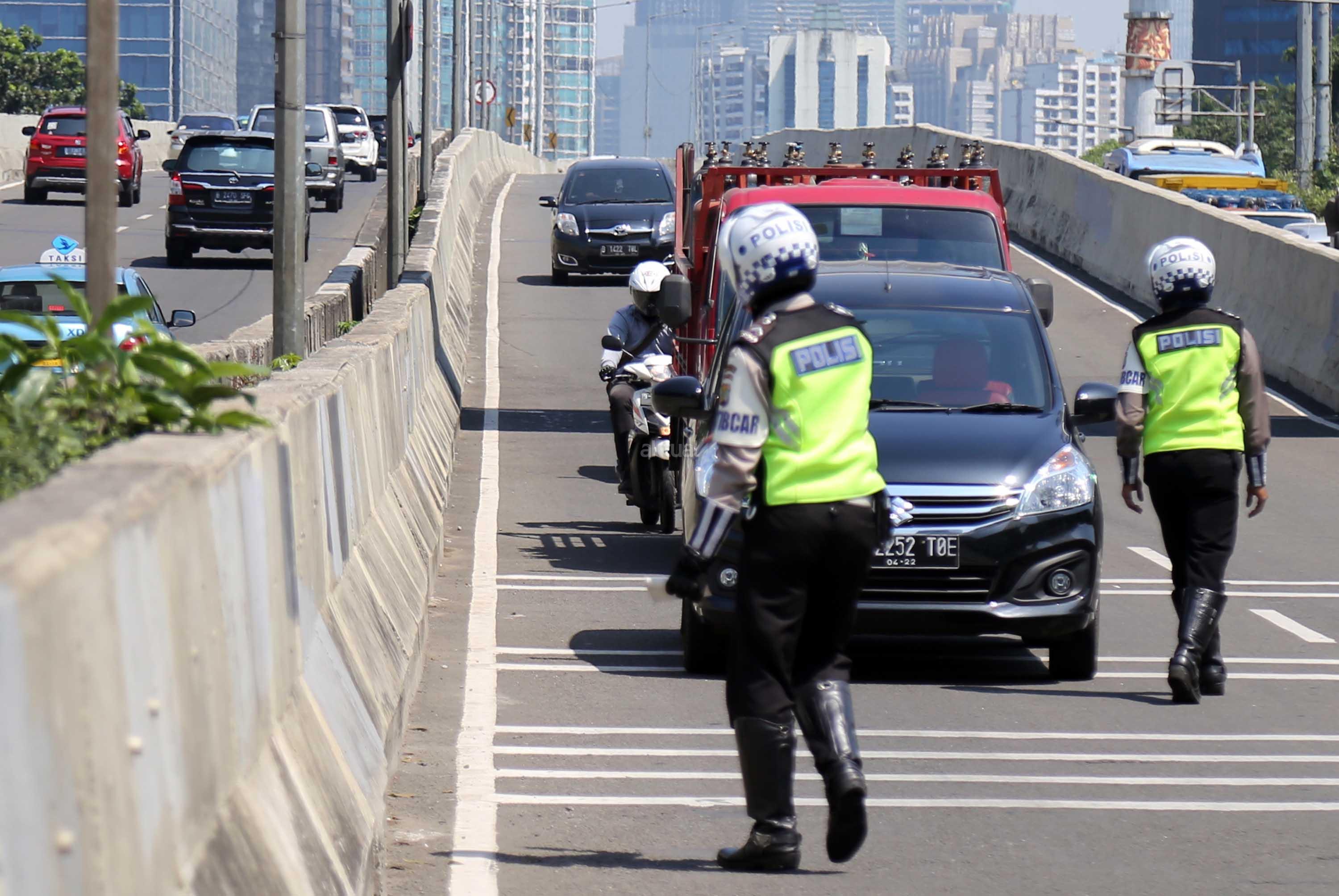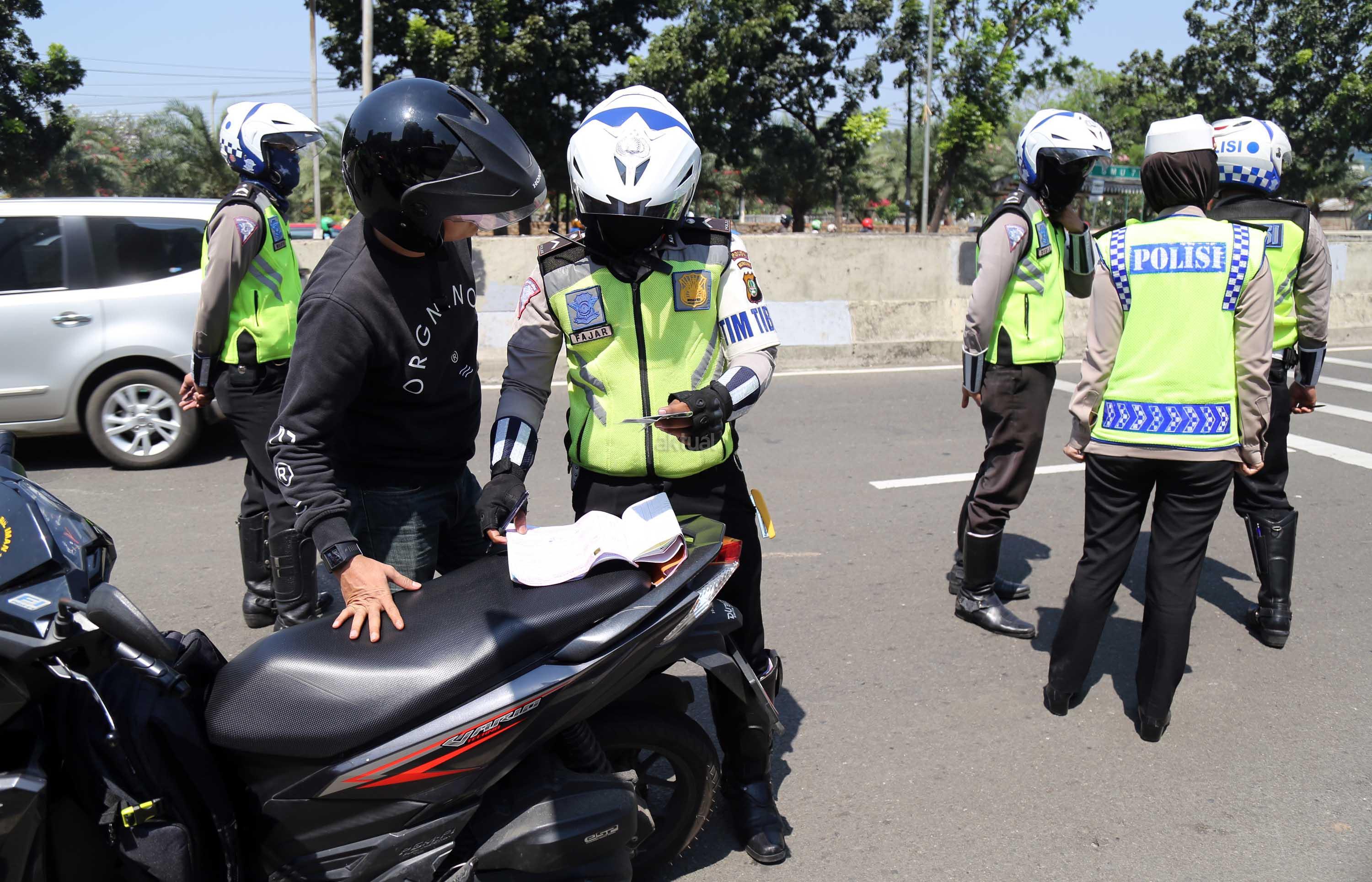 Petugas Satuan Ketertiban dan Kelancaran (Tibcar) lalu lintas Polda Metro Jaya melakukan razia terhadap pengendara sepeda motor yang melintasi Jalan Layang Non Tol Casablanca, Jakarta Selatan, Rabu (26/7). Razia dilakukan untuk membuat jalan layang itu steril dari para pengendara sepeda motor. AKTUAL/Tino Oktaviano