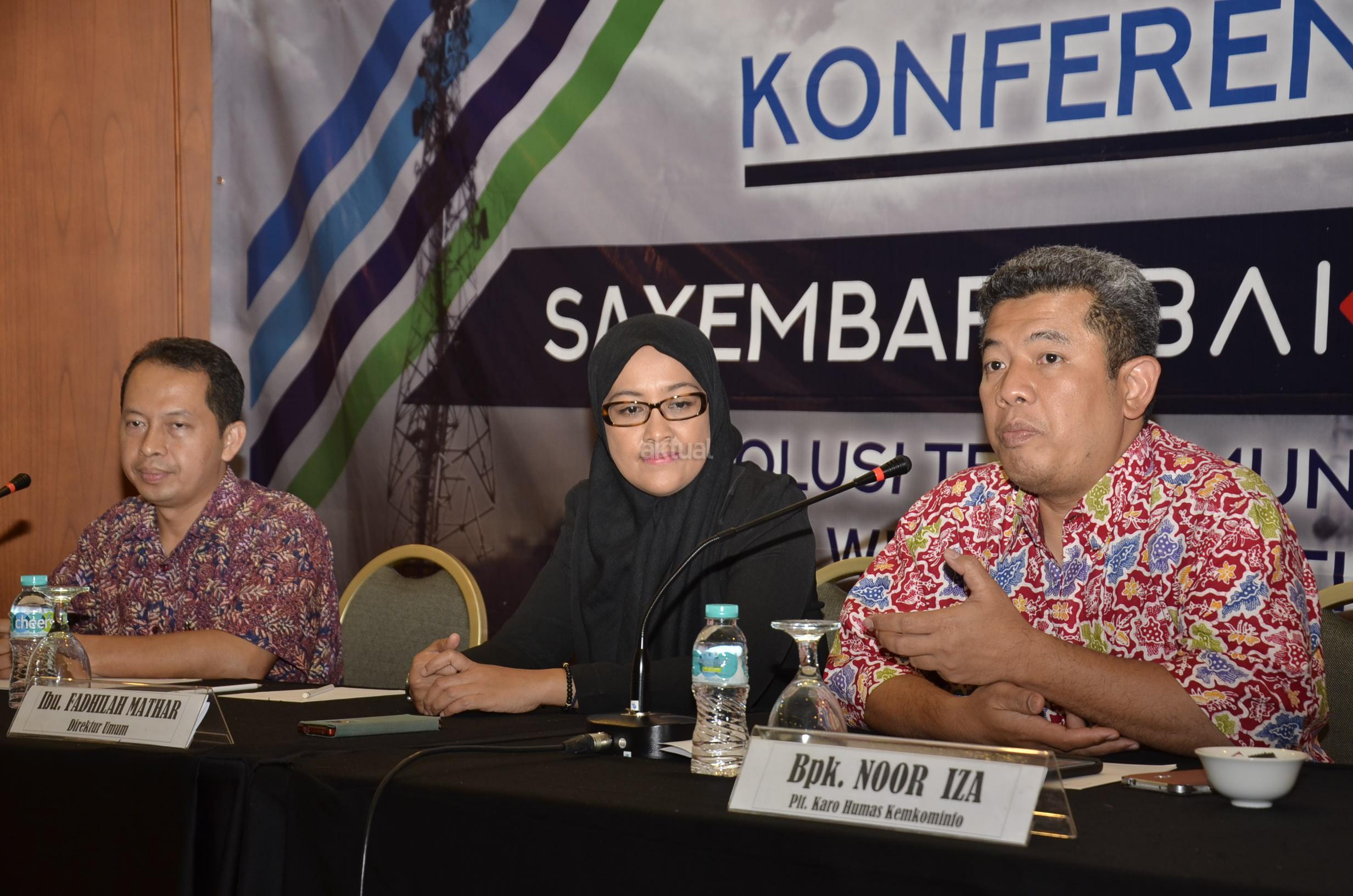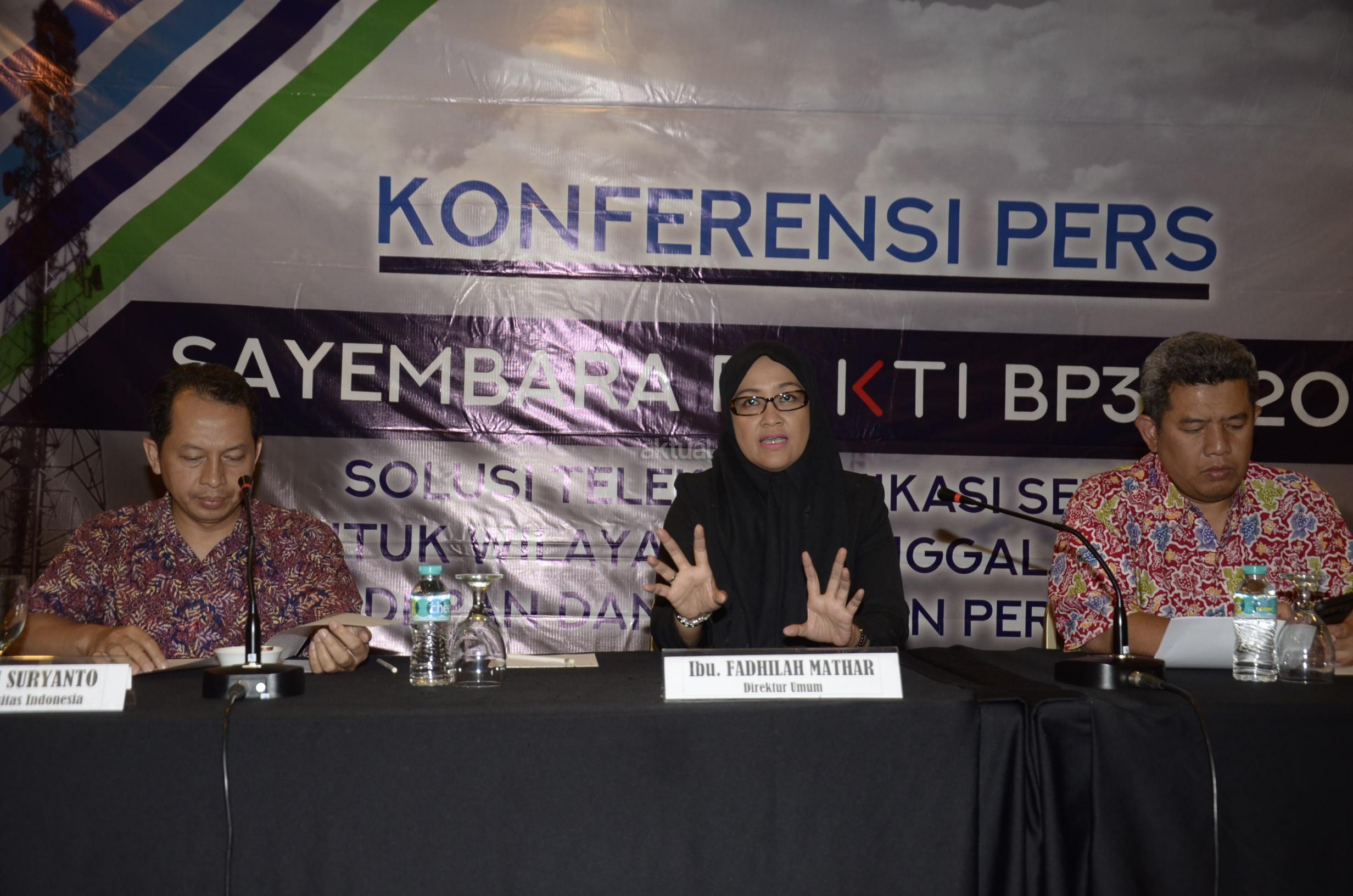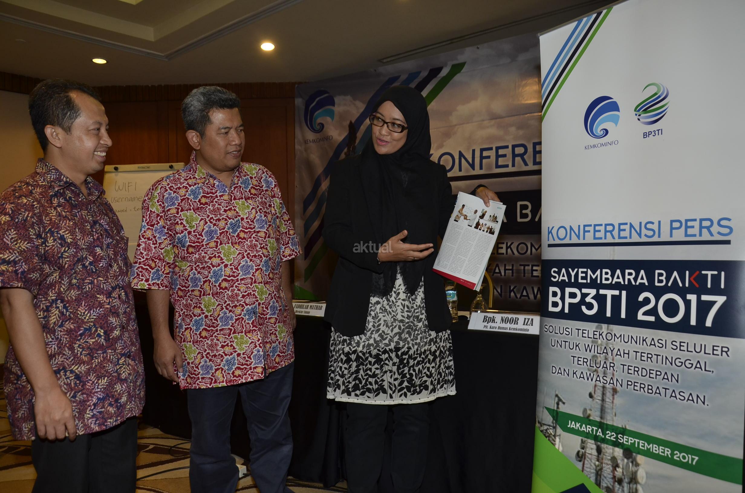 Dari kiri ke kanan, Konsultan Universitas Indonesia Yohan Suryanto, Plt Karo Humas Kemeninfo Noor Iza dan Direktur Umum BP3TI Fadhilah, berbincang usai menggelar konferensi pers digelarnya Sayembara Solusi Telekomunikasi Seluler untuk wilayah Tertinggal, Terdepan, Terluar dan kawasan perbatasan Indonesia di Jakarta, Jumat (22/9). Penyelenggaraan sayembara ini untuk mendapatkan konsep solusi pemanfaatan atau optimalisasi Base Station (BTS) USO di lokasi yang sudah dibangun oleh BP3TI, selain itu sayembara ini diharapkan dapat meningkatkan brand awareness tentang BP3TI terutama mengenai program BTS USO sebagai sistem jaringan telekomunikasi seluler untuk wilayah tertinggal, terdepan, terluar, dan kawasan perbatasan Indonesia dengan membuka sebesar-besarnya partisipasi publik, akademisi dan pegiat telekomunikasi. AKTUAL/Tino Oktaviano