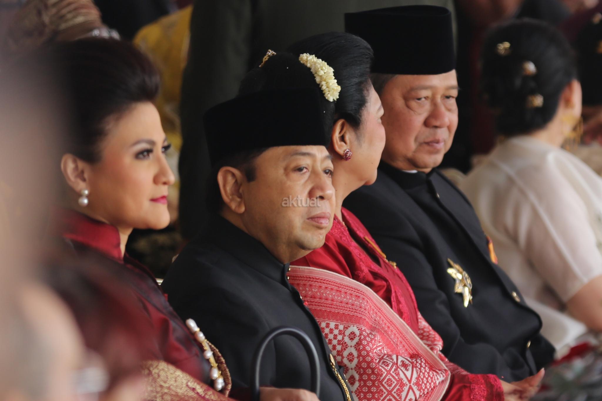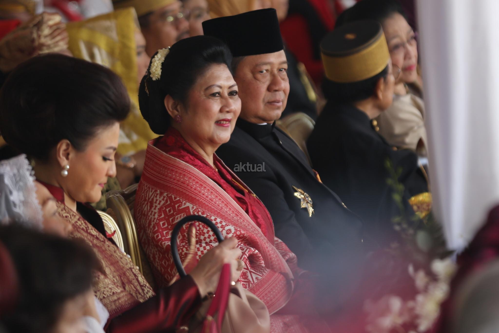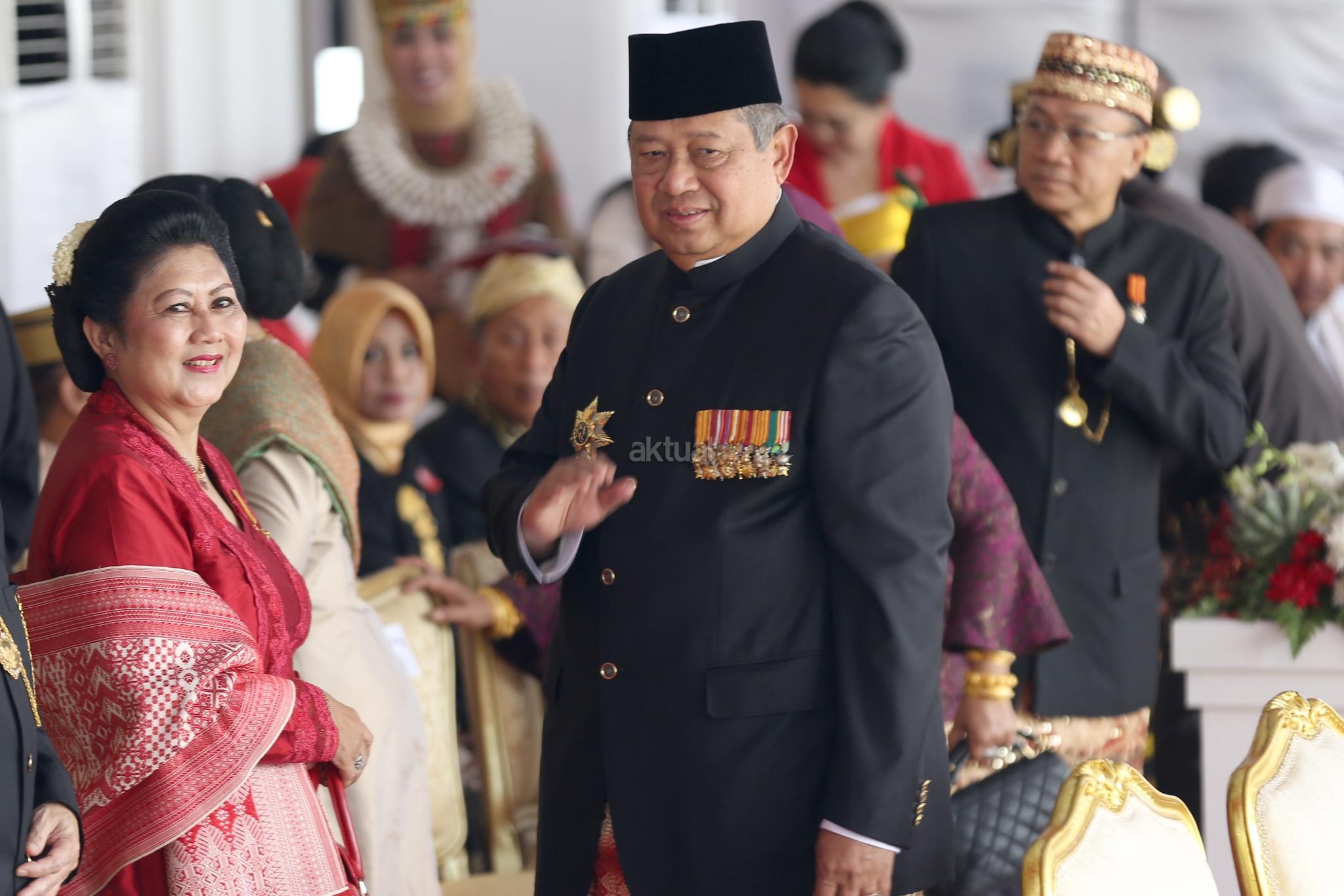 Presiden RI ke 6 Susilo Bambang Yudhoyono didampingi Ibu Ani Yudhoyono saat HUT RI ke-72 di Istana Merdeka, Jakarta, Kamis (17/8). SBY datang bersama Ibu Ani Yudhoyono mengenakan pakaian adat Melayu dan menyapa para tamu undangan termasuk Presiden RI ke 5 Megawati Soekarnoputri. AKTUAL/Stringer/Chicarito