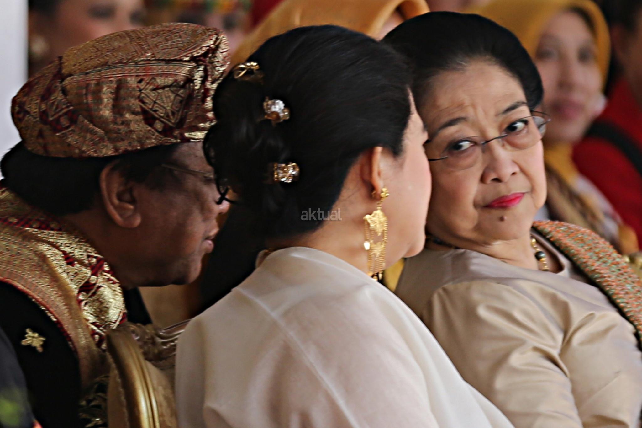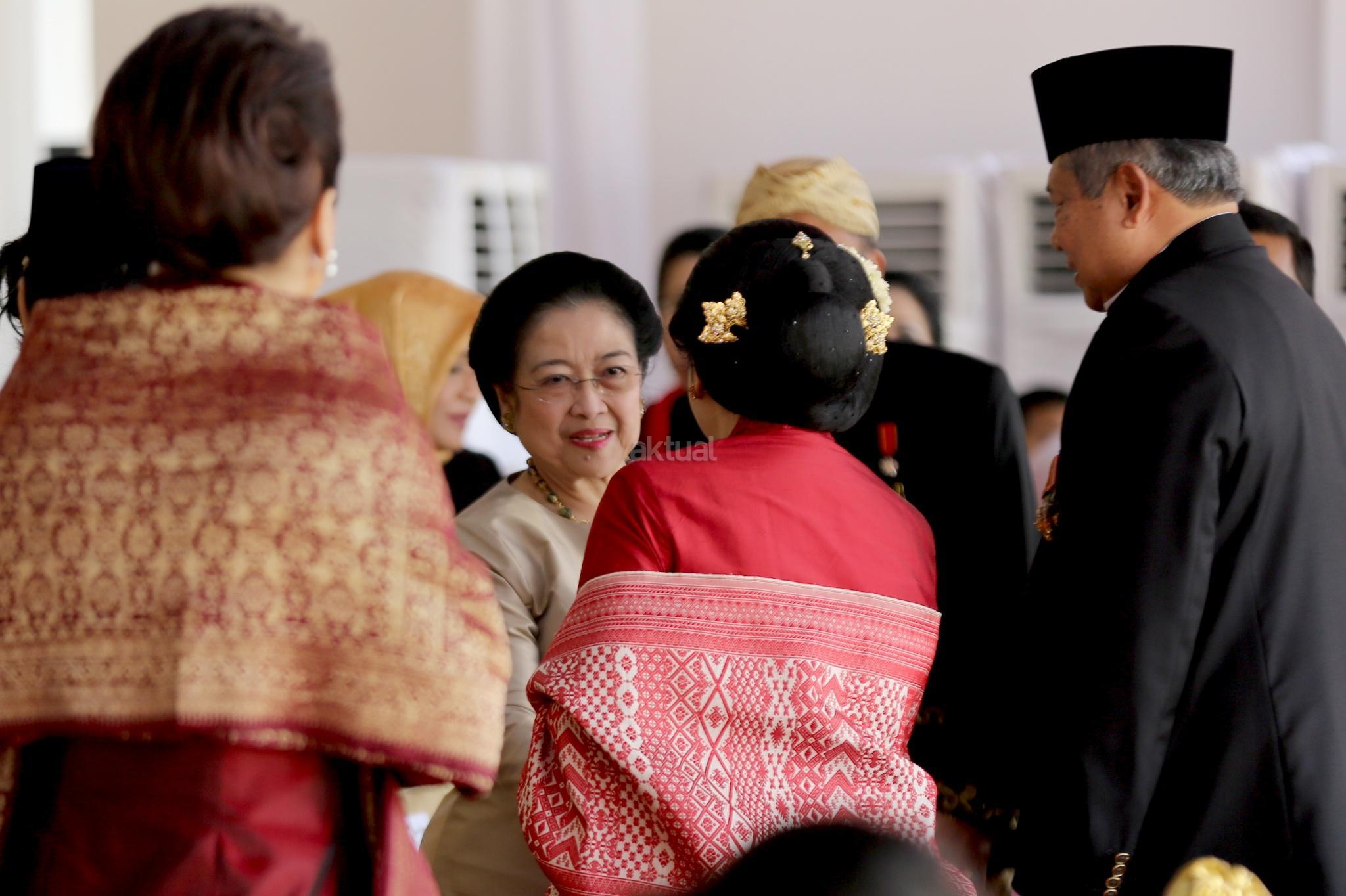 Presiden RI ke-5 Megawati berbinxang dengan Presiden RI ke 72, Susilo Bambang Yudhoyono beraalaman dengan Presiden RI 5 Megawato saat menghadiri upacara peringatan HUT RI ke-72 di Istana Merdeka, Jakarta, Kamis (17/8). SBY datang bersama Ibu Ani Yudhoyono mengenakan pakaian adat Melayu dan menyapa para tamu undangan termasuk Presiden RI ke 5 Megawati Soekarnoputri. AKTUAL/Stringer/Chicarito