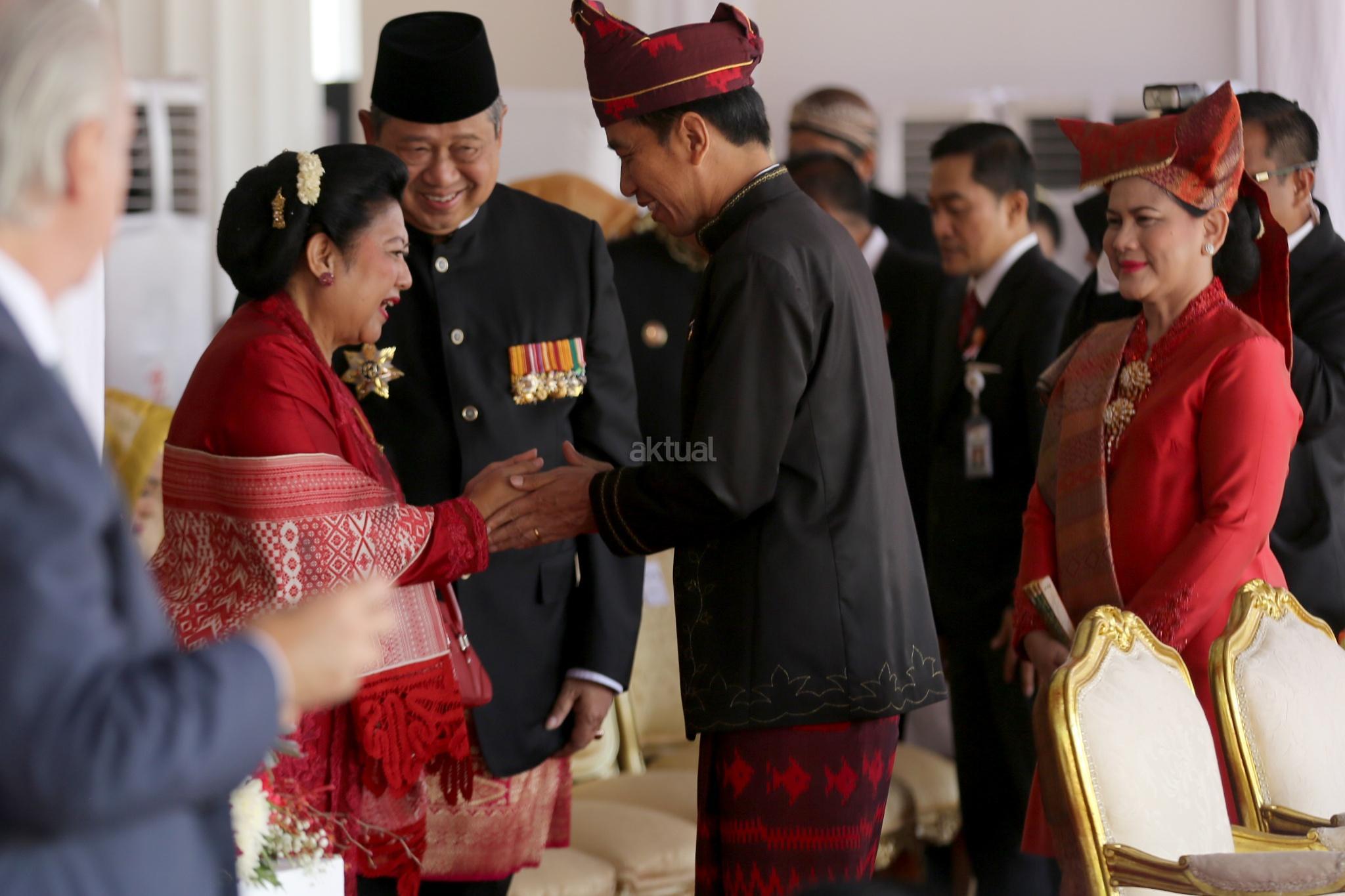 Presiden RI ke-6, Susilo Bambang Yudhoyono beraalaman dengan Presiden RI Joko Widodo saat menghadiri upacara peringatan HUT RI ke-72 di Istana Merdeka, Jakarta, Kamis (17/8). SBY datang bersama Ibu Ani Yudhoyono mengenakan pakaian adat Melayu dan menyapa para tamu undangan termasuk Presiden RI ke 5 Megawati Soekarnoputri. AKTUAL/Stringer/Chicarito